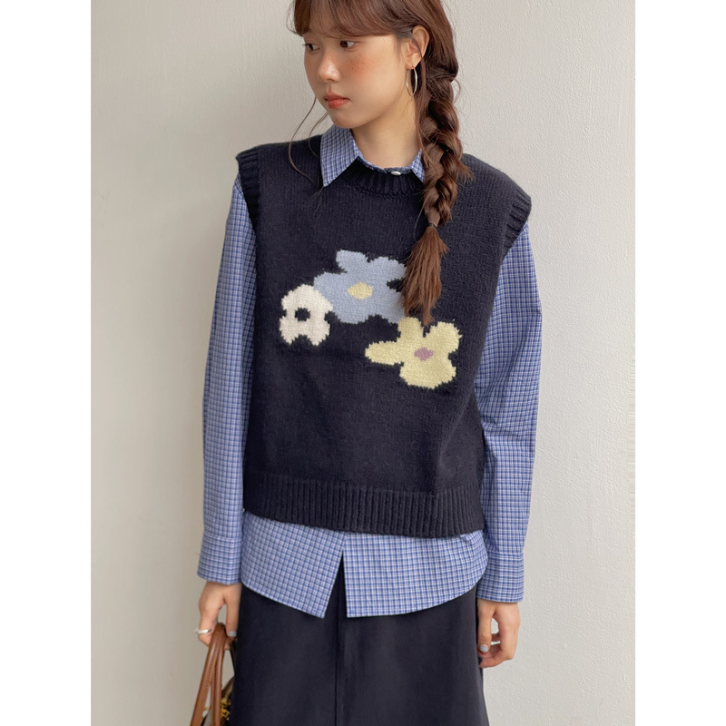 [꽃과 가을] Ge Ming 디자인 라운드 넥 플라워 니트 조끼 여성 민소매 레이어드 탑 N133B
