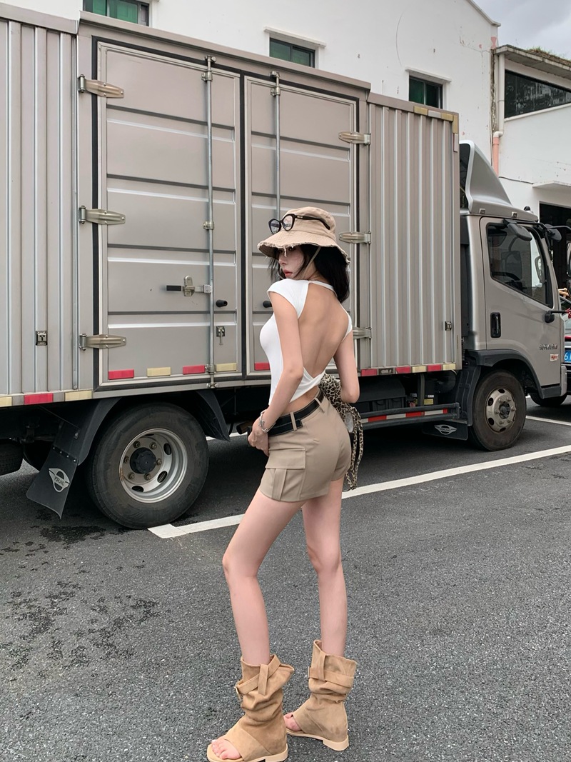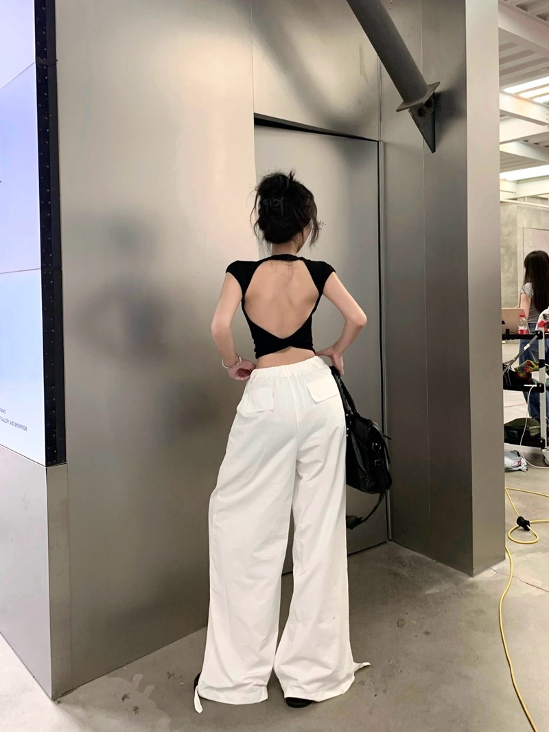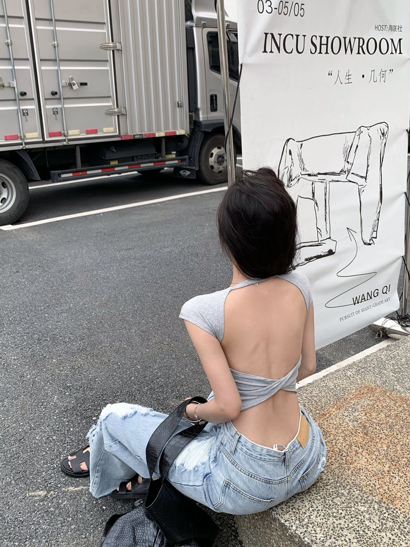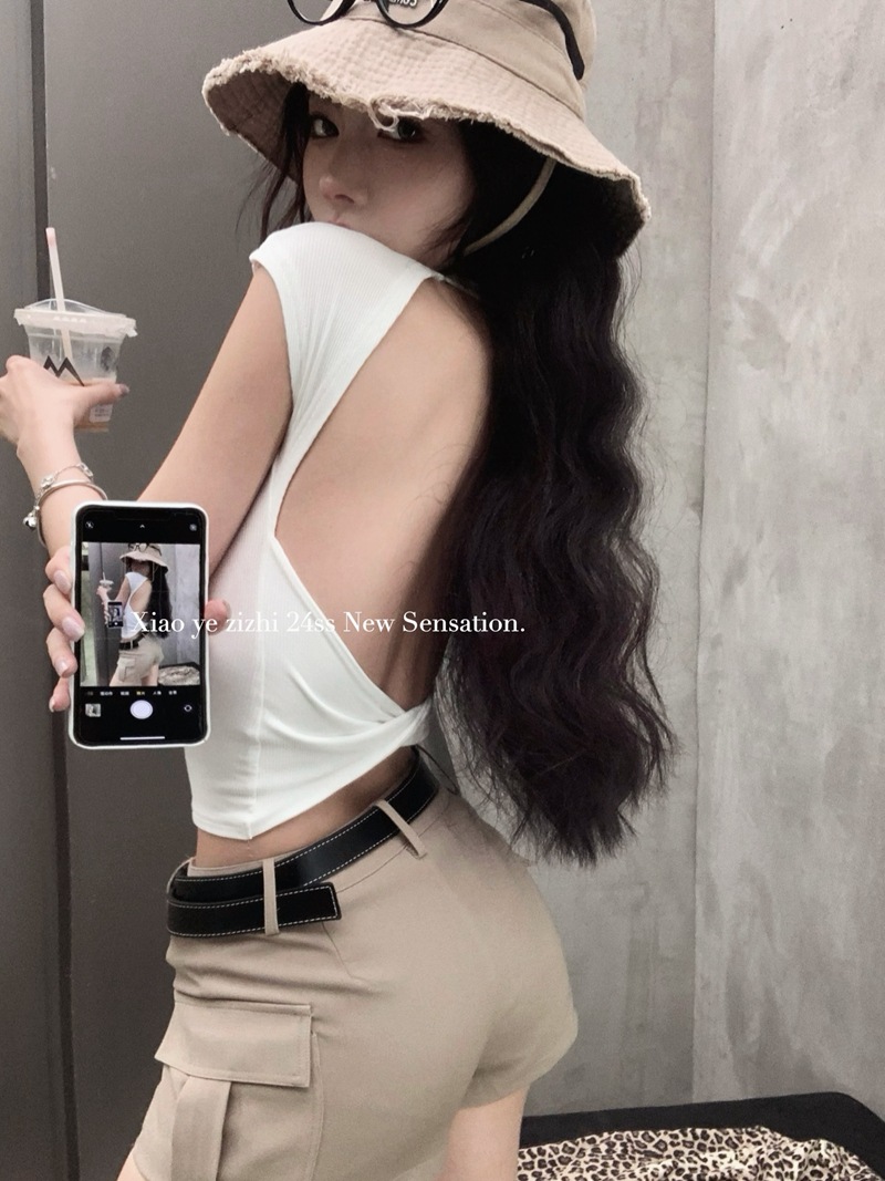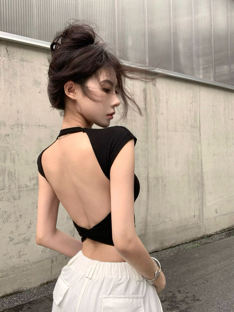 크로스 할로우 백 반팔 티셔츠 여성용 여름 순수한 욕망 스파이스 걸스 섹시한 백리스 짧은 어깨 탑 슈퍼 요정과 아름다운스토어 가기