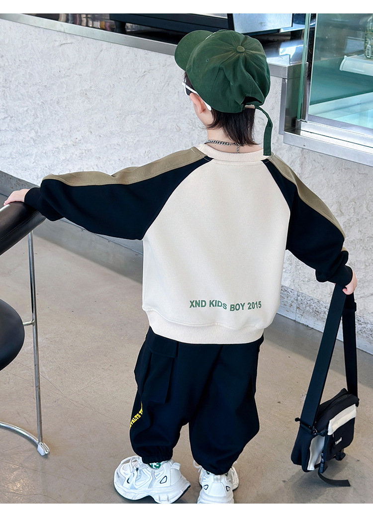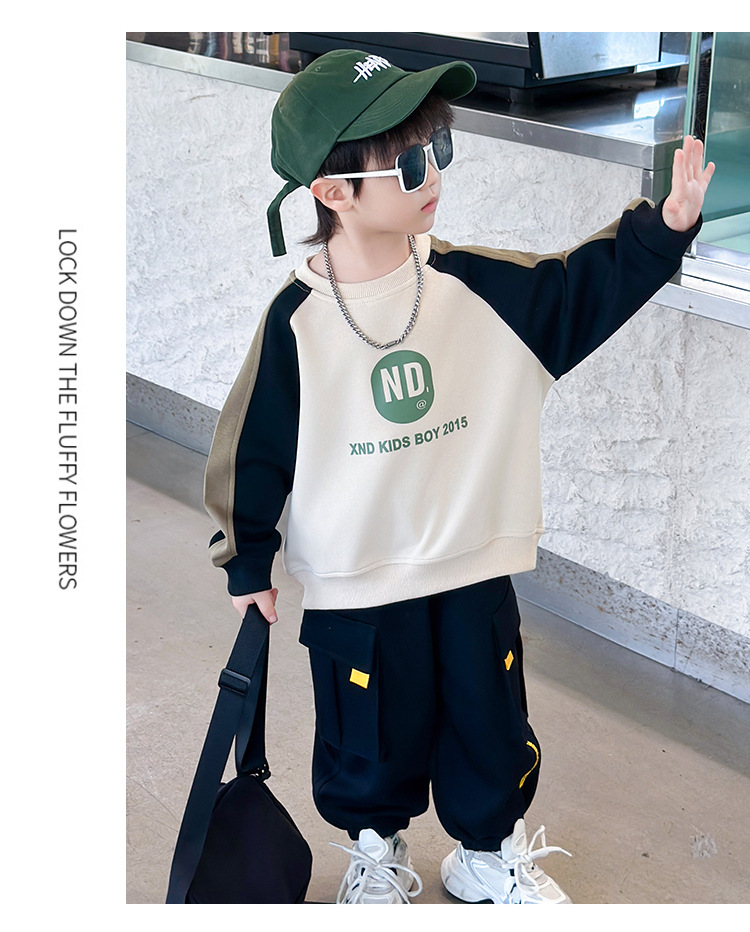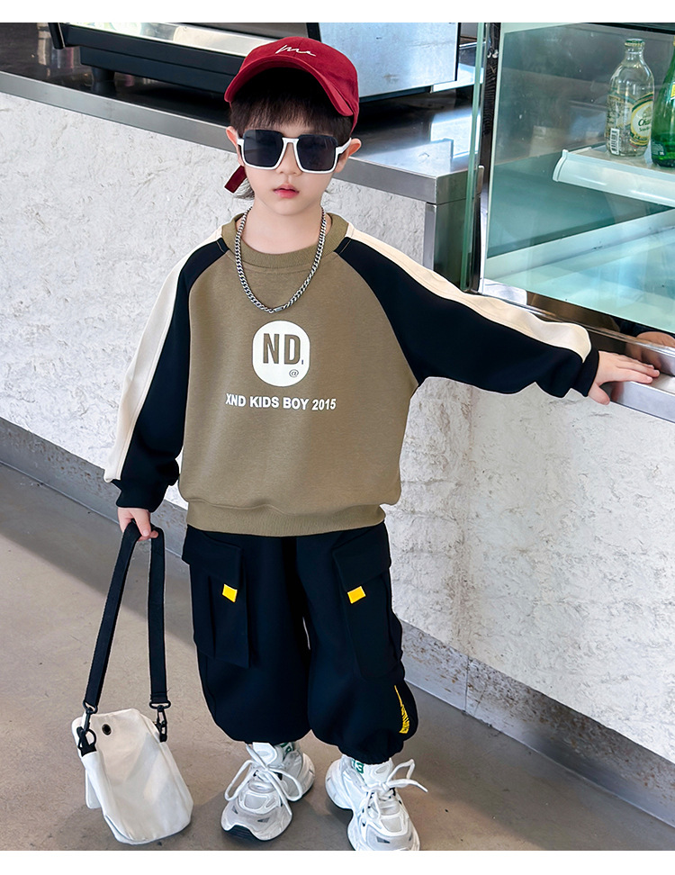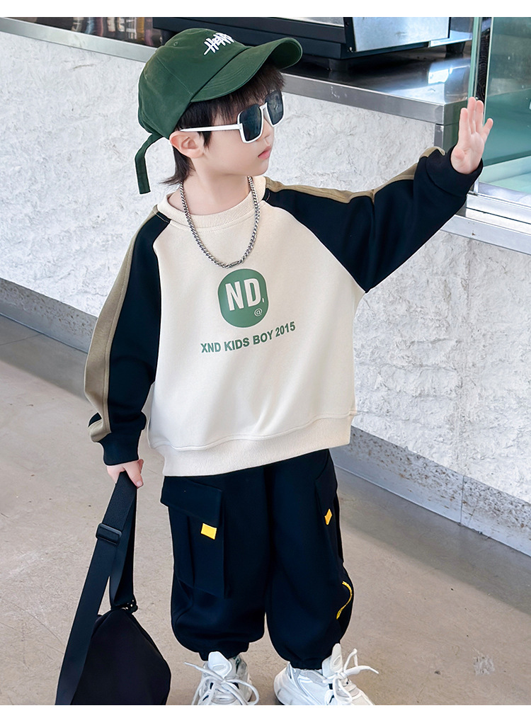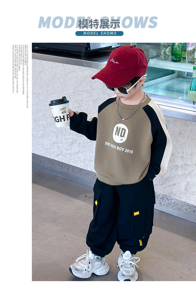 소년의 봄과 가을 컬러 매칭 스웨트 셔츠 세트 2024 새로운 어린이 잘 생긴 캐주얼 투피스 세트 어린이 서양식 옷스토어 가기