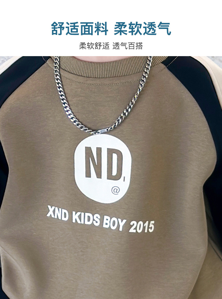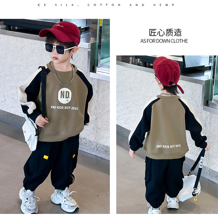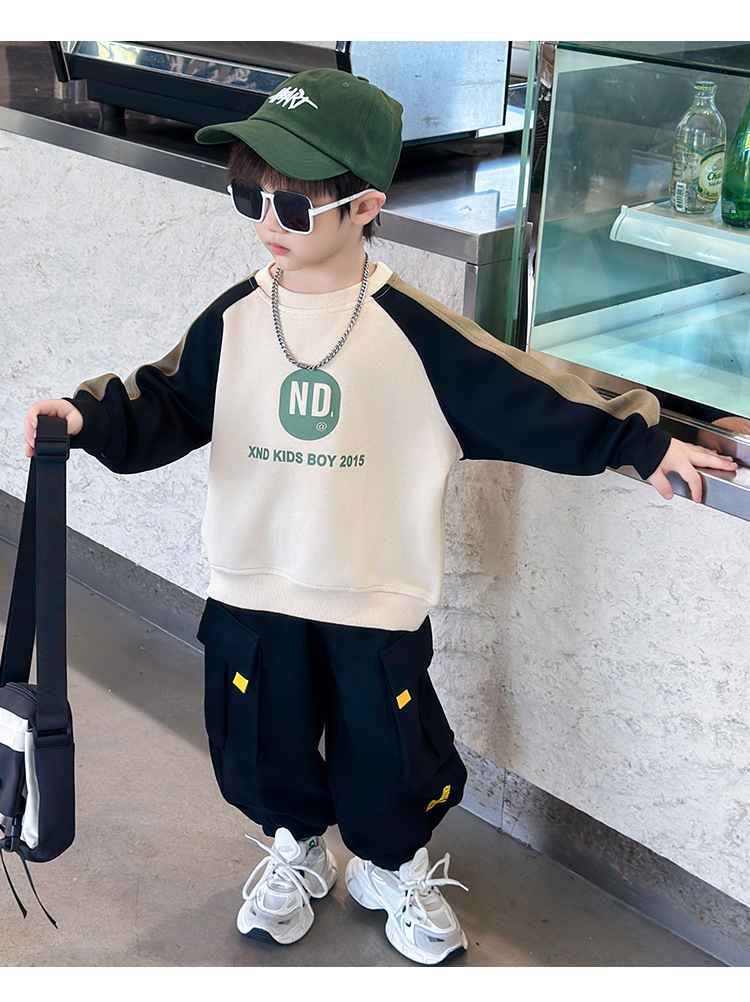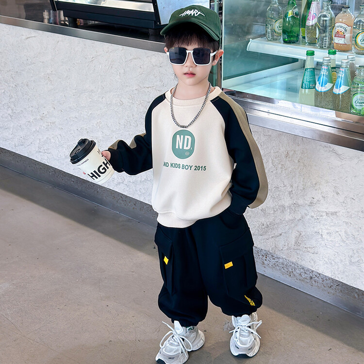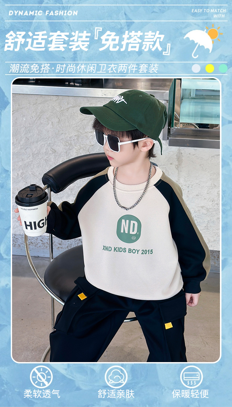 소년의 봄과 가을 컬러 매칭 스웨트 셔츠 세트 2024 새로운 어린이 잘 생긴 캐주얼 투피스 세트 어린이 서양식 옷스토어 가기