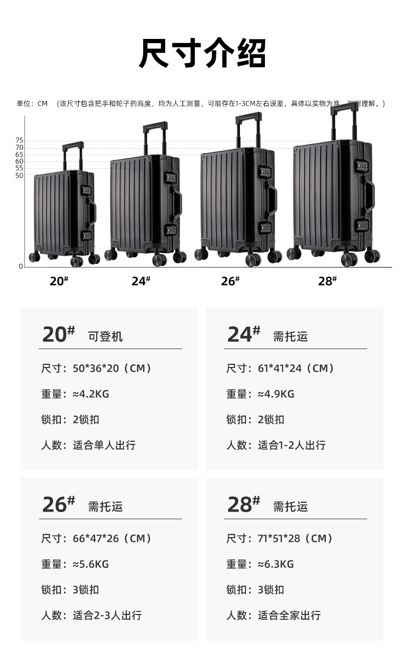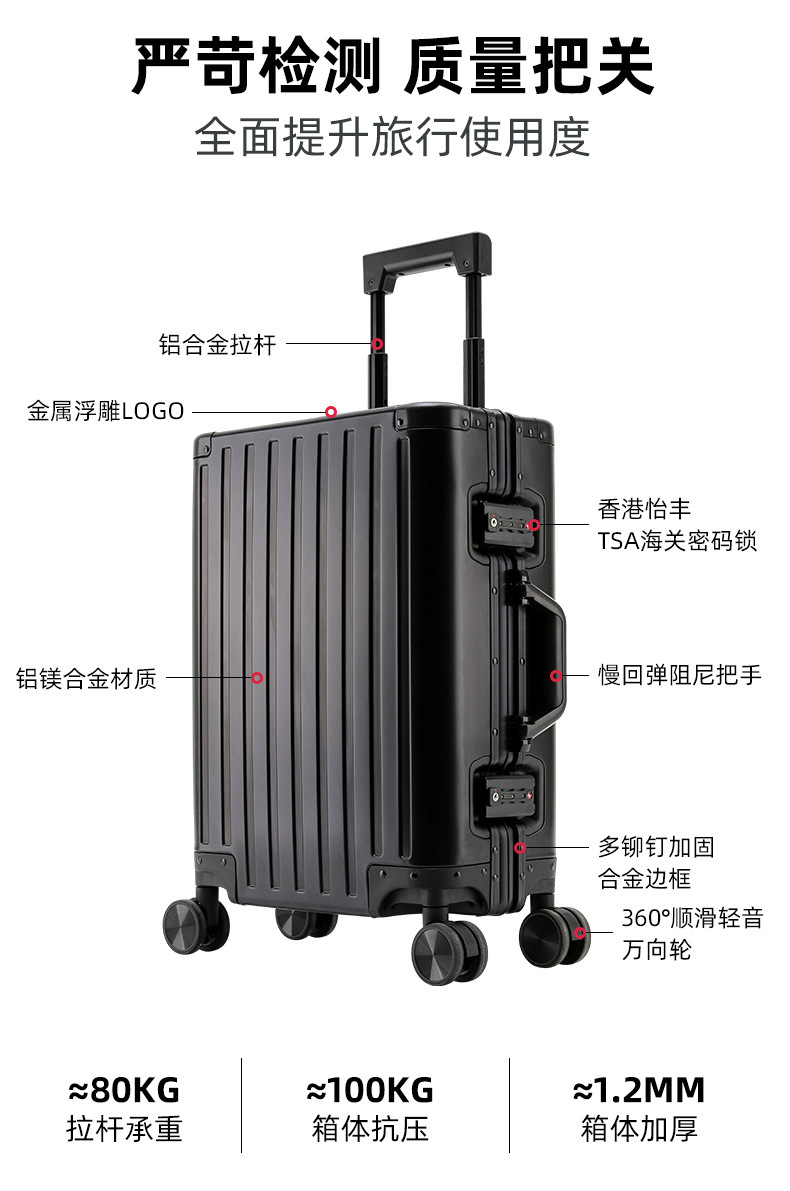 All Aluminum-magnesium Alloy Construction, Aluminum Alloy Bumper Corners And Frame Increase Luggage Strength And Durability To Protect Your Belongings