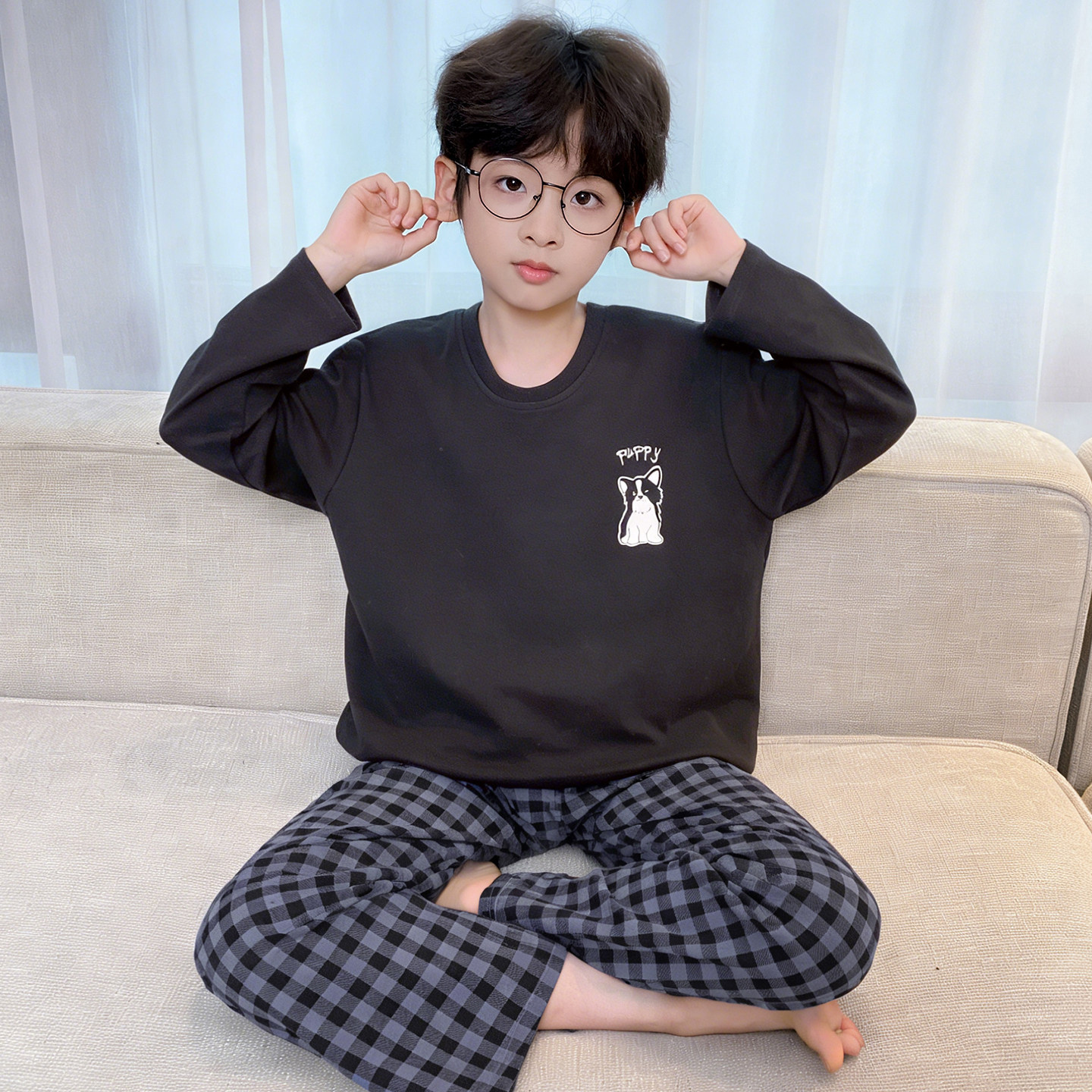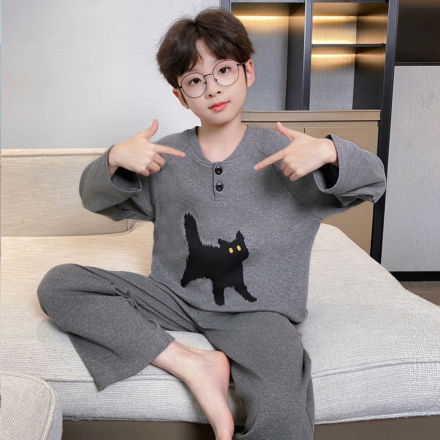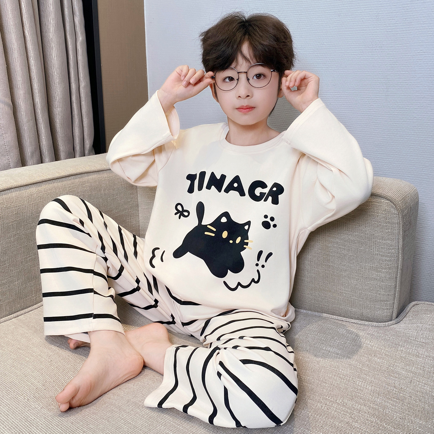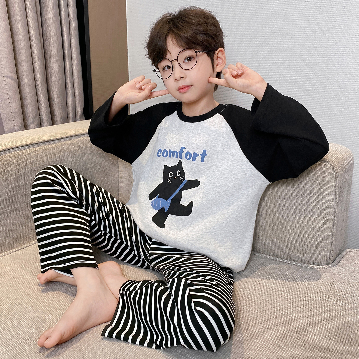 어린이 순면 잠옷 봄과 가을 소년 가정 옷 청소년 가을 긴 소매 중대형 어린이 만화 소년 세트스토어 가기