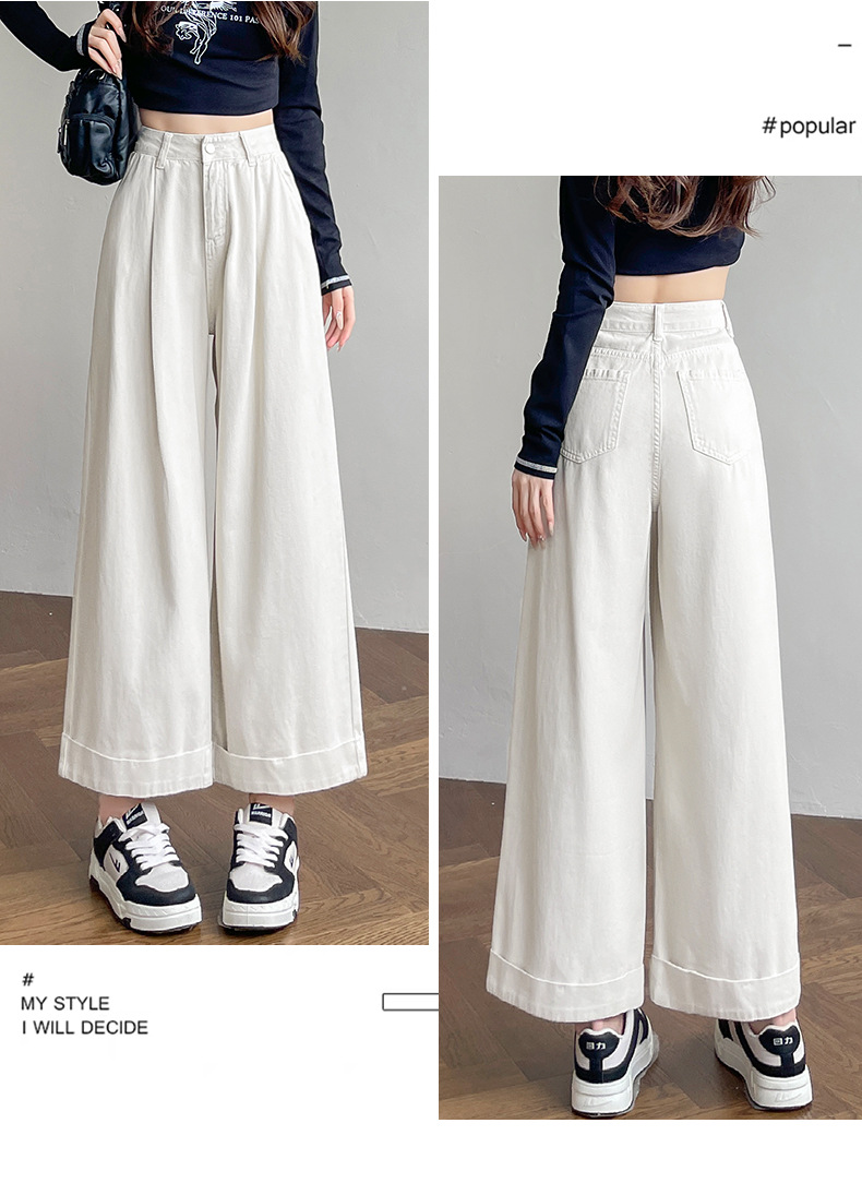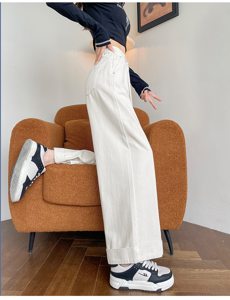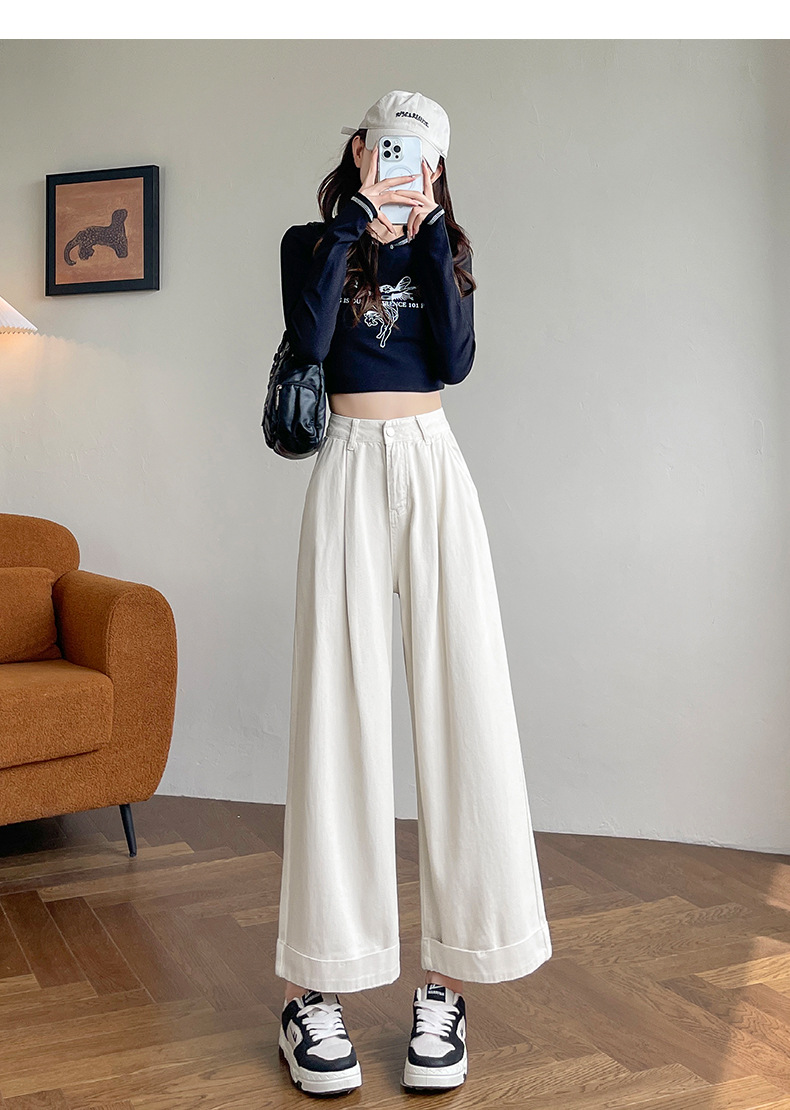 블루 그레이 턴 업 스트레이트 청바지 여성의 2024 년 봄과 가을 새로운 높은 허리 느슨한 넓은 다리 할머니 바지