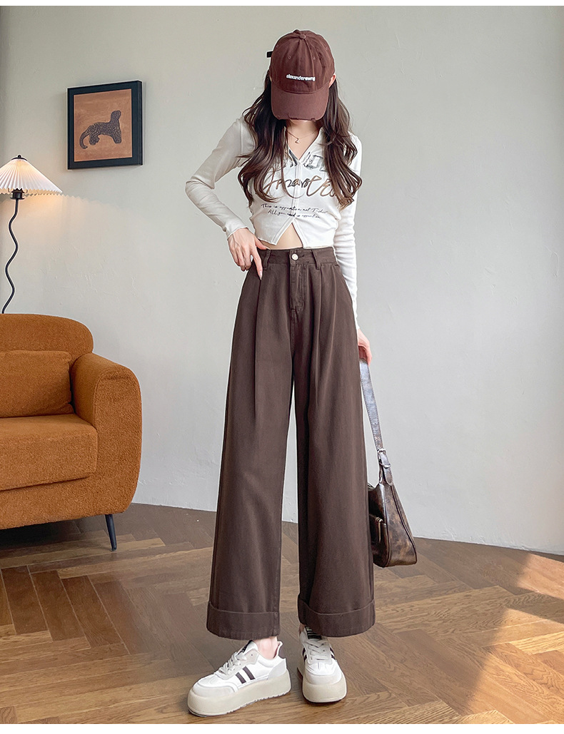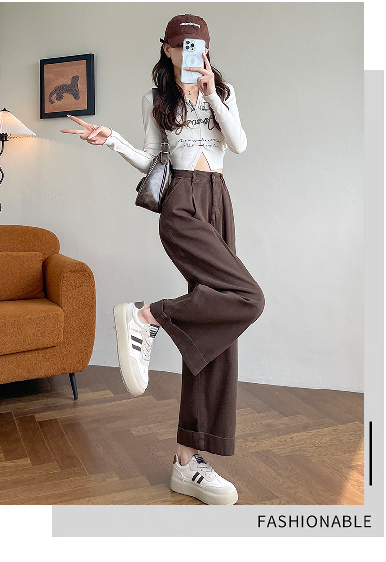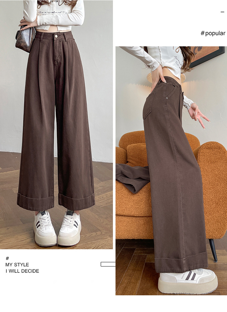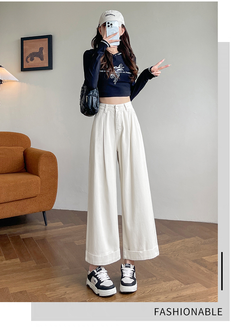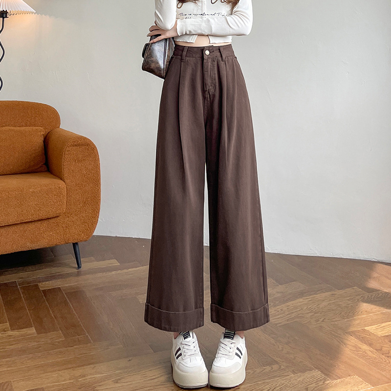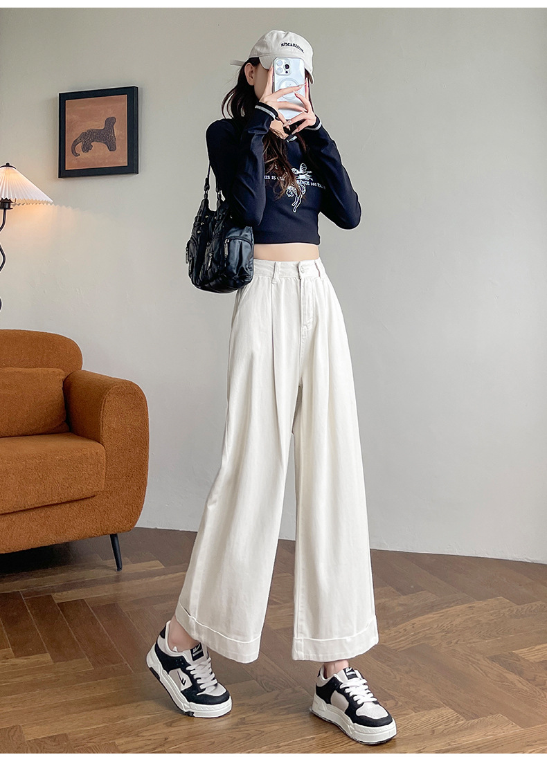블루 그레이 턴 업 스트레이트 청바지 여성의 2024 년 봄과 가을 새로운 높은 허리 느슨한 넓은 다리 할머니 바지스토어 가기