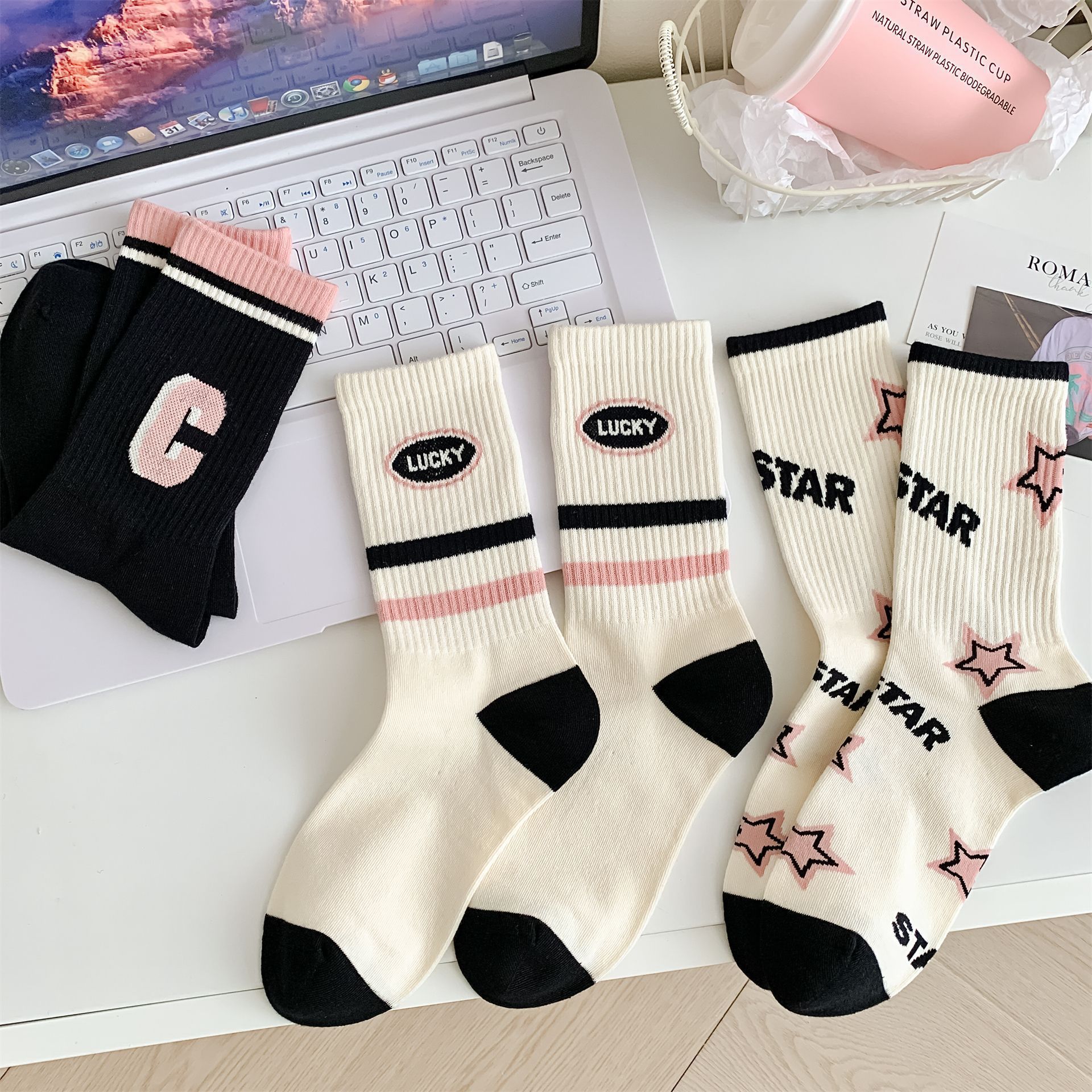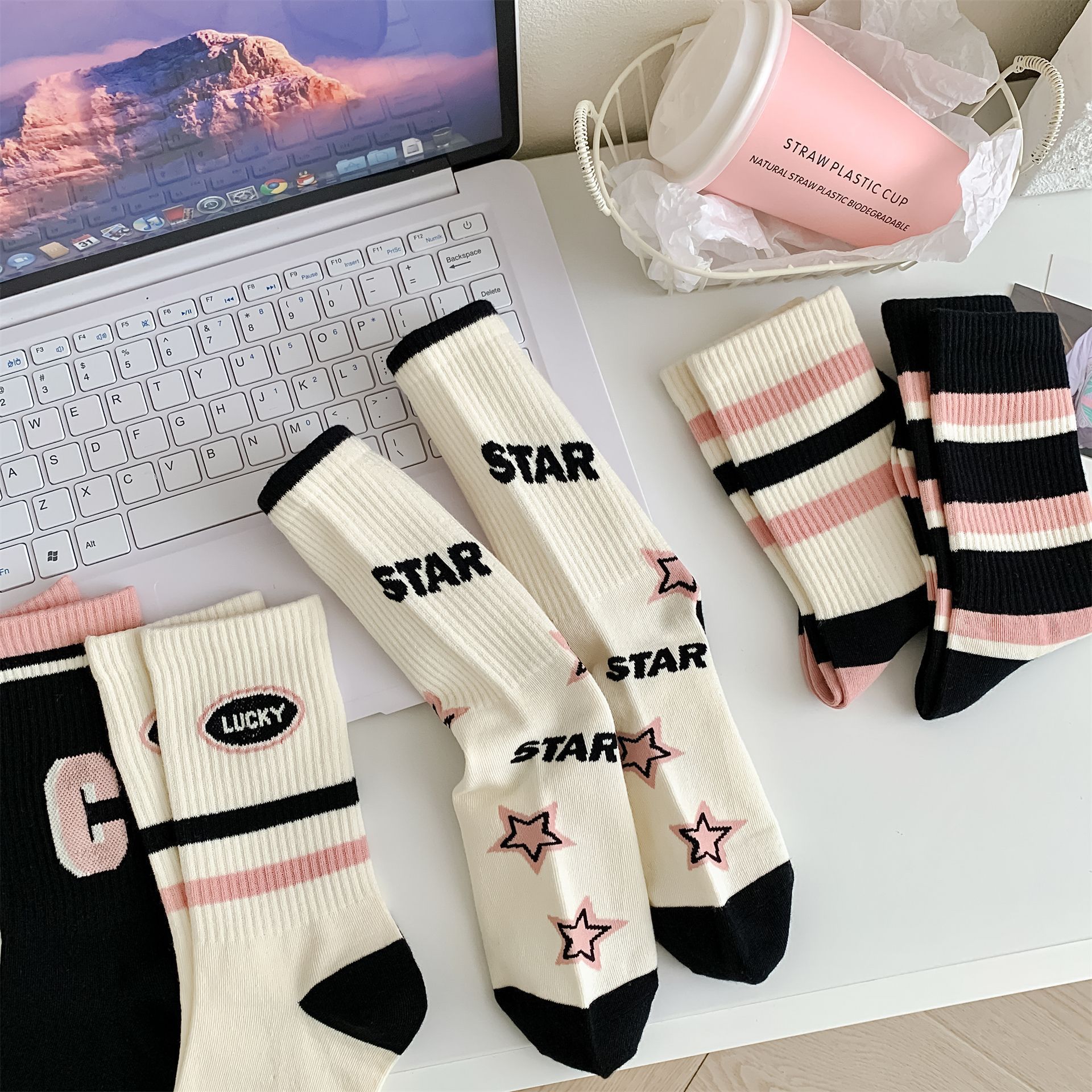 가을 겨울 새로운 뼈없는 양말 여성 양말 검은 핑크 줄무늬 편지 여성 스포츠 양말 Ins 유행 튜브 양말