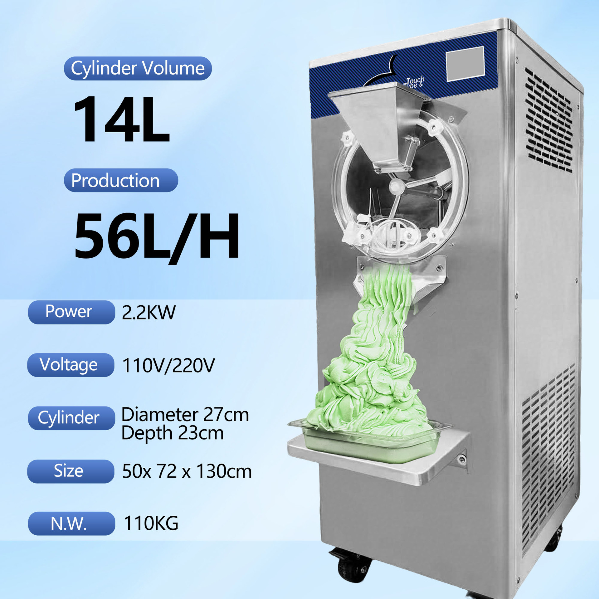 5英寸彩色触摸屏控制,预设5种冰淇淋制作程序,支持一键启动,轻松切换不同口味配方。