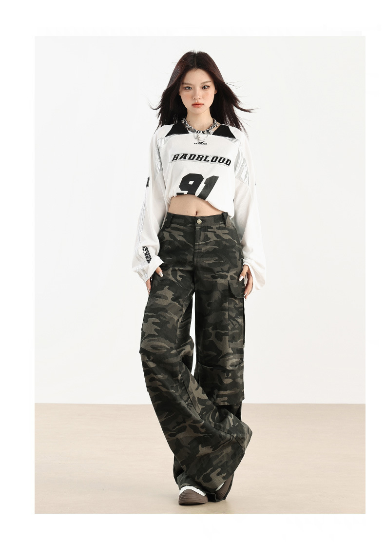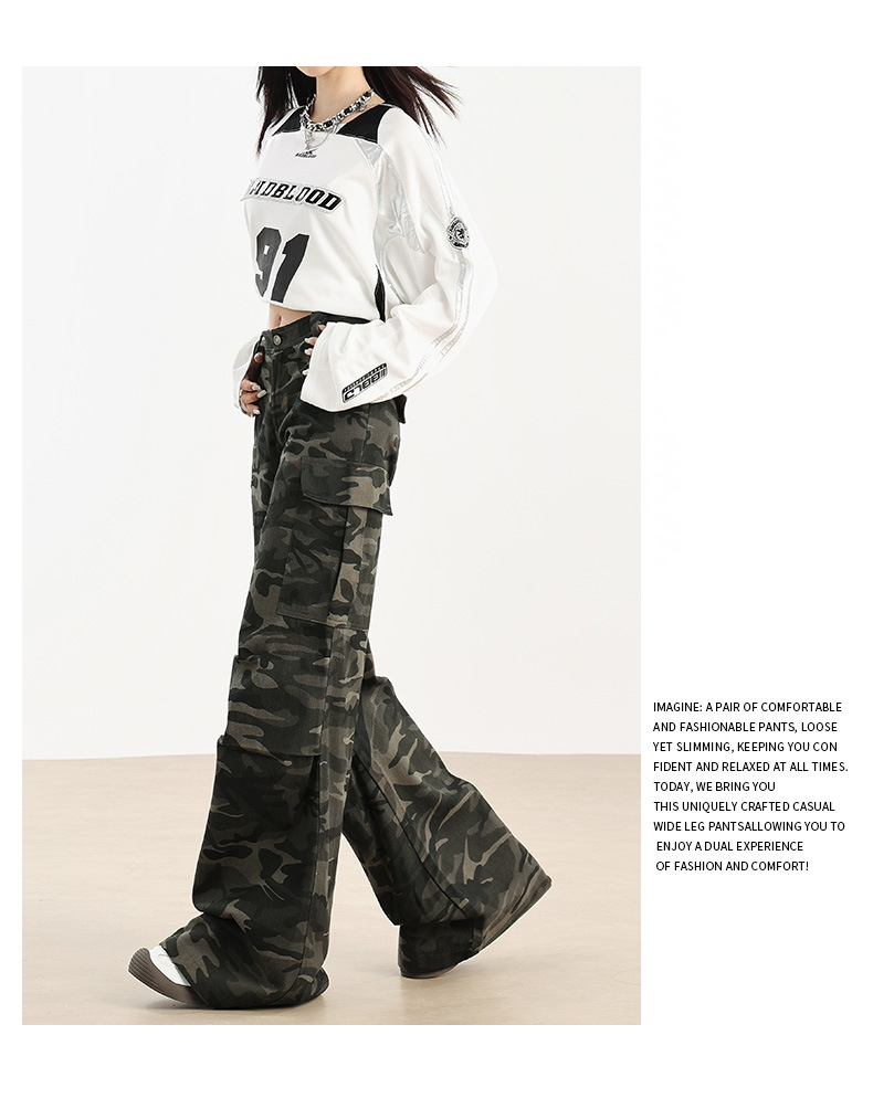 2024년 가을 여성을 위한 아메리칸 핫걸 카모플라주 작업복 청바지 새로운 루즈하고 슬림한 복고풍 하이웨이스트 부츠컷 팬츠