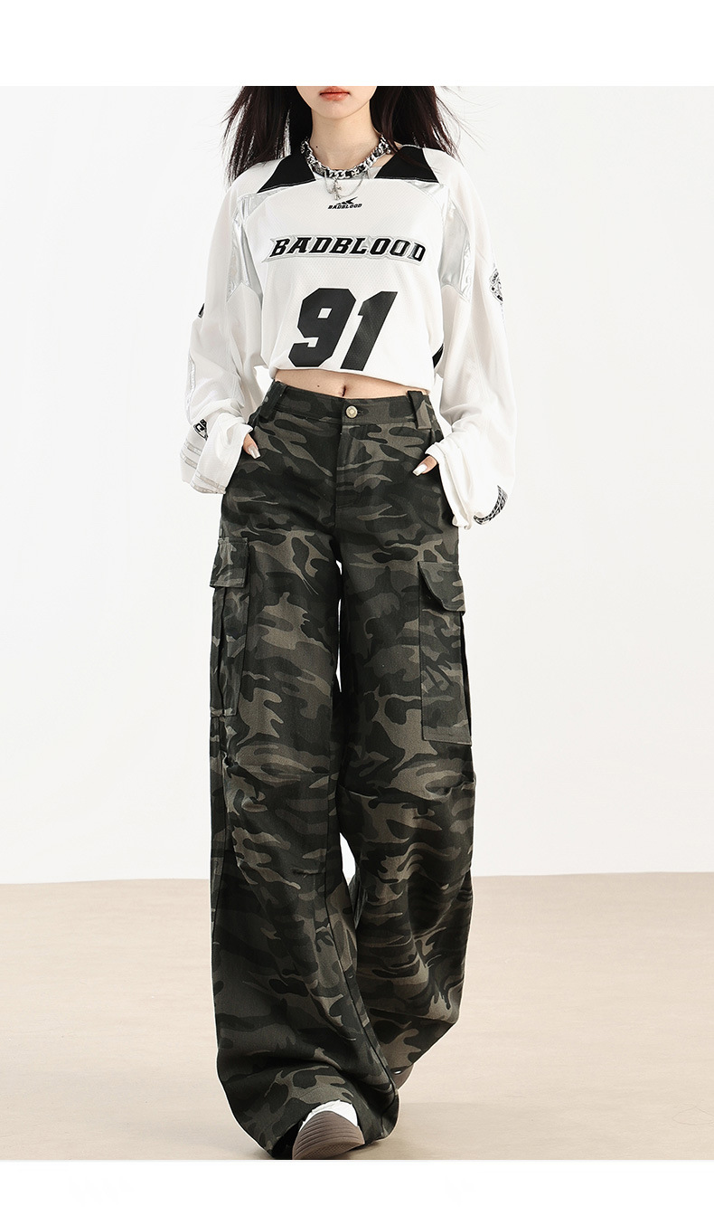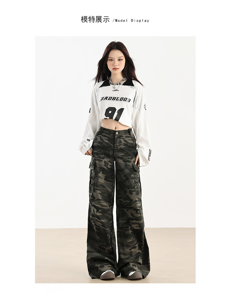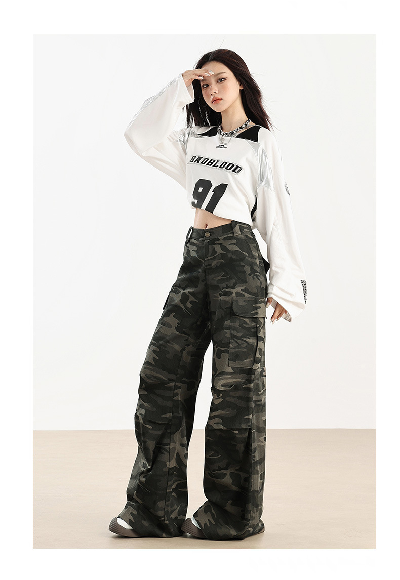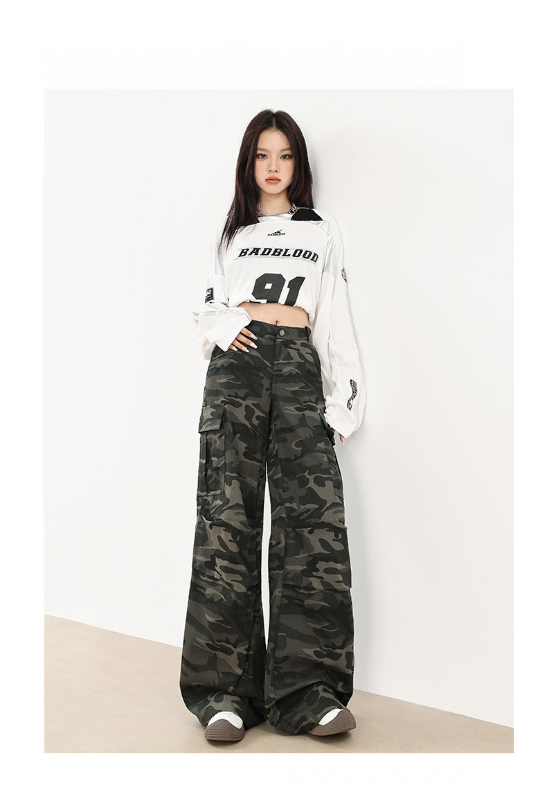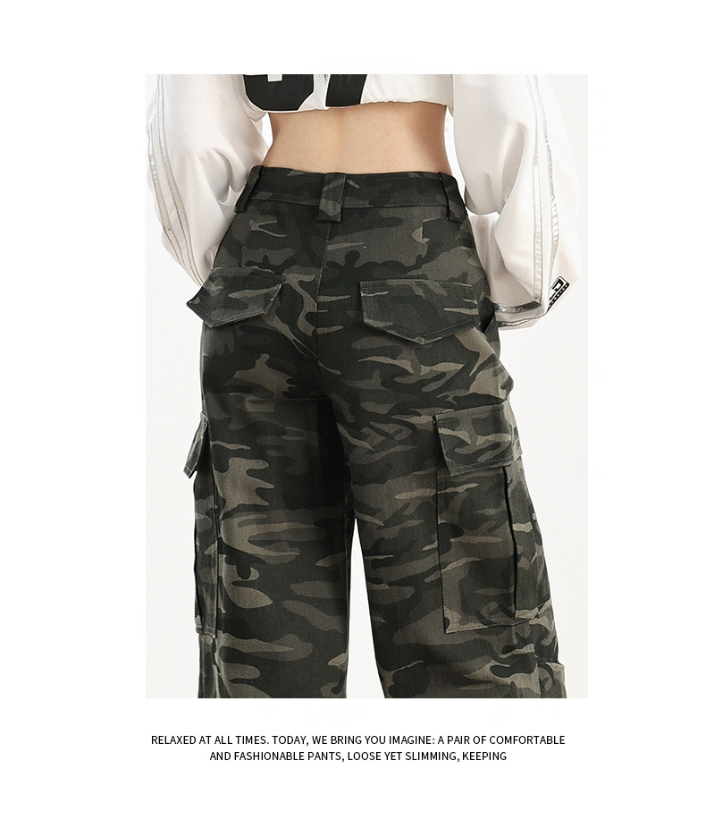 2024년 가을 여성을 위한 아메리칸 핫걸 카모플라주 작업복 청바지 새로운 루즈하고 슬림한 복고풍 하이웨이스트 부츠컷 팬츠스토어 가기