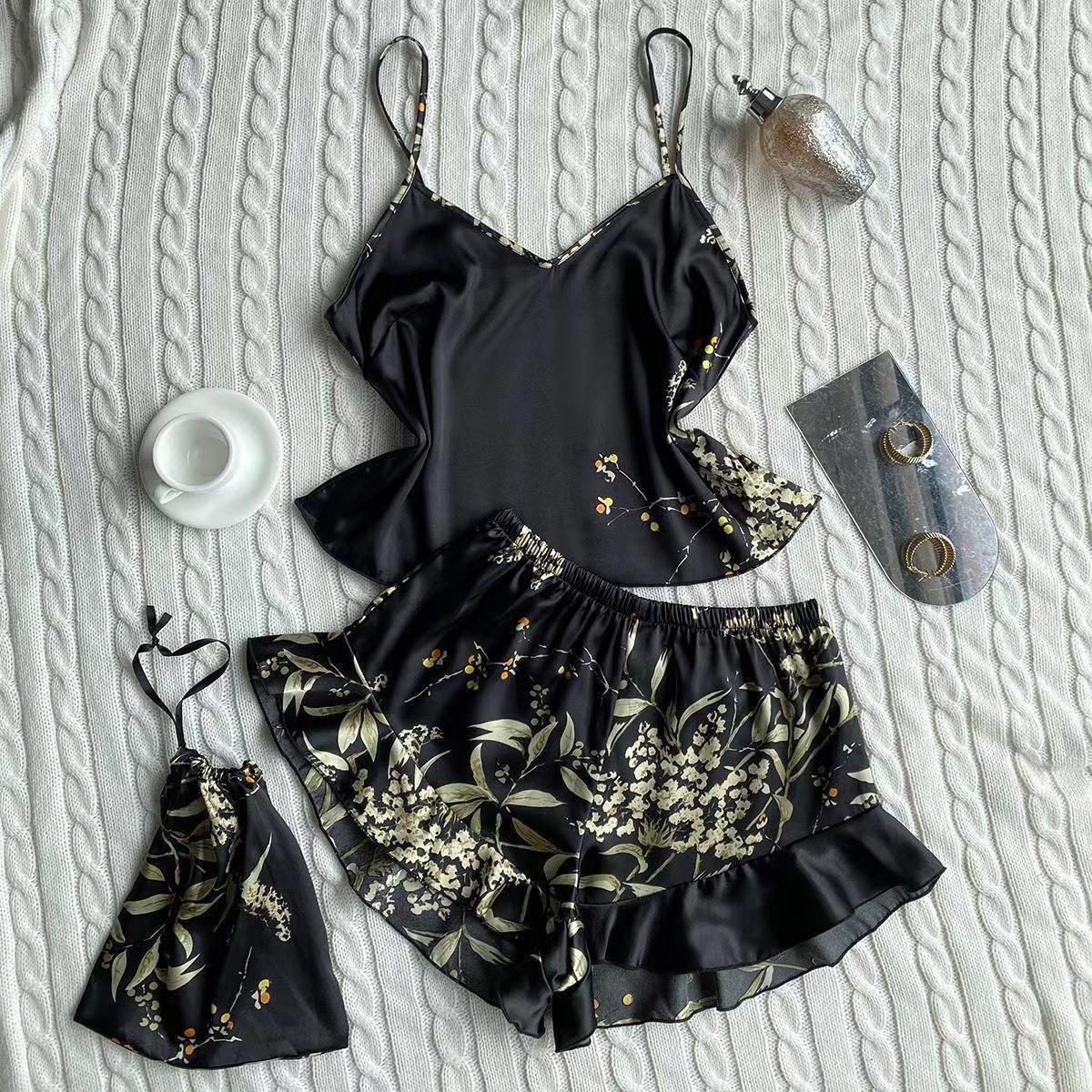 여성용 홈웨어 끈이 달린 잠옷 세트 얇은 중간 길이 잠옷 세트 다용도