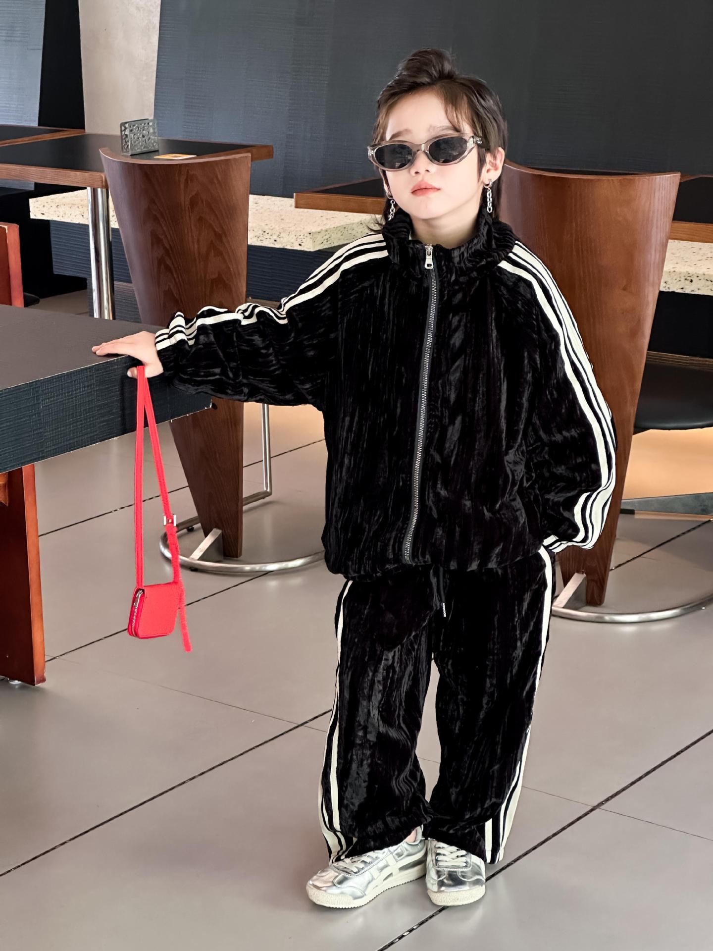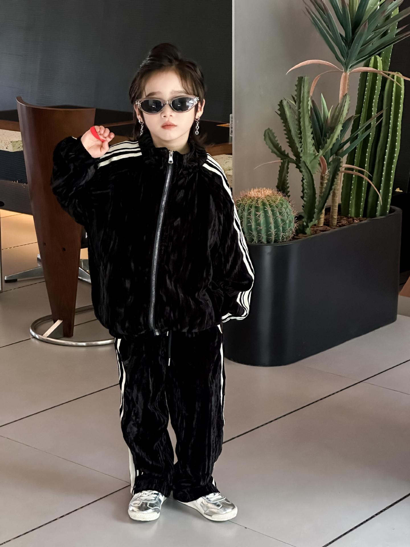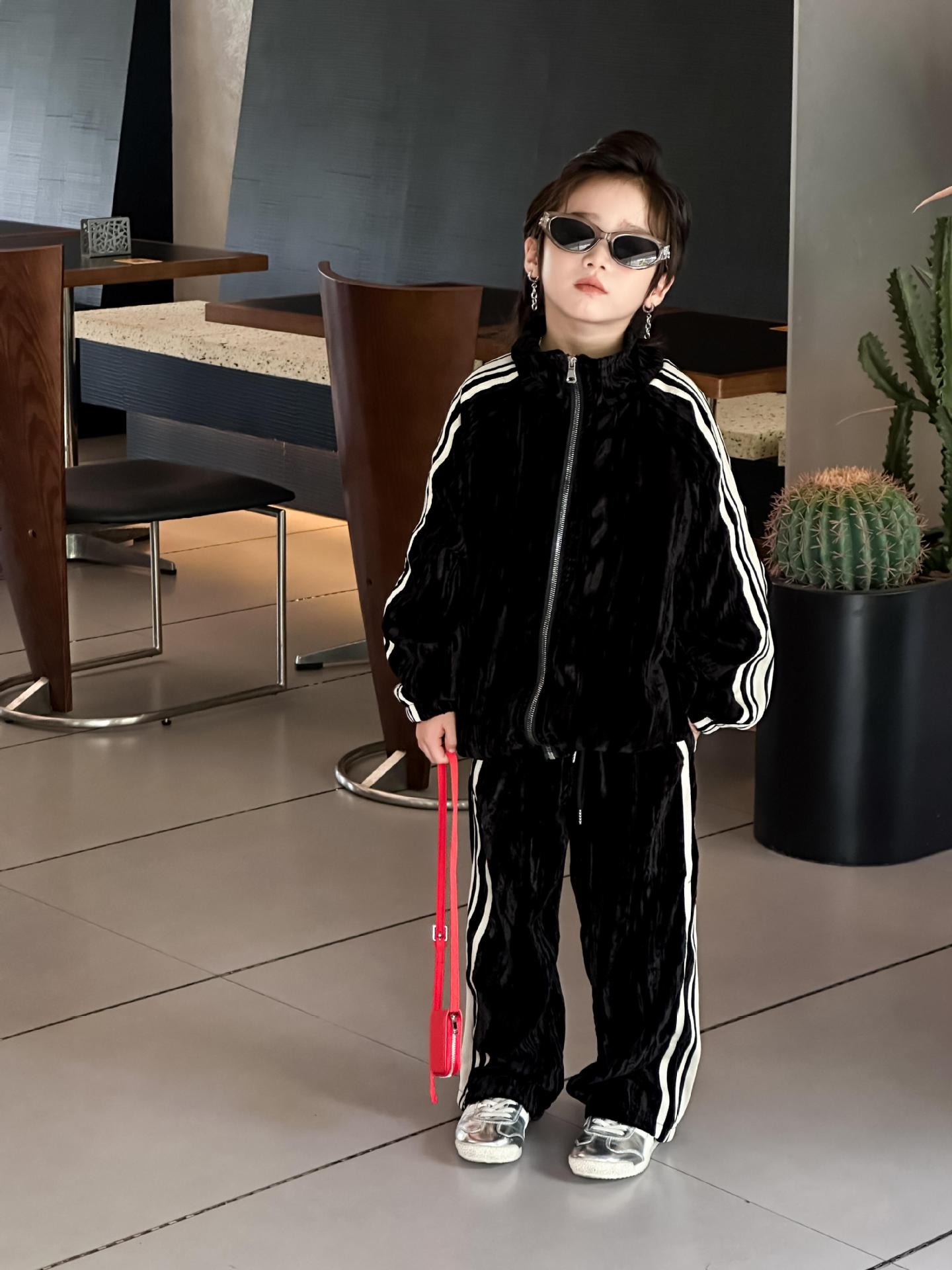 트레이슬블랙 트레이블랙 가을겨울 벨벳 자켓 투피스 세트 남성용 니치 컬러블록 스트라이프 캐주얼 스포츠 세트 한국 스타일 캐주얼 만능템