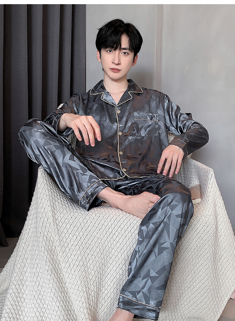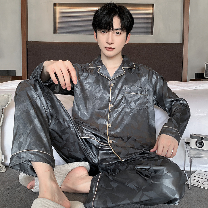 남자 잠옷 청소년 봄과 가을 명품 캐주얼 플러스 사이즈 아이스 실크 쿨 자카드 아이스 실크 긴 소매 홈 옷