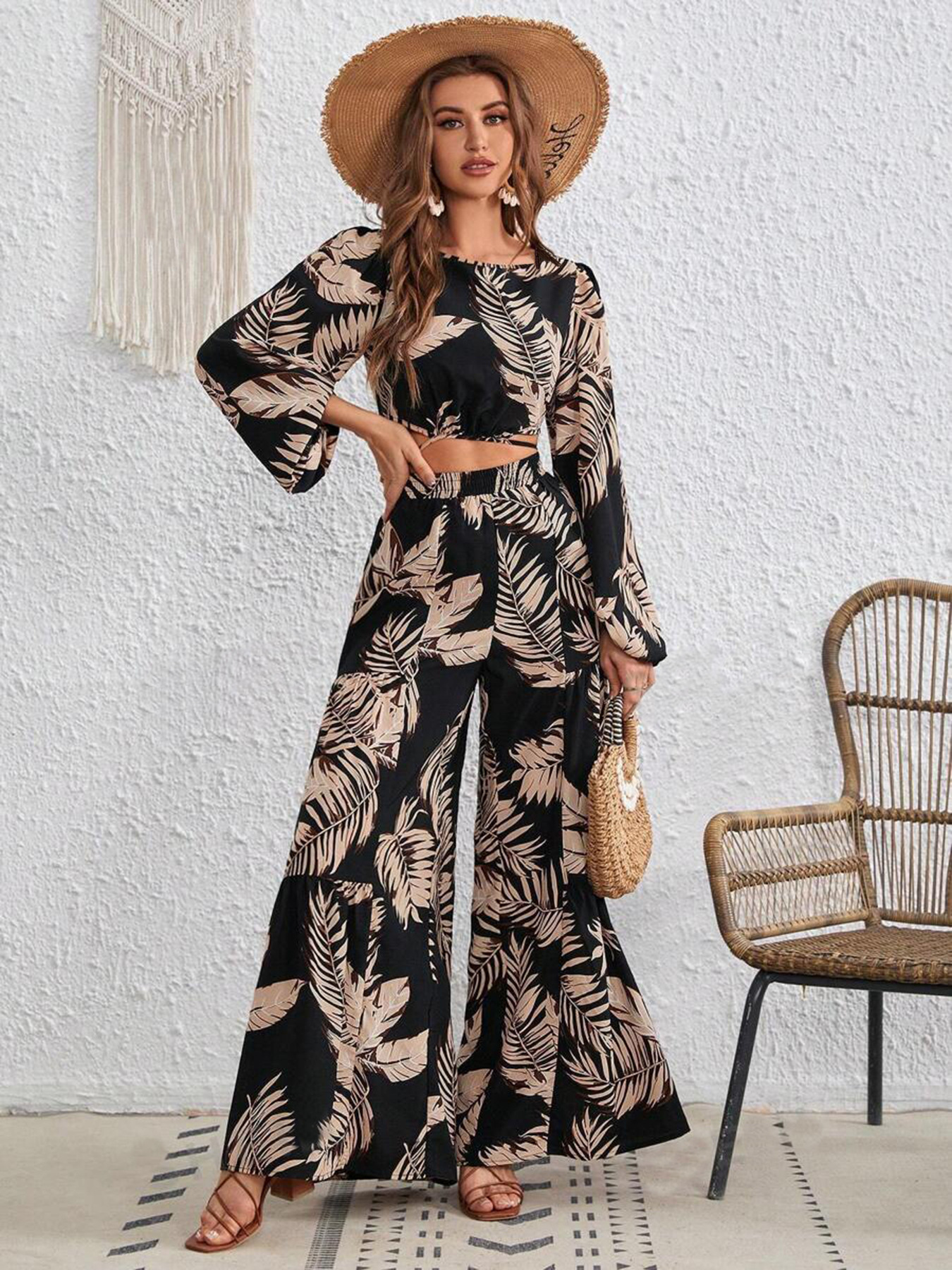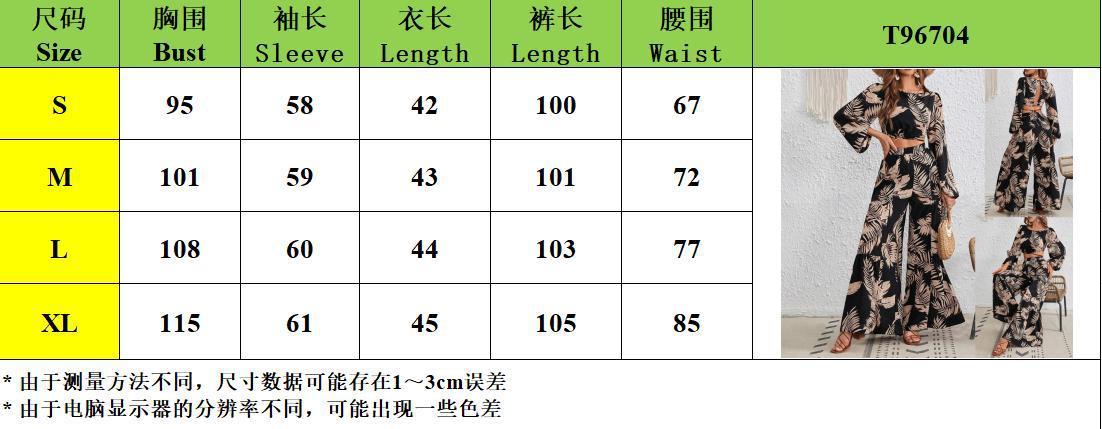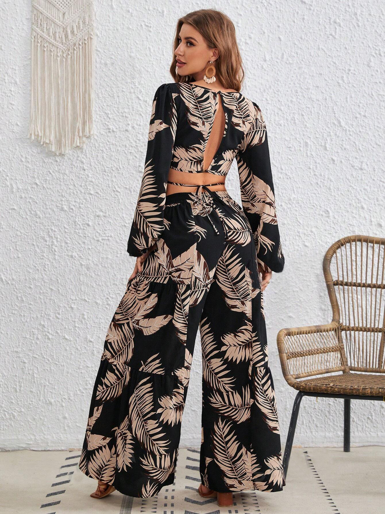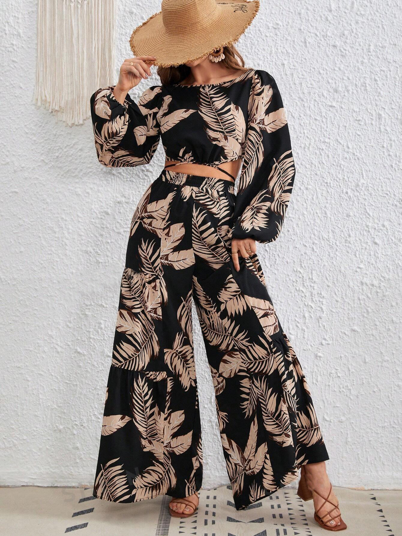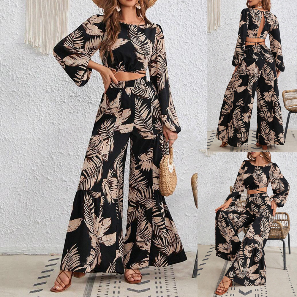 재고 국경 간 아마존 2024 여성 열대 인쇄 레이스 업 할로우 랜턴 슬리브 탑 넓은 다리 바지