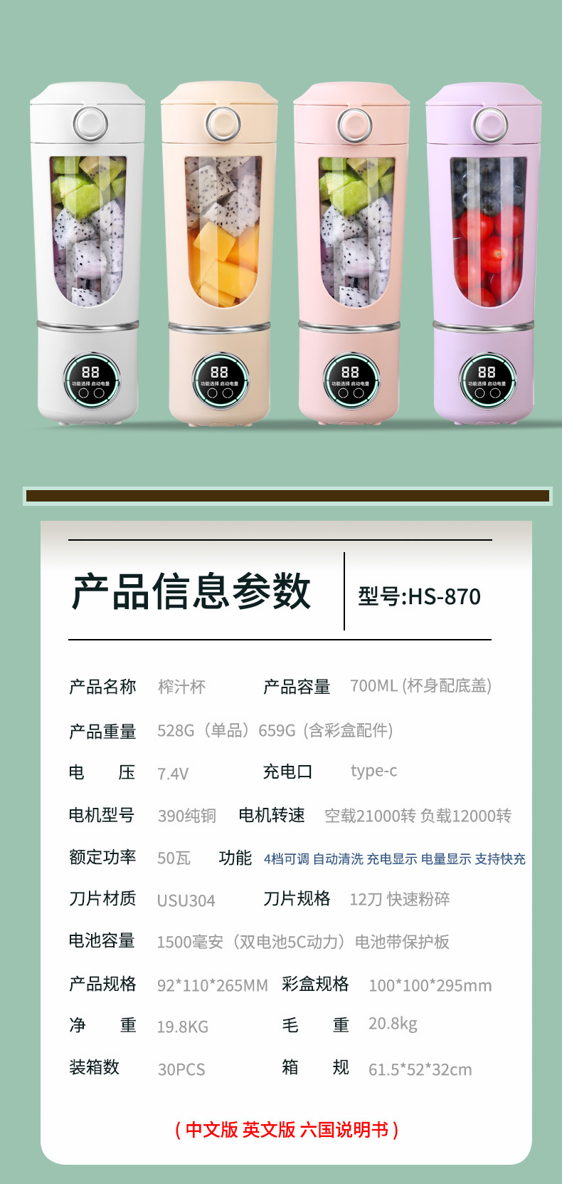 국경 간 새로운 주스 추출기 가정용 얼음 분쇄 주스 컵 USB 충전식 휴대용 주스 기계 야외 텀블러 12 칼스토어 가기
