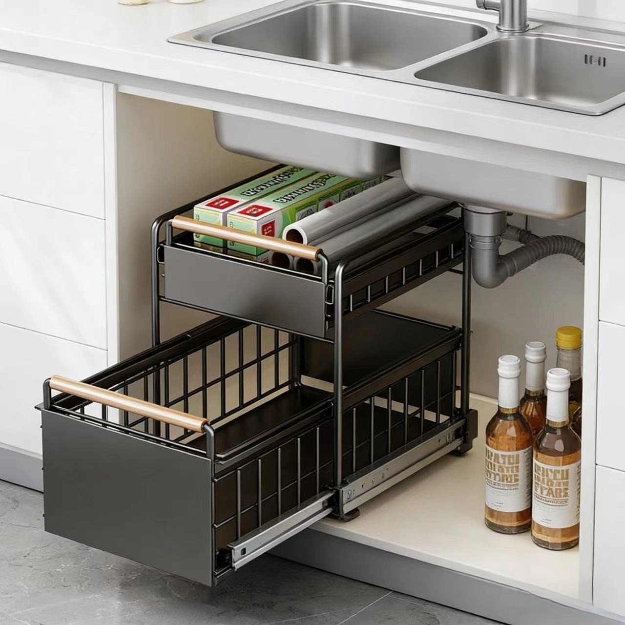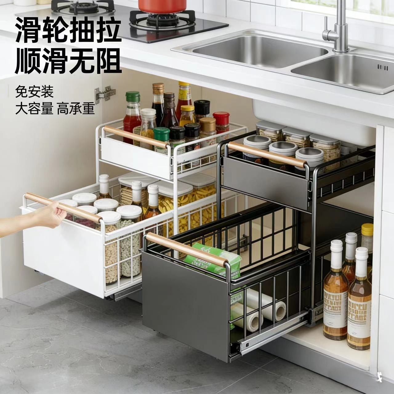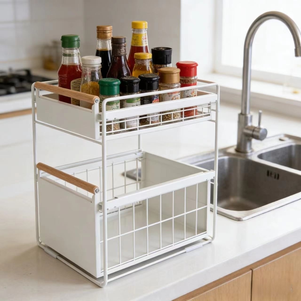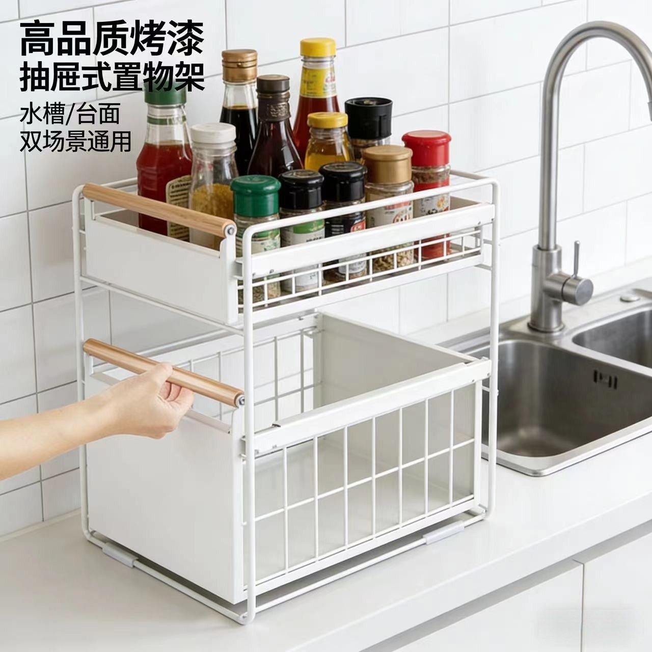 주방 수중 수납선반, 양념 및 접시 보관용, 슬라이드형 싱크대 다기능 수납선반, 캐비닛 레이어드 선반, 풀아웃 바구니스토어 가기