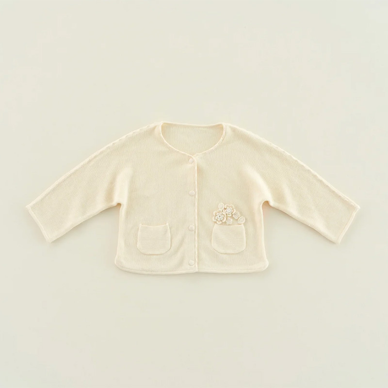 새로운 어린이 실크 코튼 카디건 수제 꽃 포켓 스웨터 가을, 겨울 유아 순수한 흰색 옷