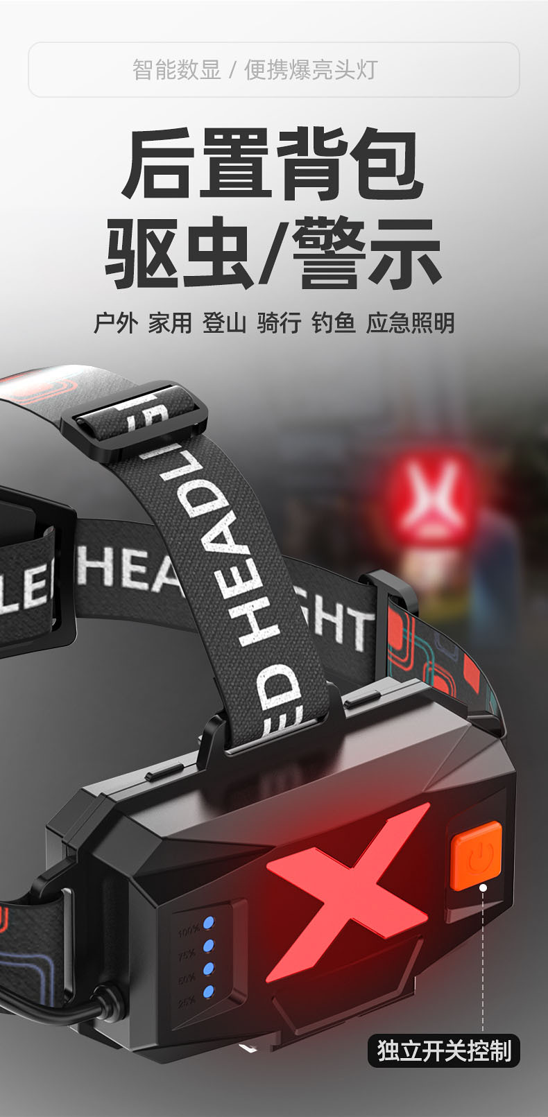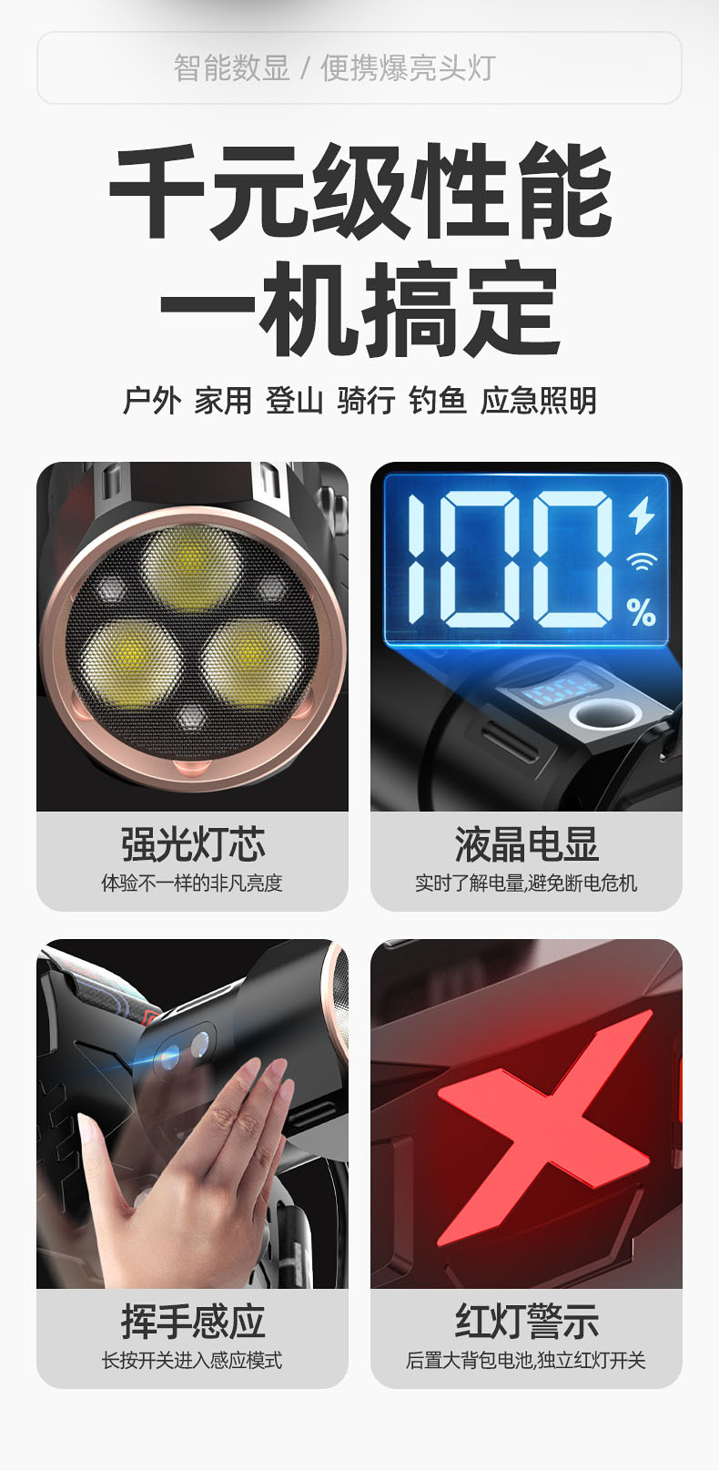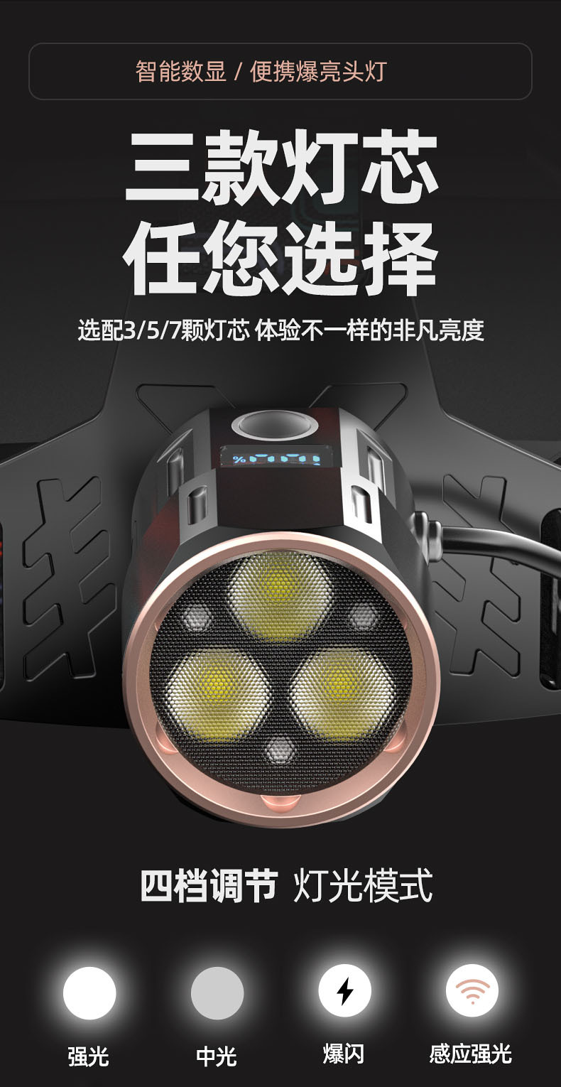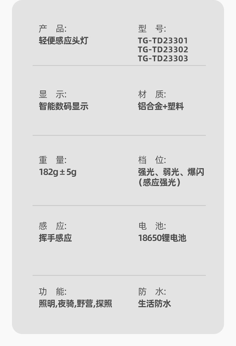 【工作档位】:强光-弱光-爆闪(感应强光)