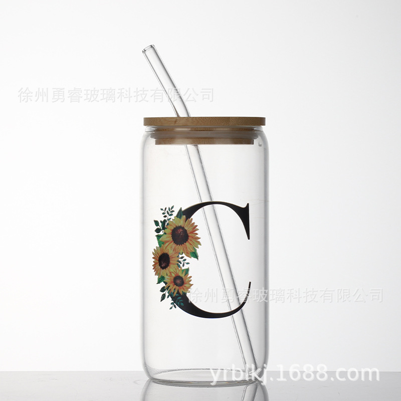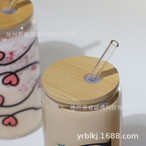 국경 간 인기 16온스 콜라 컵 밀짚 컵 고붕규산 유리 워터 컵 메이슨 컵 나무 뚜껑 주스 컵 세트