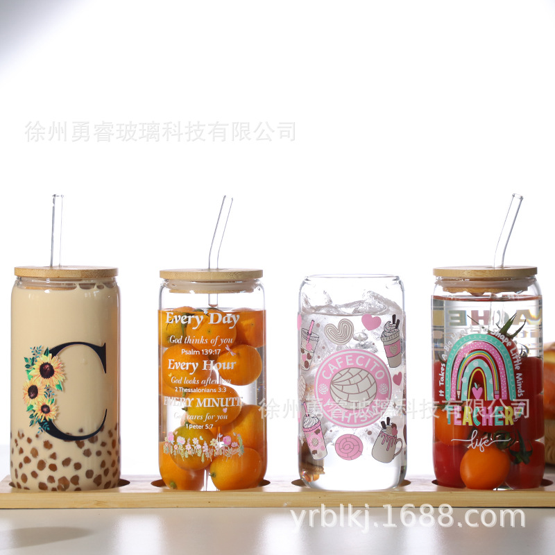 국경 간 인기 16온스 콜라 컵 밀짚 컵 고붕규산 유리 워터 컵 메이슨 컵 나무 뚜껑 주스 컵 세트스토어 가기