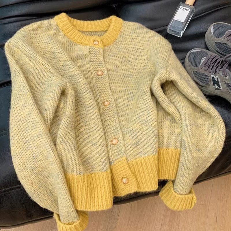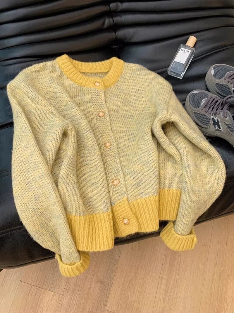 샤넬 스타일 노란색 짧은 스웨터 코트 여성의 2024 봄과 가을 두꺼운 게으른 스타일 작은 니트 카디건 탑