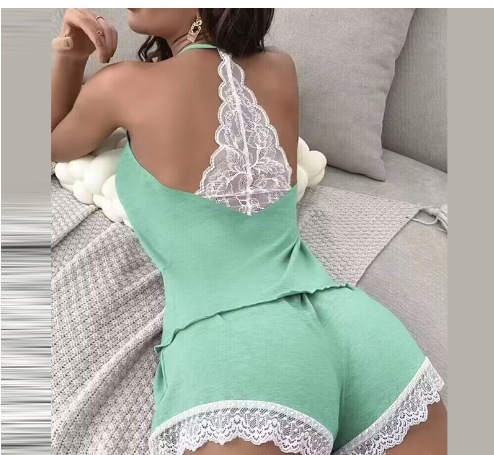 유럽과 미국의 2024 여성의 새로운 패션 섹시한 슬링 V 넥 레이스 반바지 파자마 홈 의류 투피스 세트