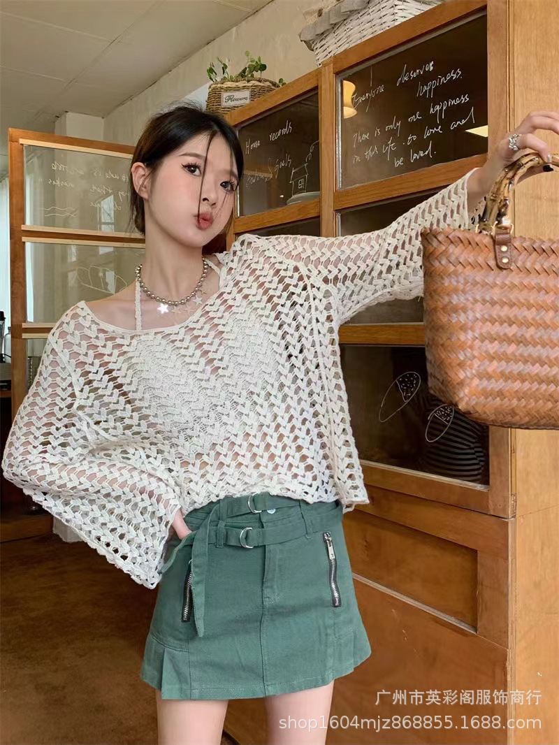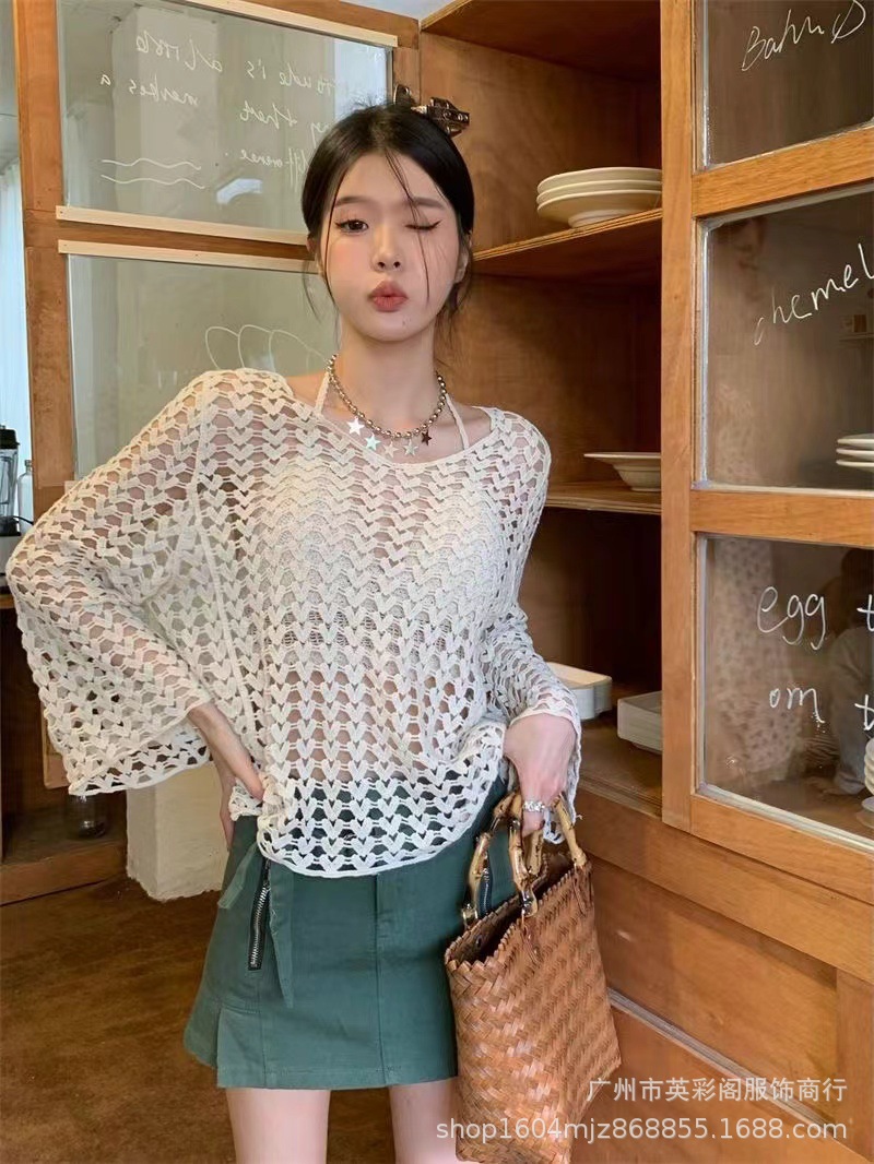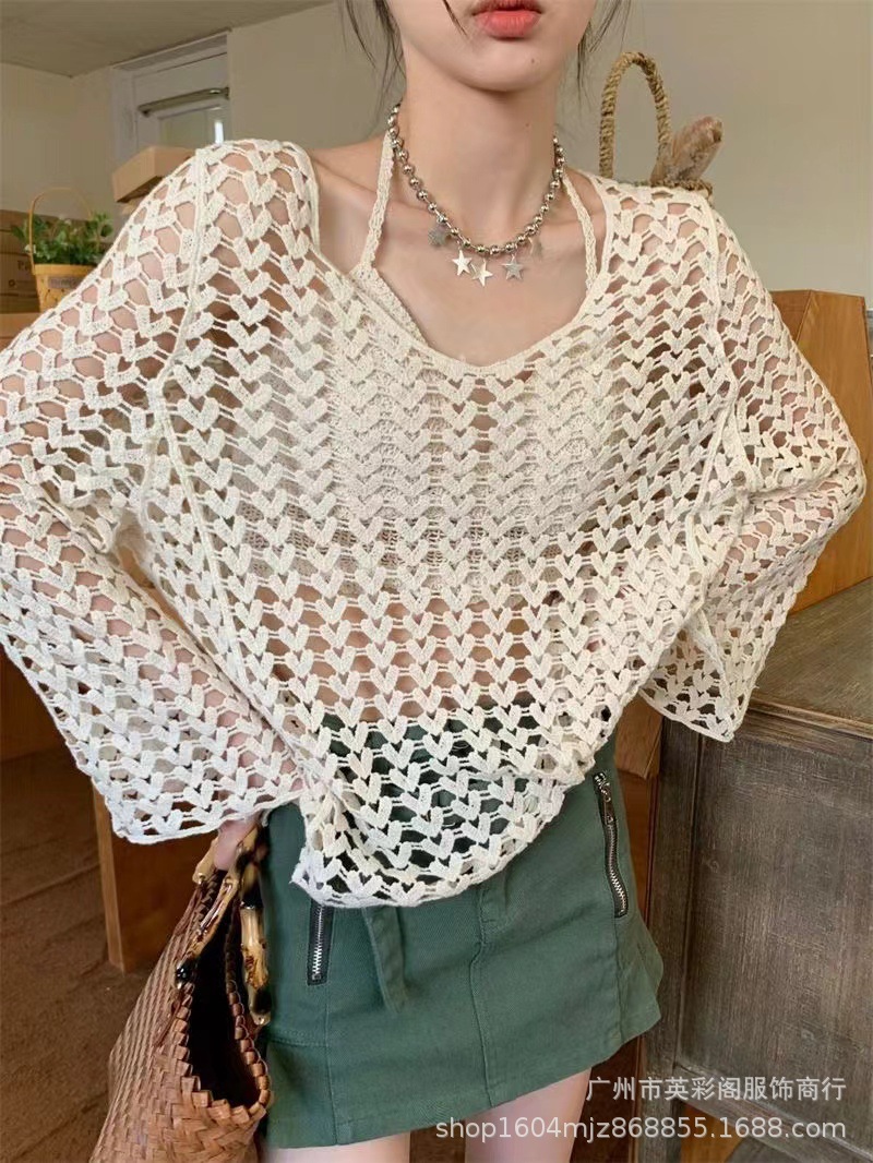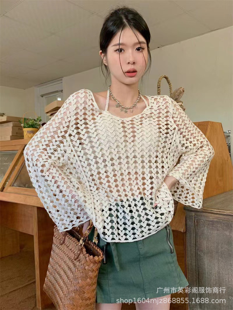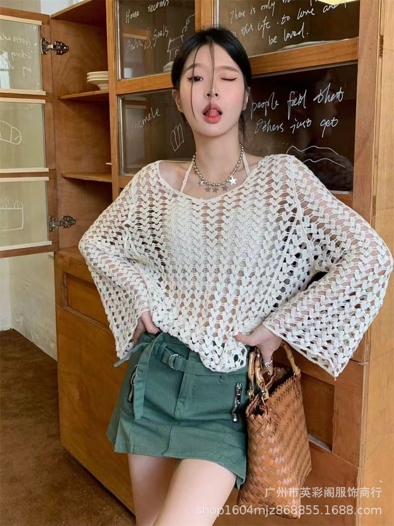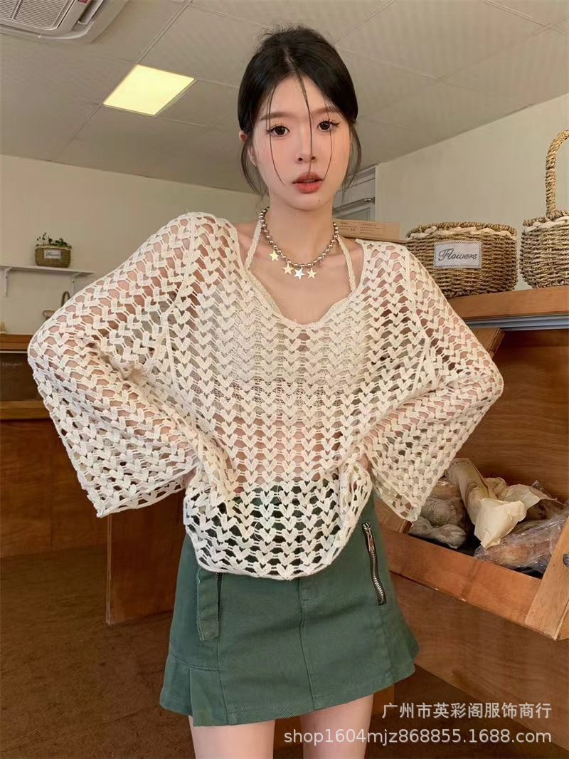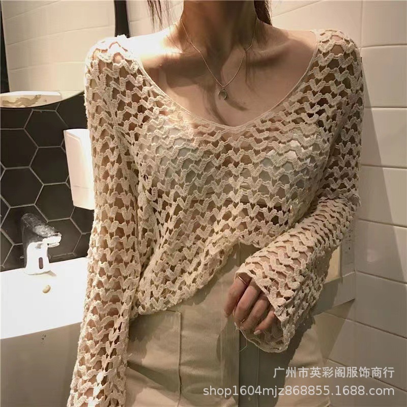 봄 여성의 새로운 홍콩 스타일 레트로 작은 섹시한 V-Neck 할로우 어깨 선 스크린 느슨한 블라우스 니트 탑