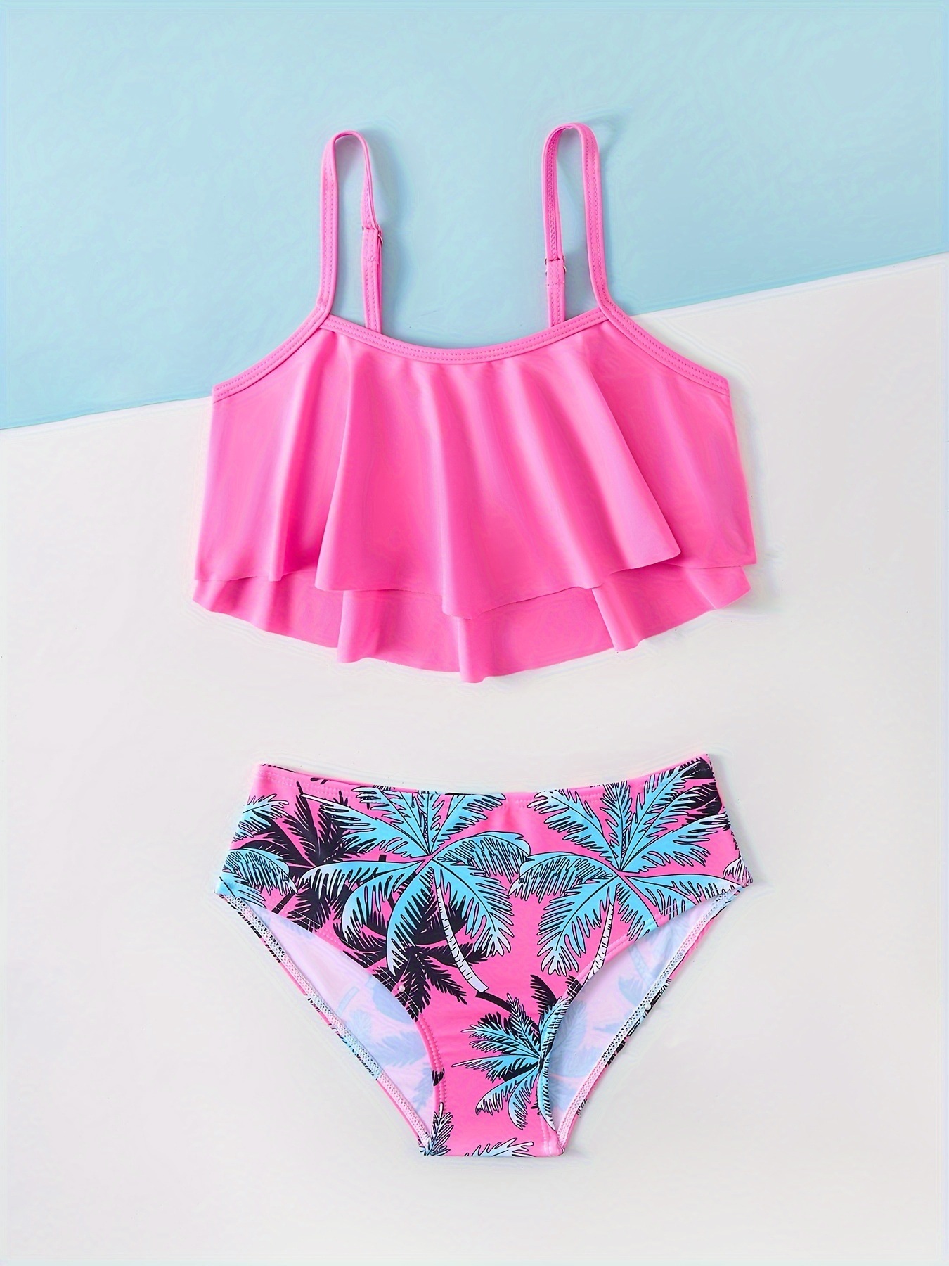 25년 역사의 유럽 및 미국 아동용 수영복, 열대 프린트, 분리형, 중대형 여아 수영복, 자외선 차단 탱키니, 해변용 속건성스토어 가기