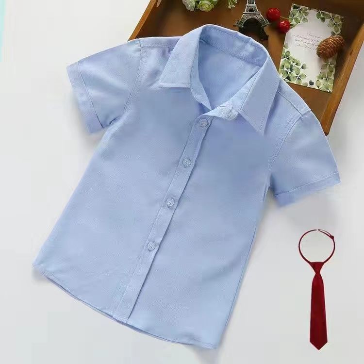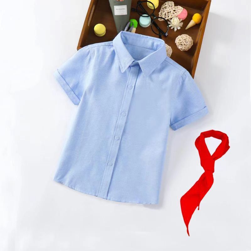• 【블루】 포켓 없는 반팔 셔츠 + 다홍색 넥타이