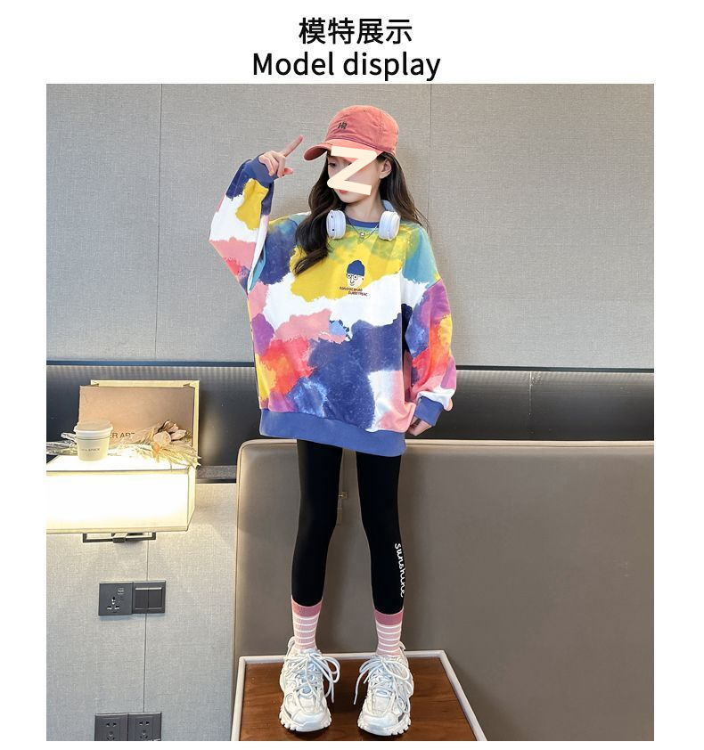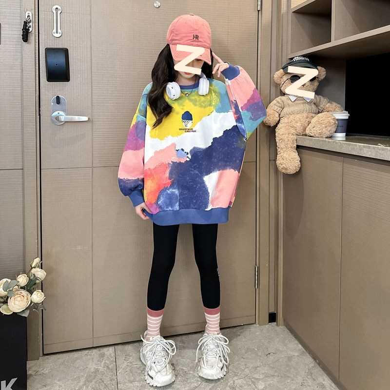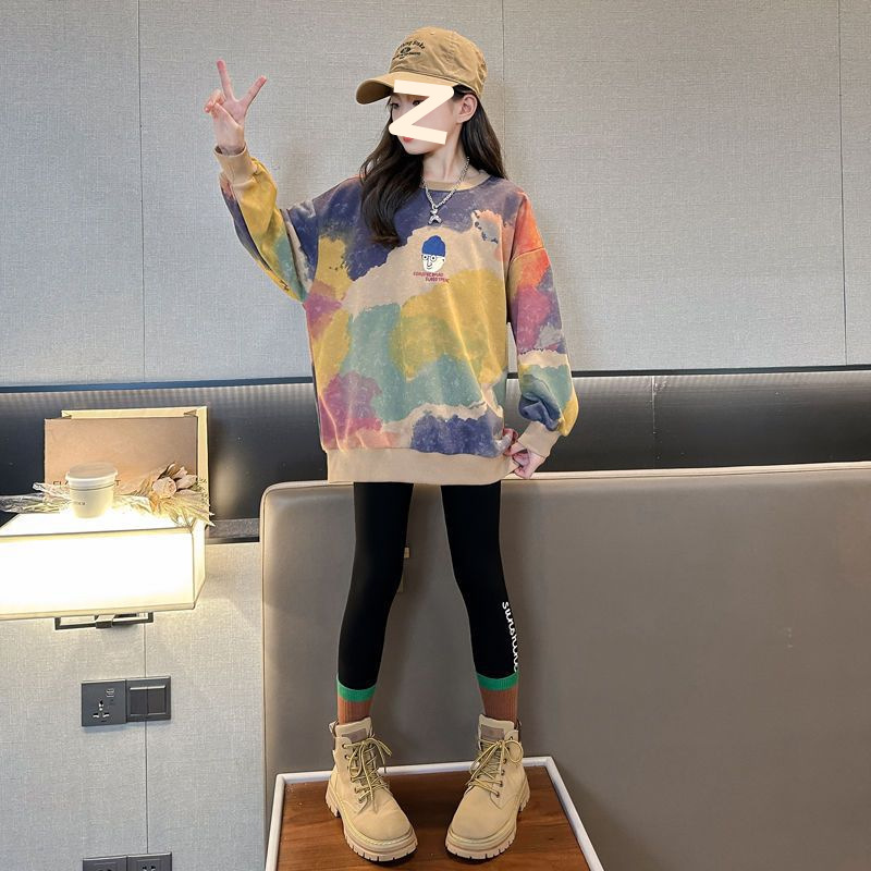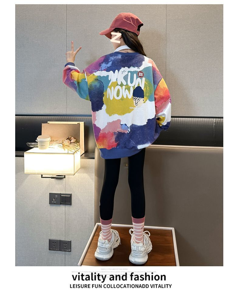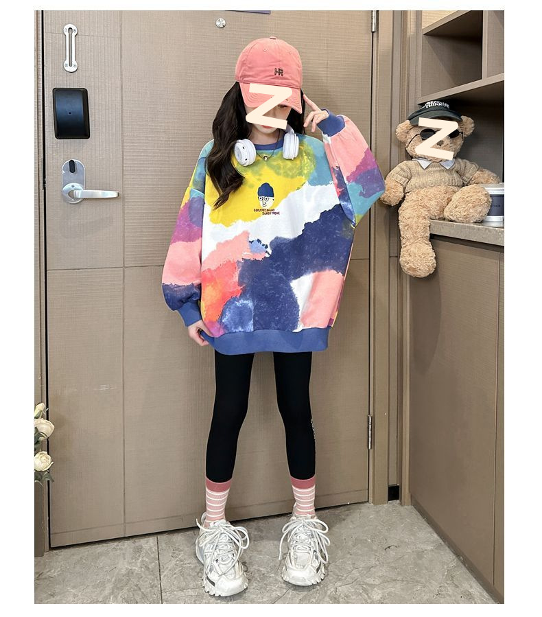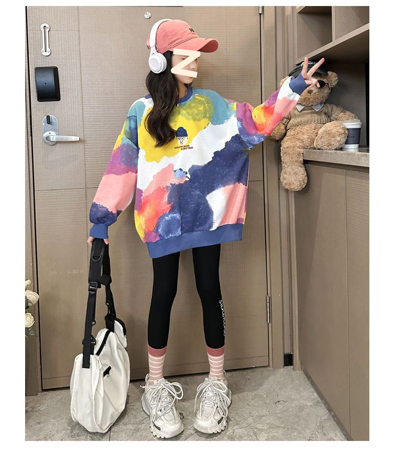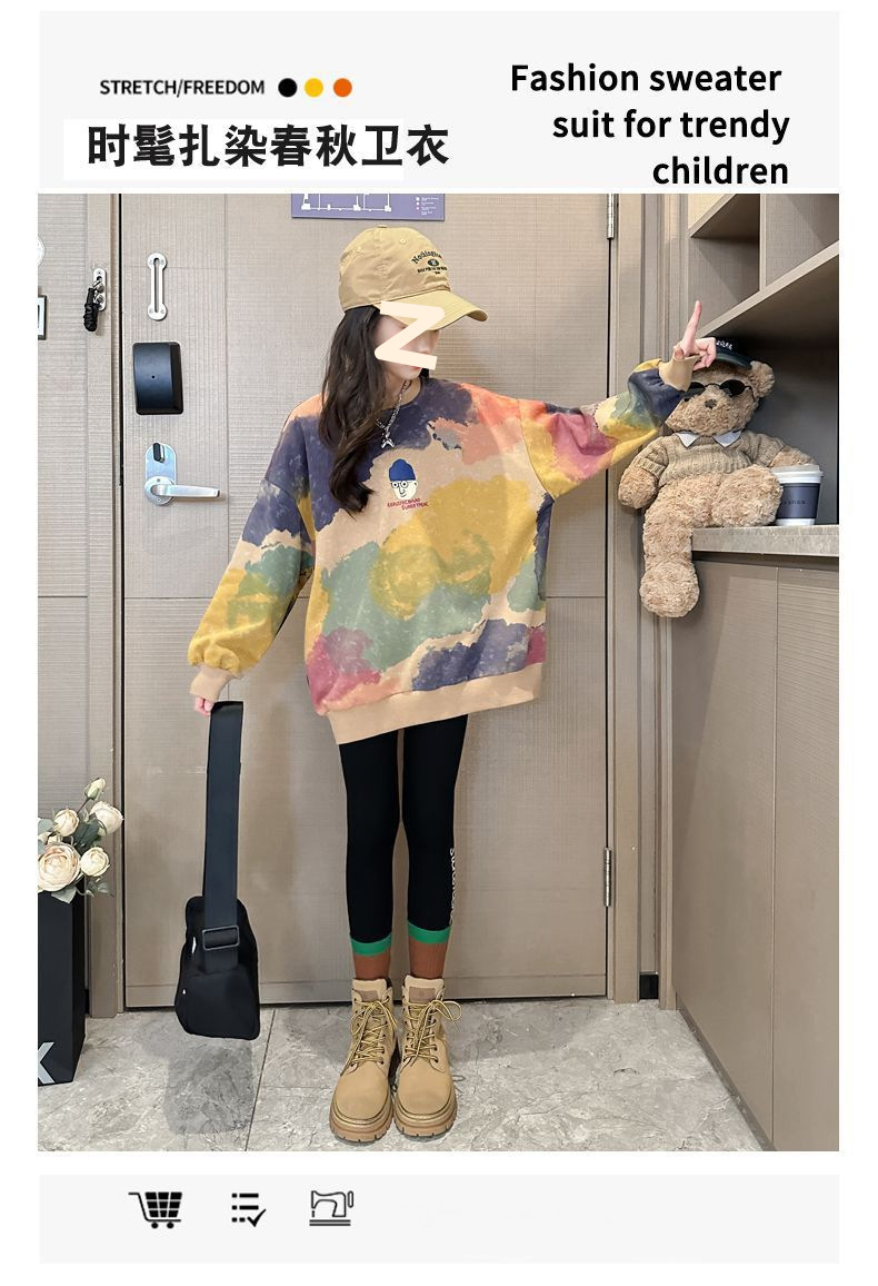 소녀 가을 넥타이-염료 라운드 넥 스웨터 2024 새로운 스타일 스타일리스트 긴 소매 느슨한 탑 외부 착용베이스 셔츠