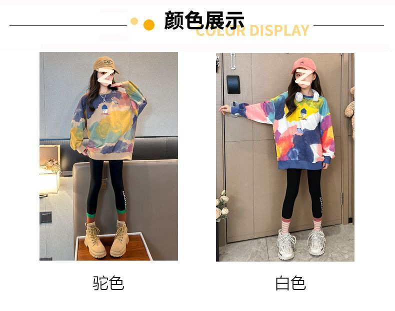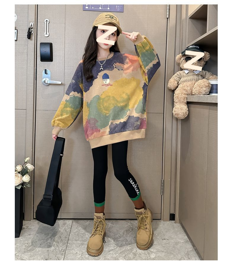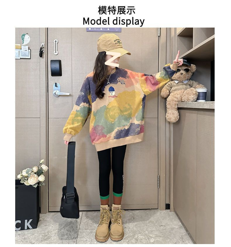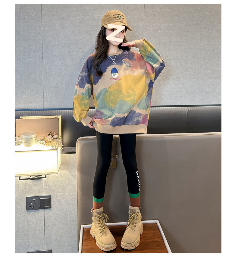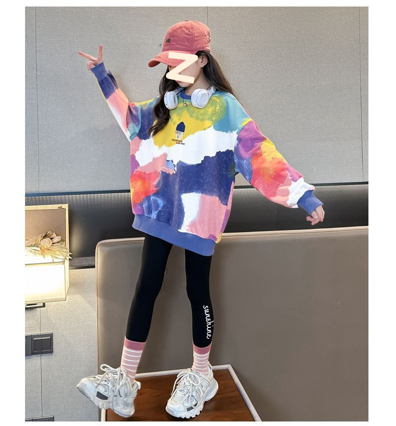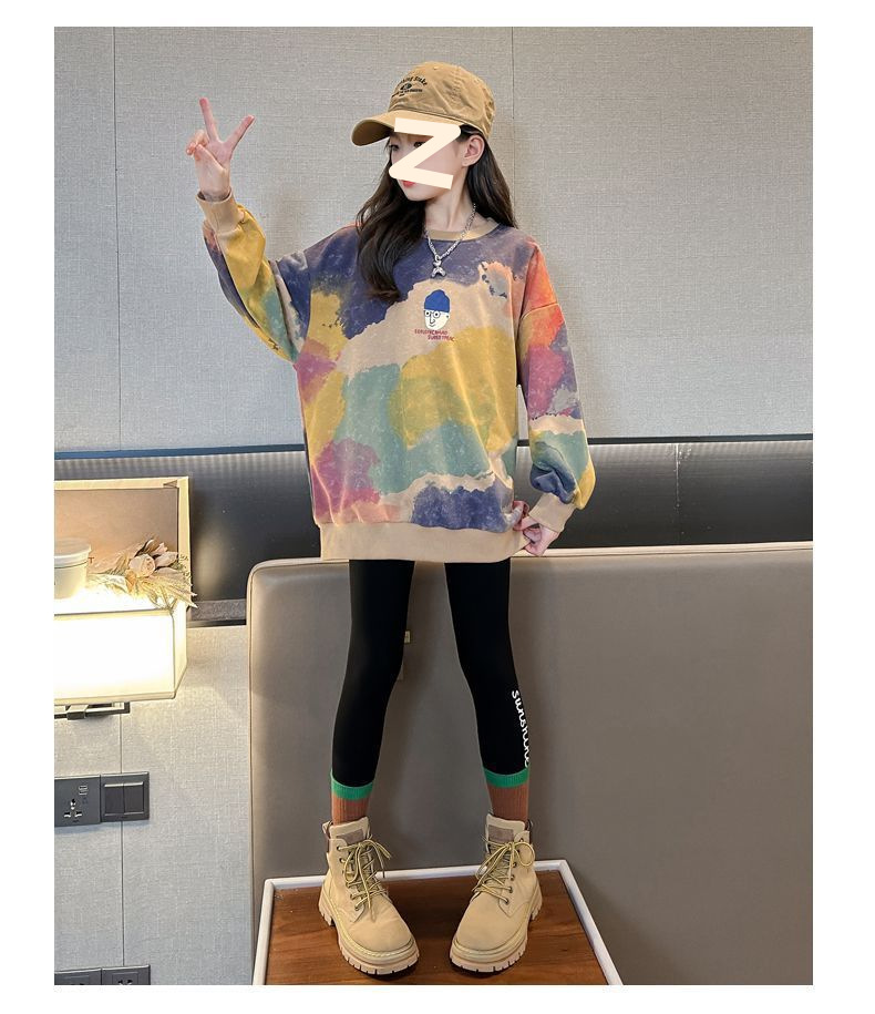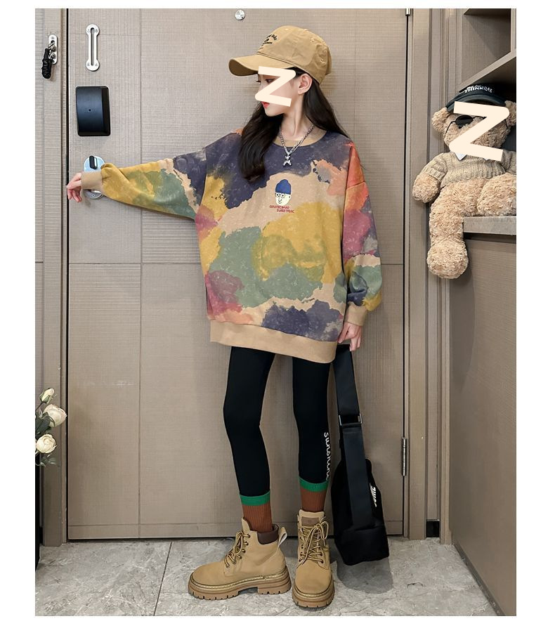 소녀 가을 넥타이-염료 라운드 넥 스웨터 2024 새로운 스타일 스타일리스트 긴 소매 느슨한 탑 외부 착용베이스 셔츠