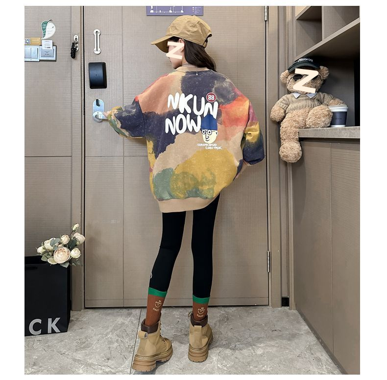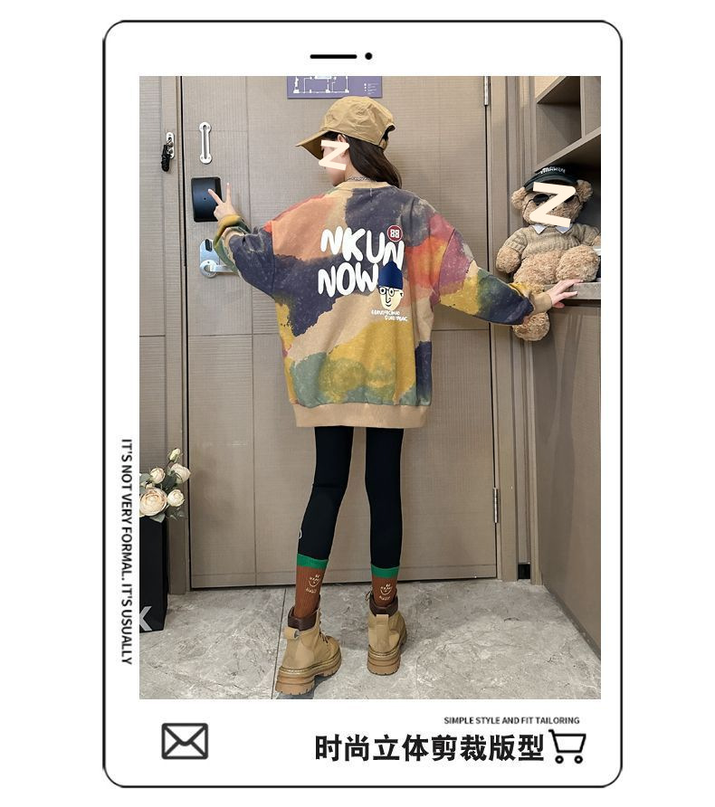 소녀 가을 넥타이-염료 라운드 넥 스웨터 2024 새로운 스타일 스타일리스트 긴 소매 느슨한 탑 외부 착용베이스 셔츠스토어 가기