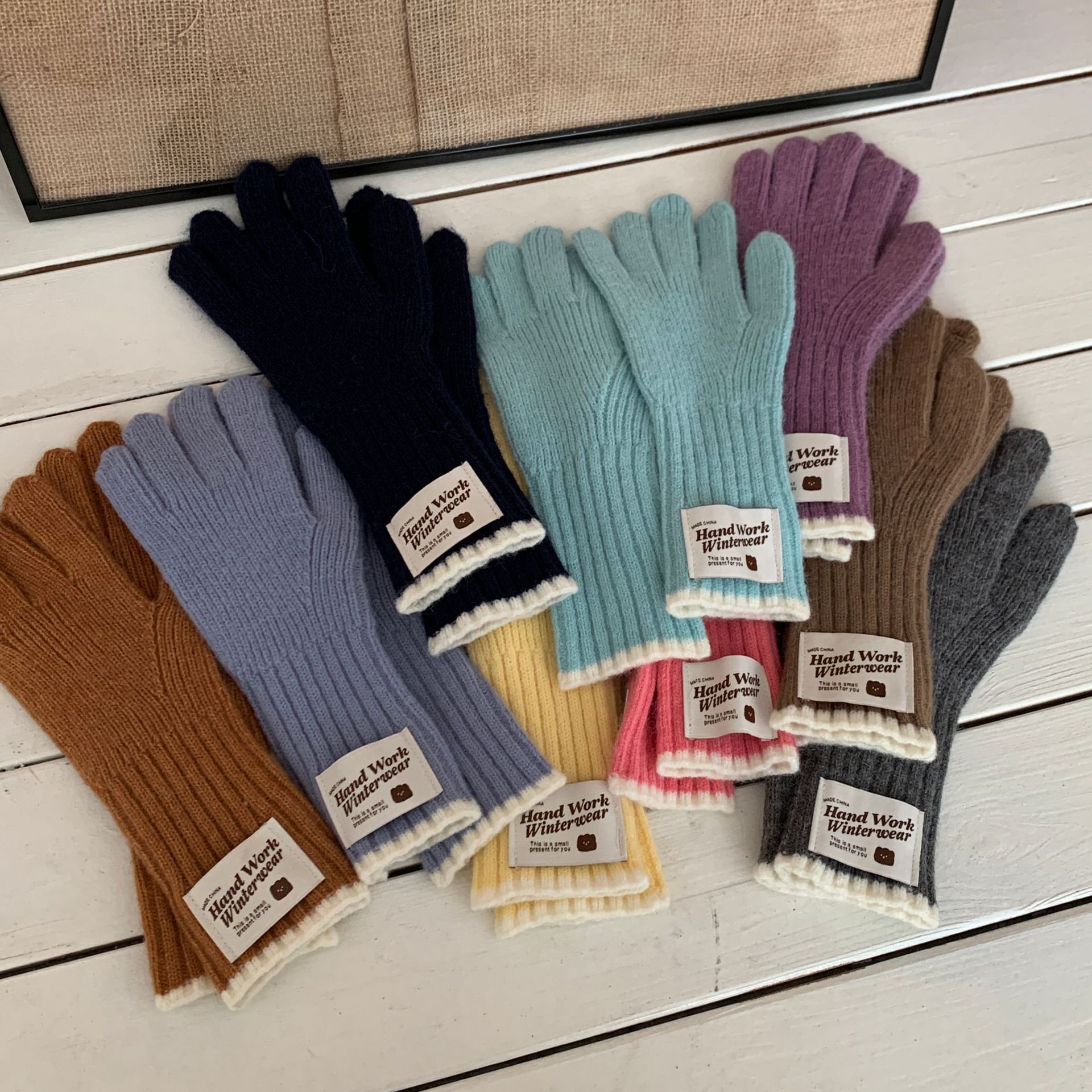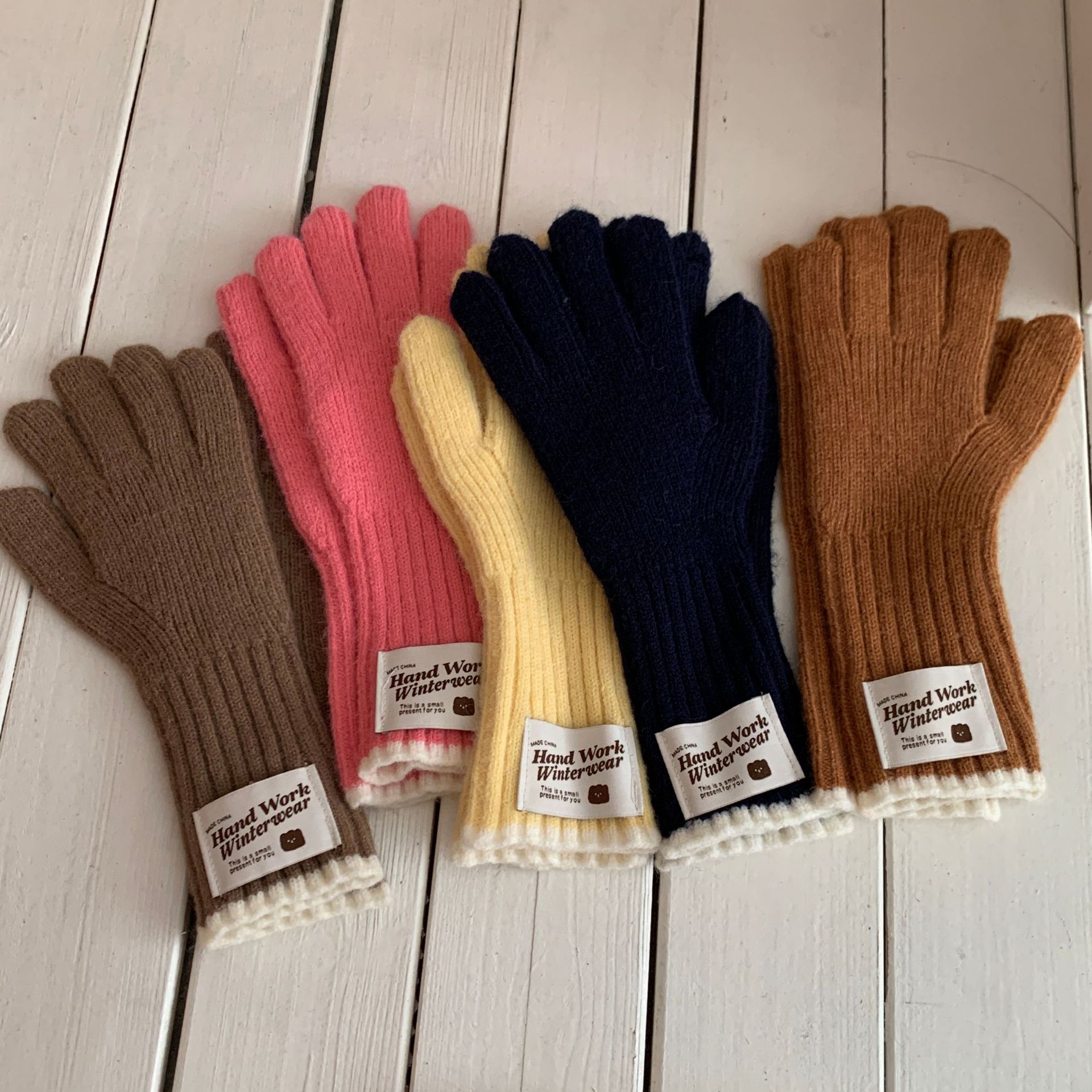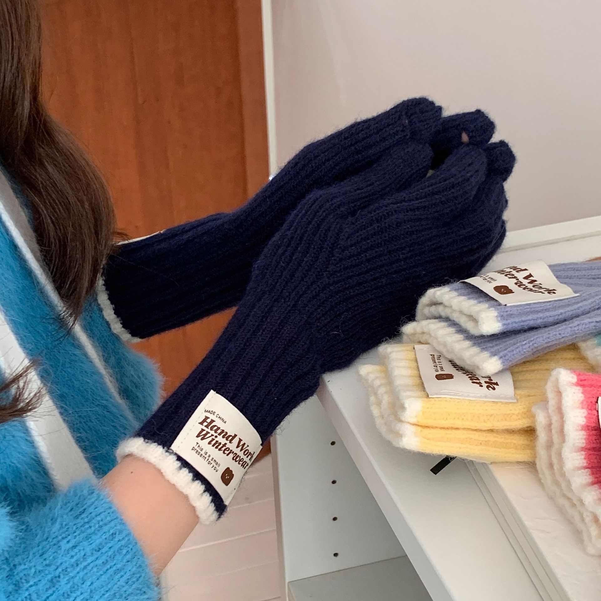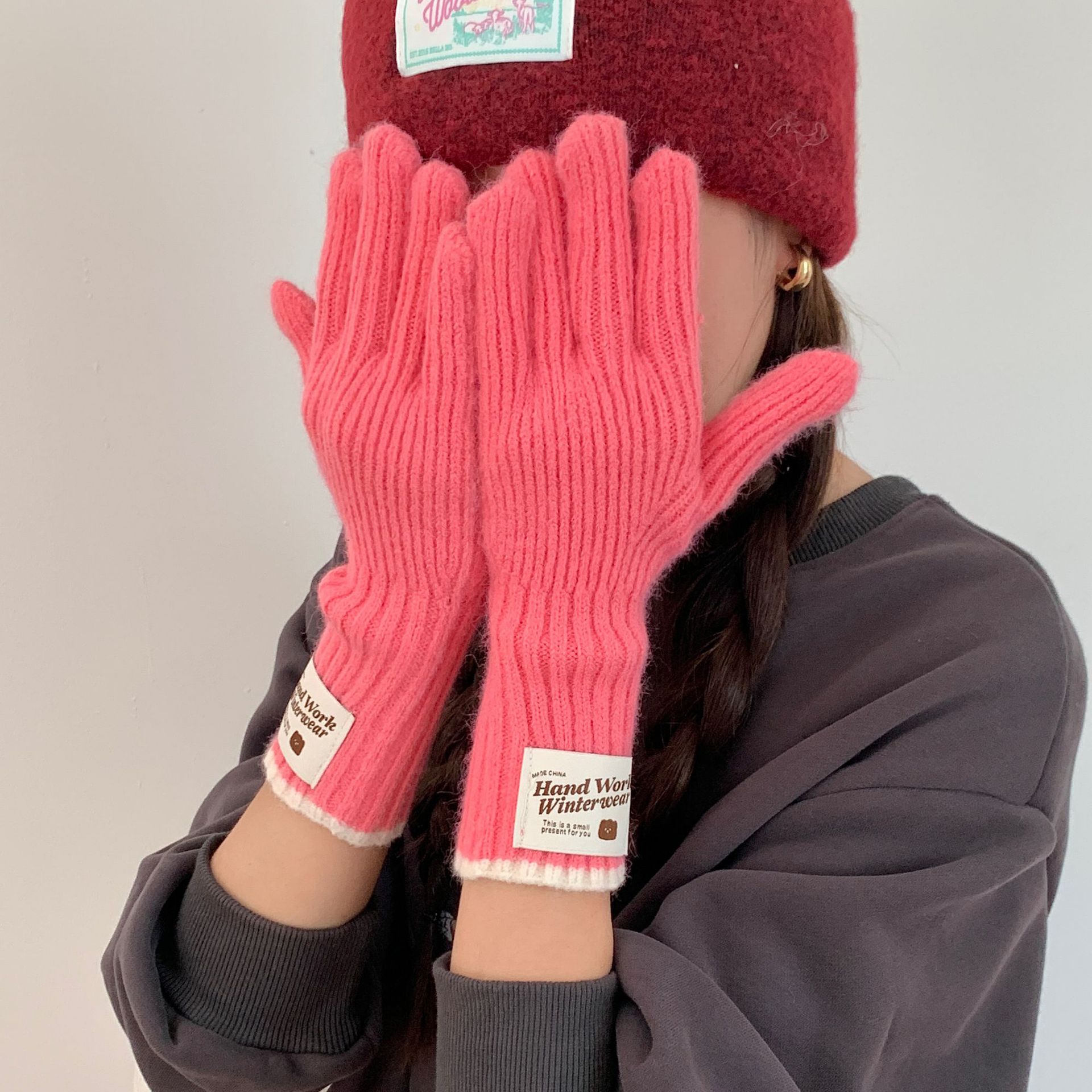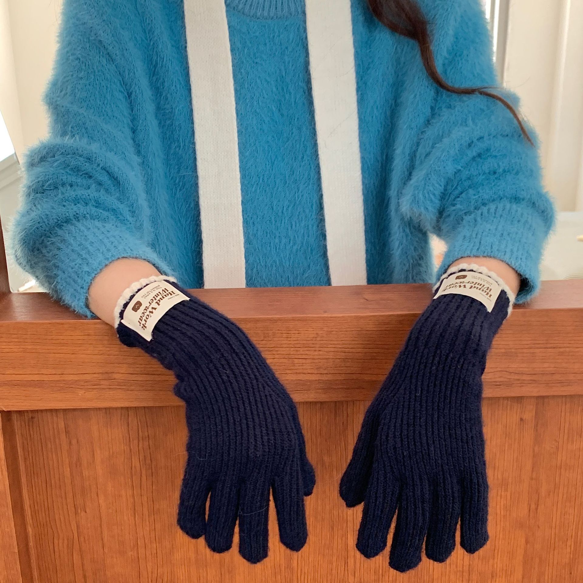솔리드 컬러 하프 핑거 니트 울 장갑 대조적 인 색상 바느질 여성용 겨울 손가락 2024 새로운 터치 스크린 냉난방 및 보온 유지스토어 가기