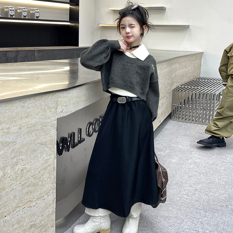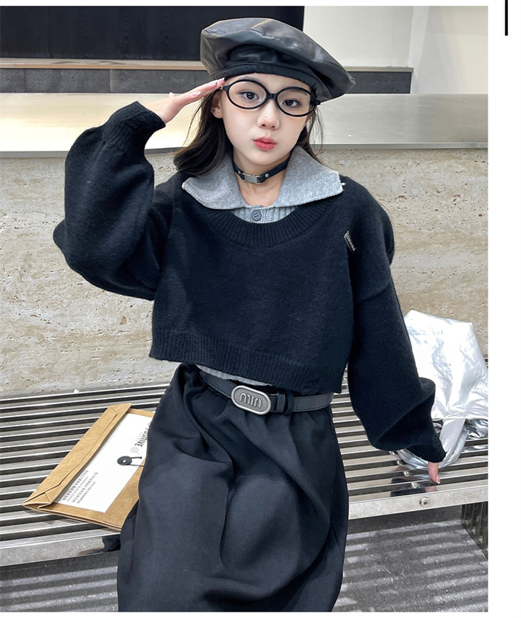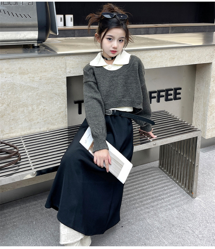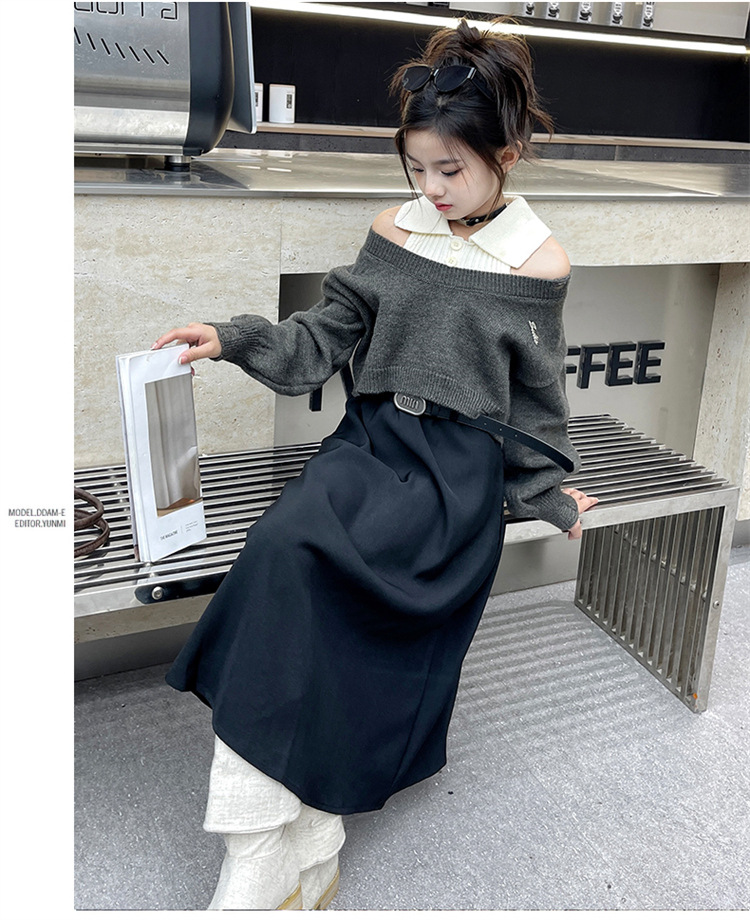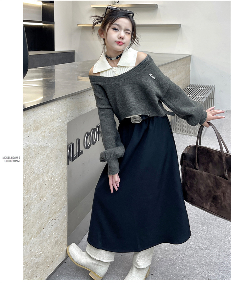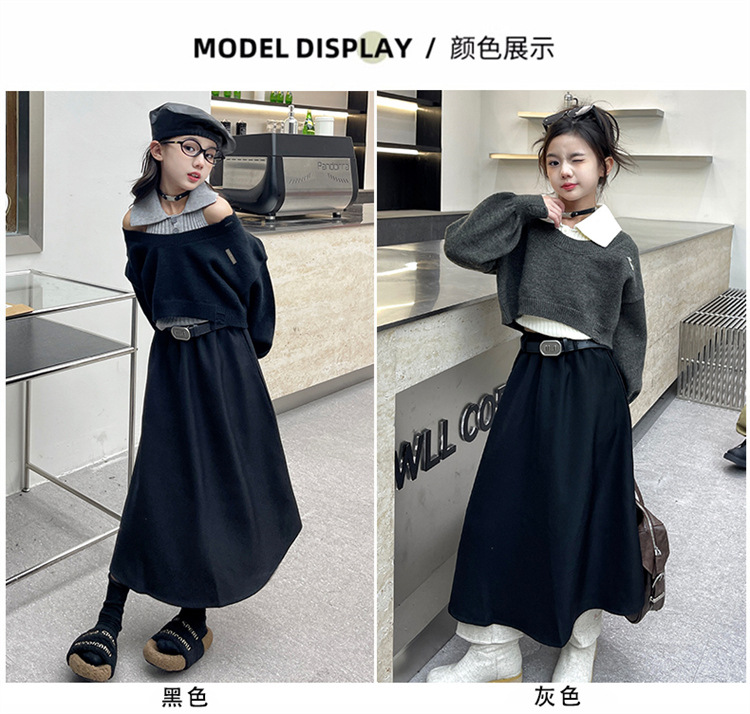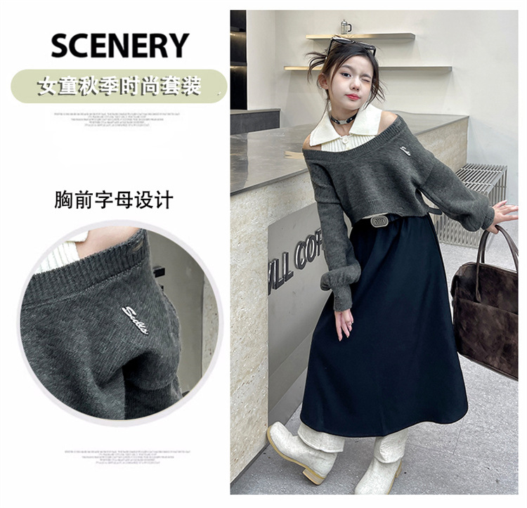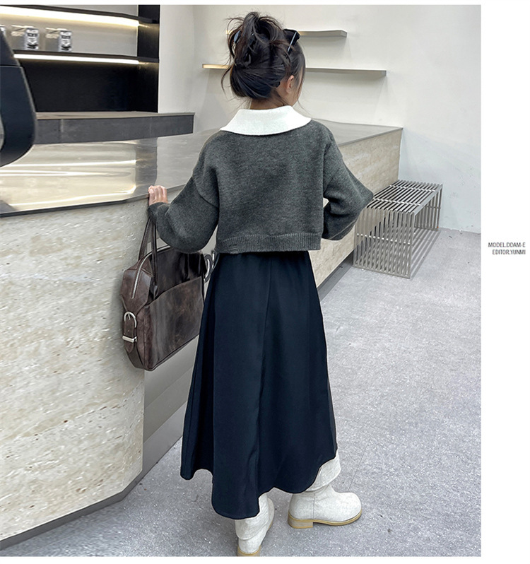 소녀 스웨터 세트 봄과 가을 새로운 니트 홀 스웨터 옷깃 재킷 반쪽 길이 원피스 투피스 아동복