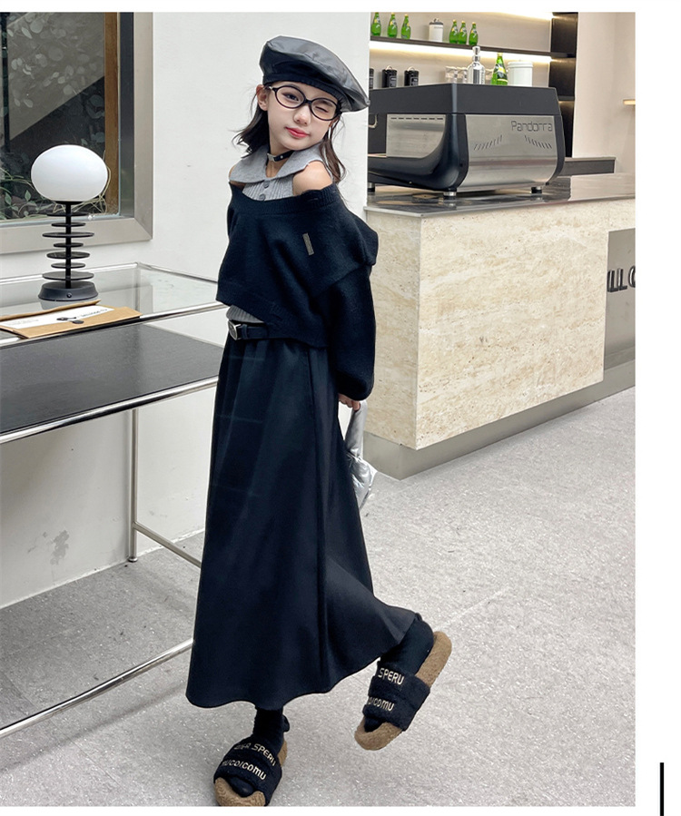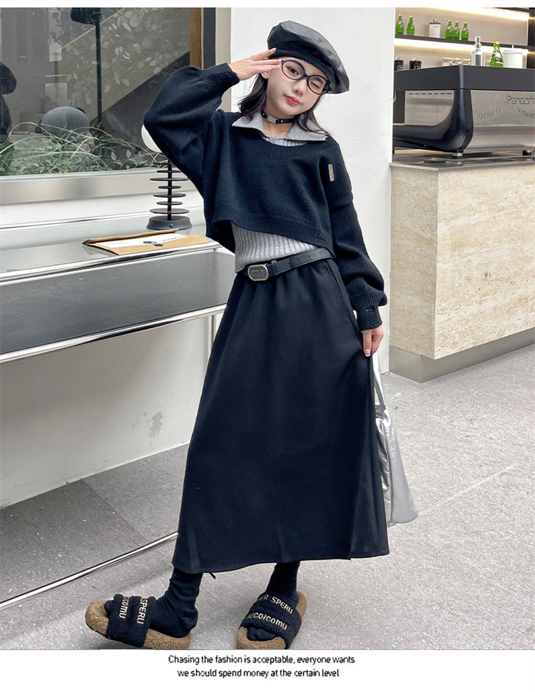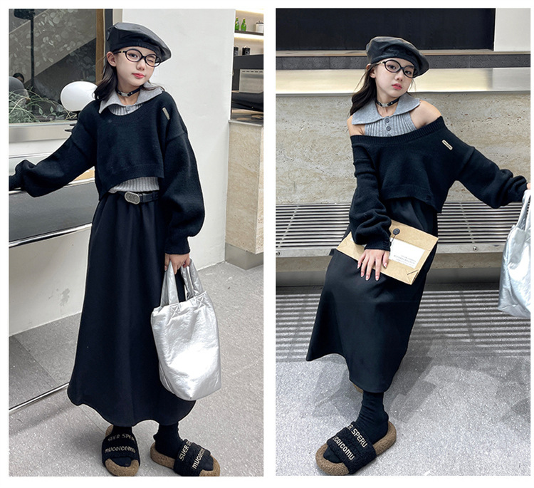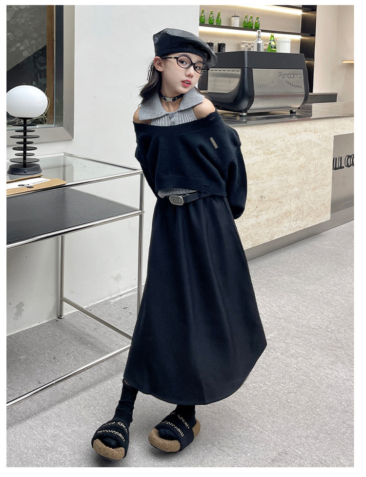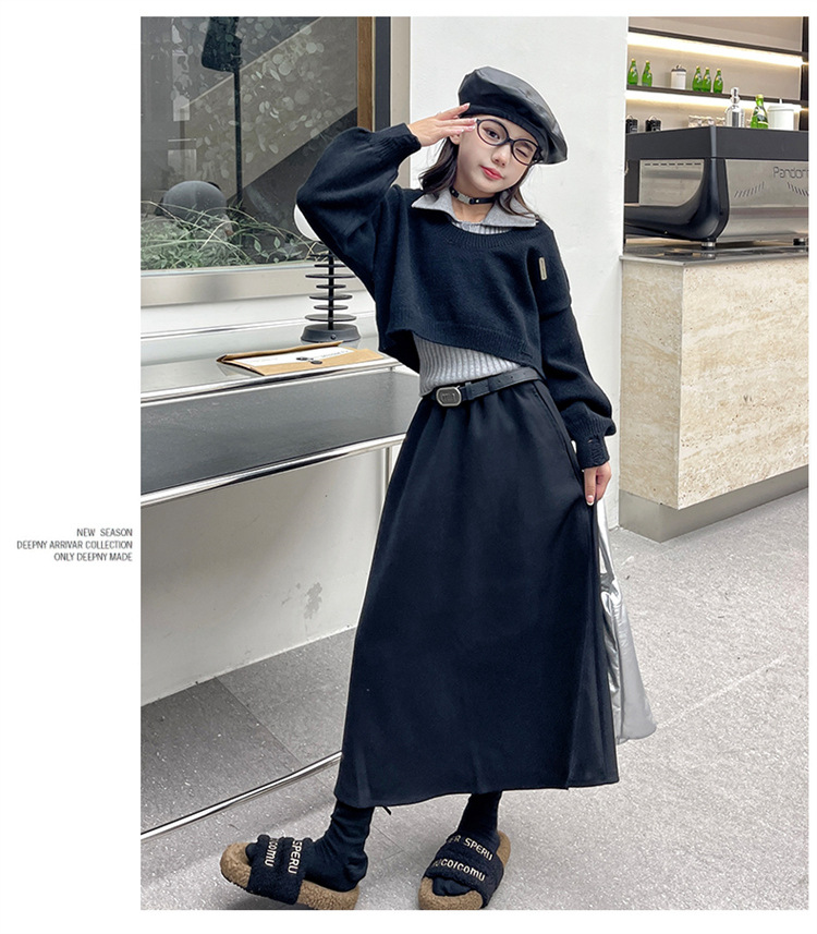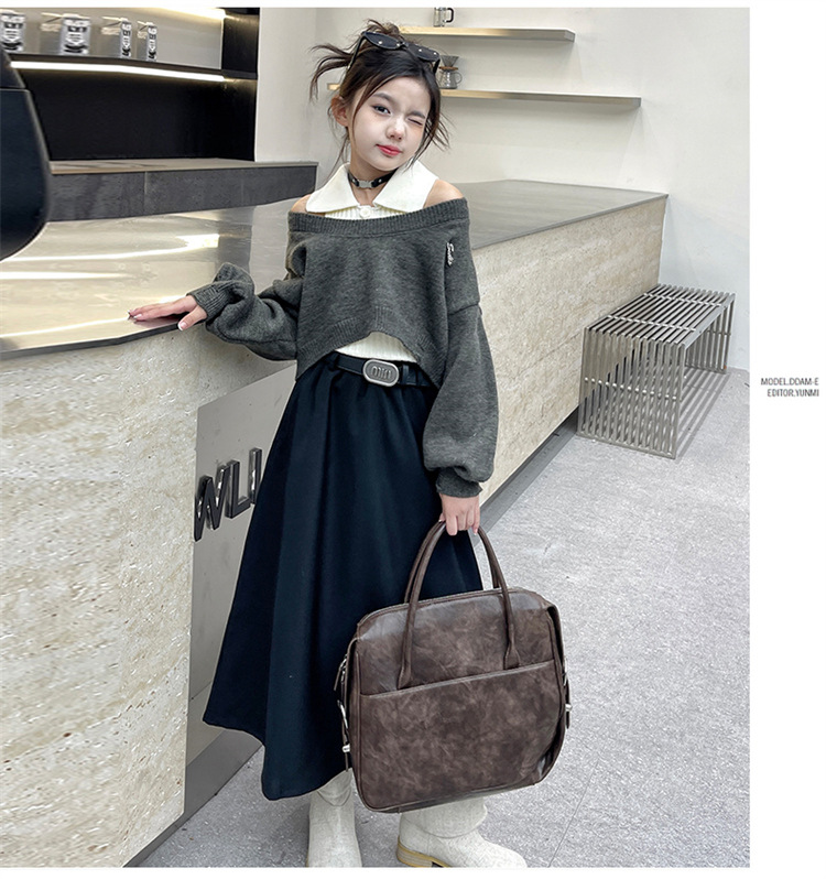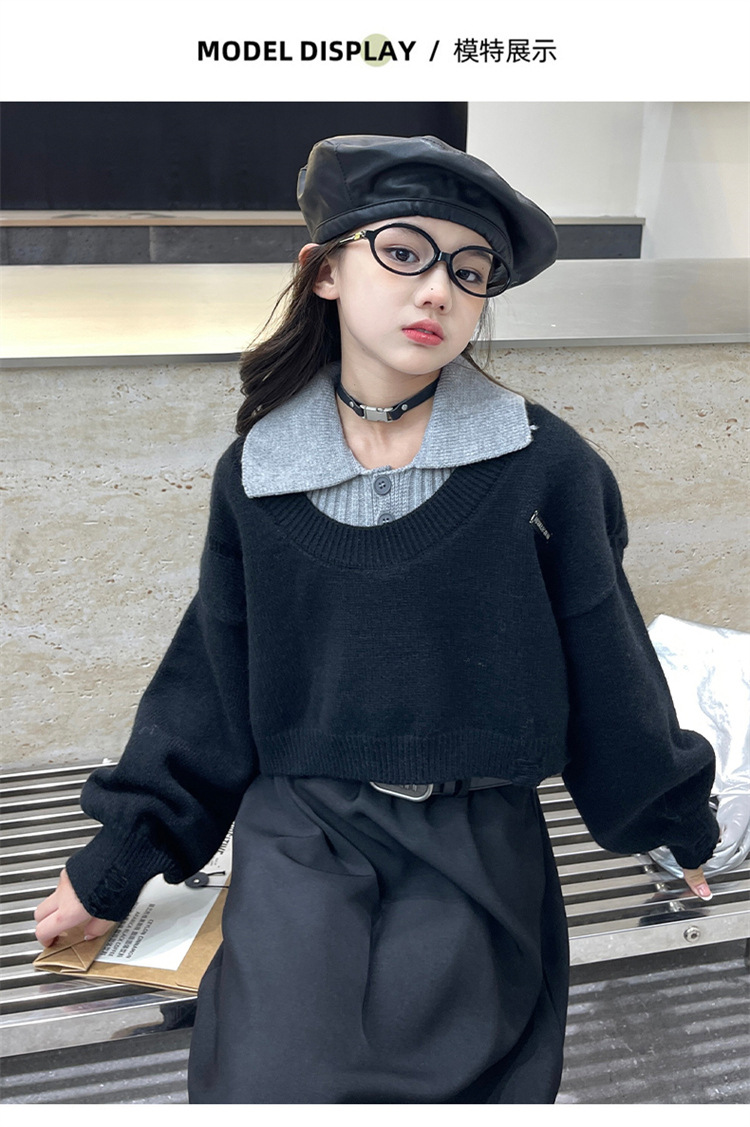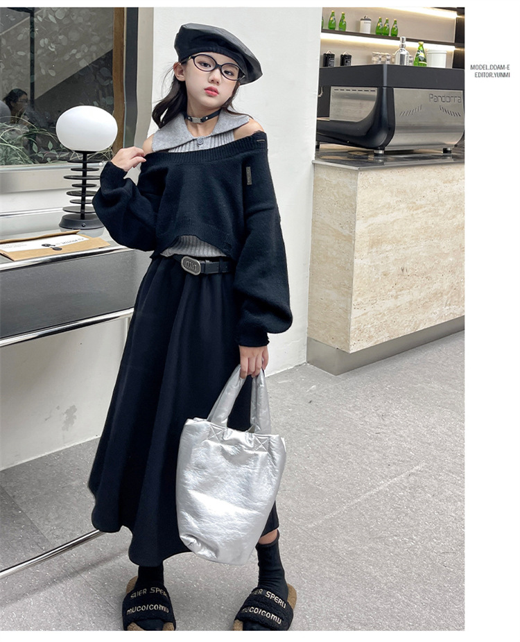 소녀 스웨터 세트 봄과 가을 새로운 니트 홀 스웨터 옷깃 재킷 반쪽 길이 원피스 투피스 아동복
