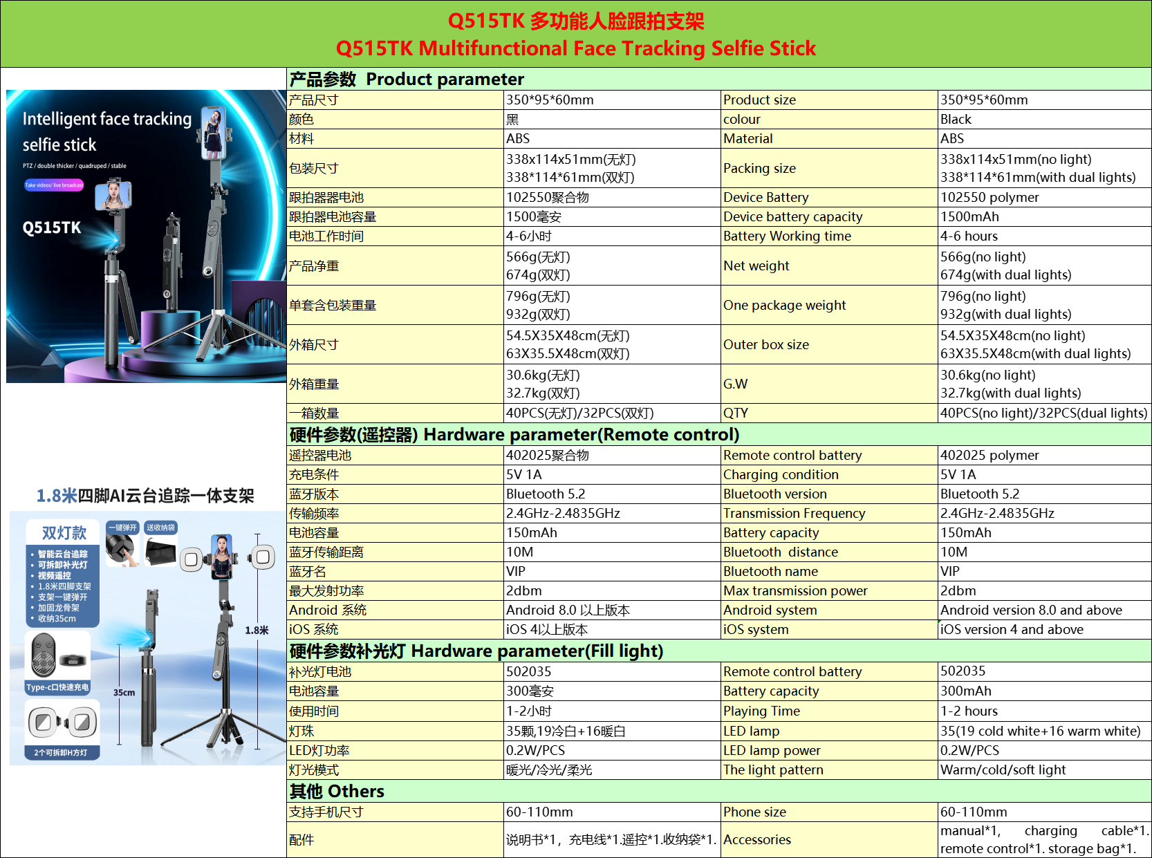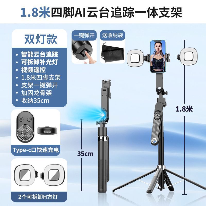 Q515TK 짐벌 AI 스마트 얼굴 추적 셀카봉 휴대폰 범용 라이브 방송 4각 스탠드 뷰티 조명