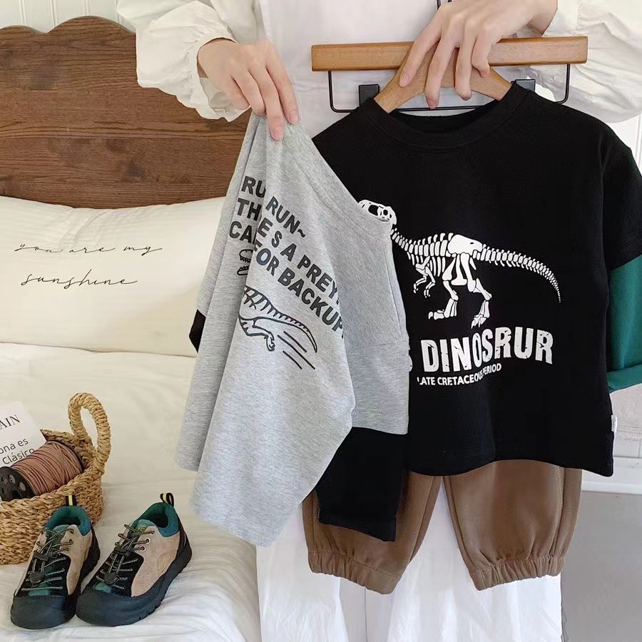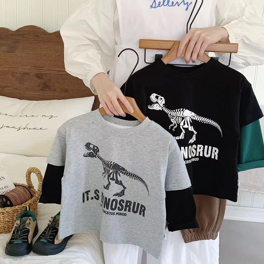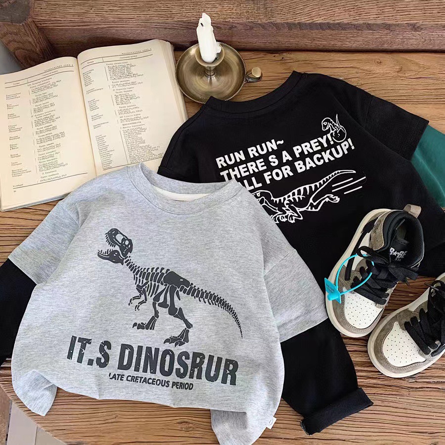 어린이 긴팔 티셔츠 2024 가을 새 어린이 가짜 투피스 면 공룡 캐주얼 루즈 탑 풀오버스토어 가기