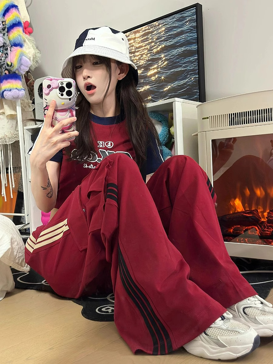 아메리칸 레트로 재즈 댄스 군중 바지 여성 높은 허리 캐주얼 세트 와이드 레그 바지 레드 3 바 스포츠 바지스토어 가기