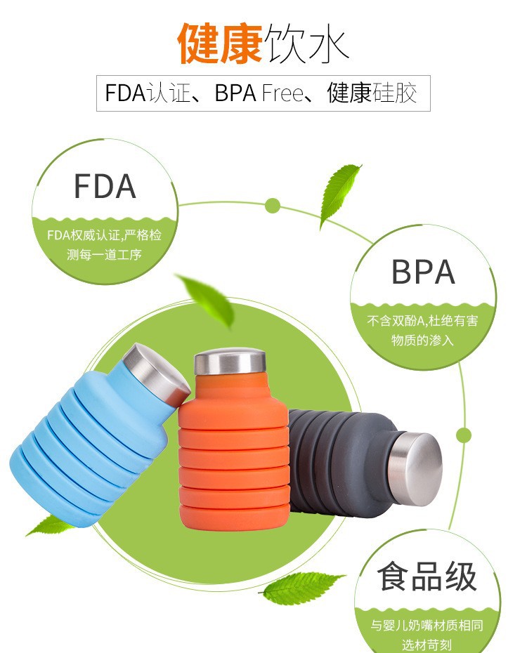 1.本款硅胶折叠运动水壶,采用食品级硅胶制作,安全无毒,已通过FDA