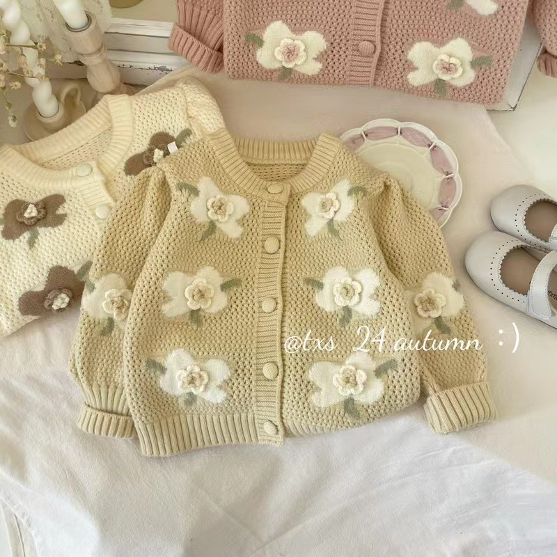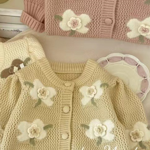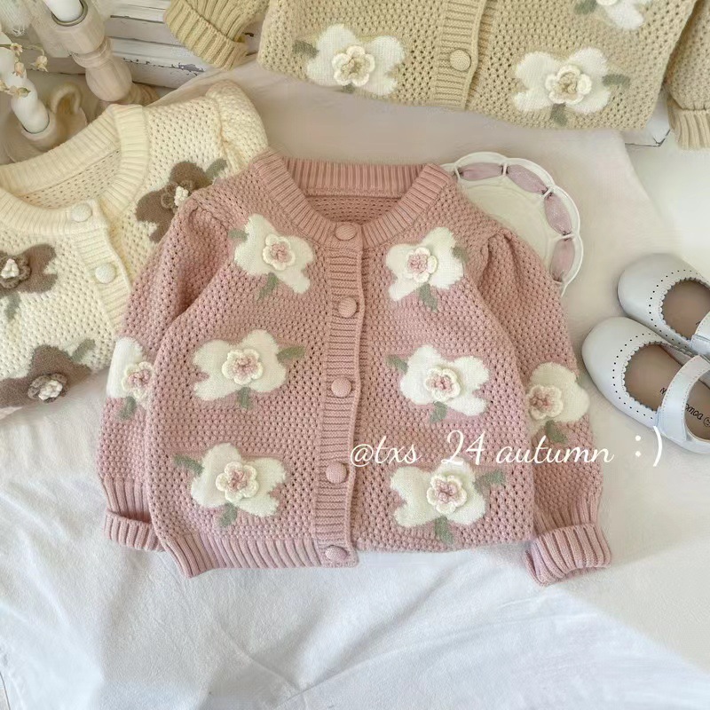 소녀 2024 새로운 스웨터 카디건 수제 꽃 유행 서양식 어린이 가을 의상 어린이 니트 자켓