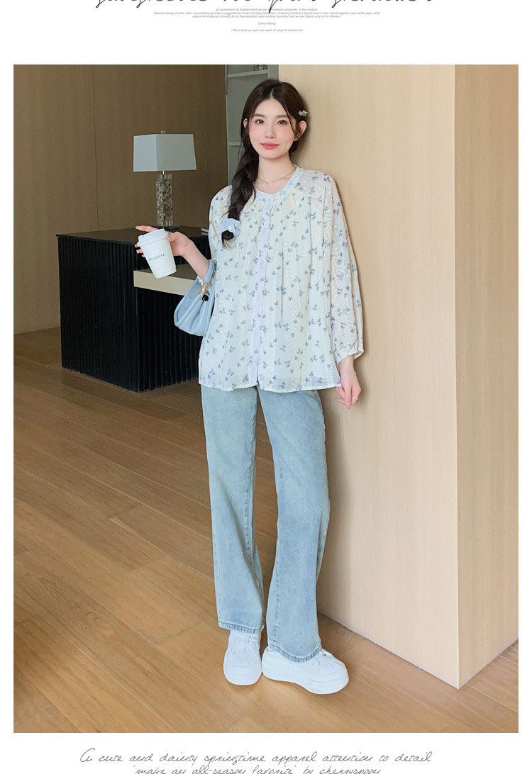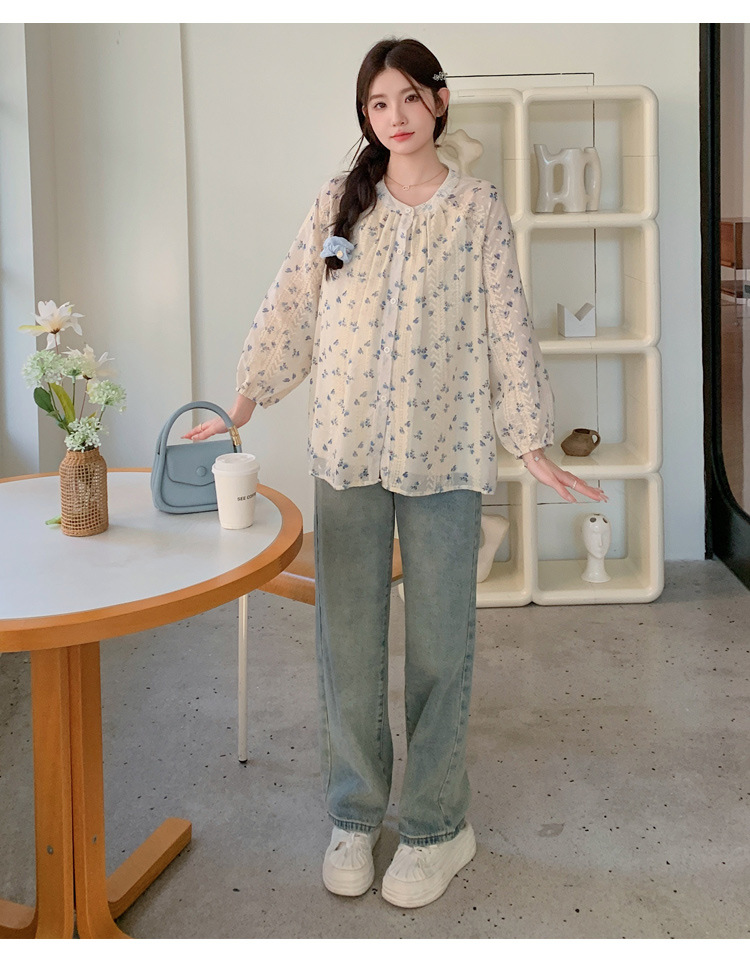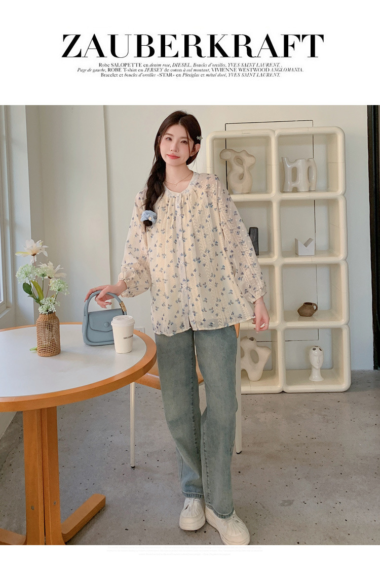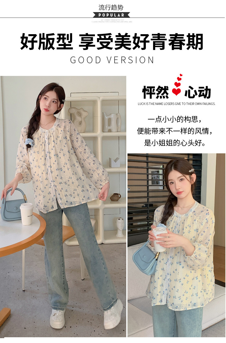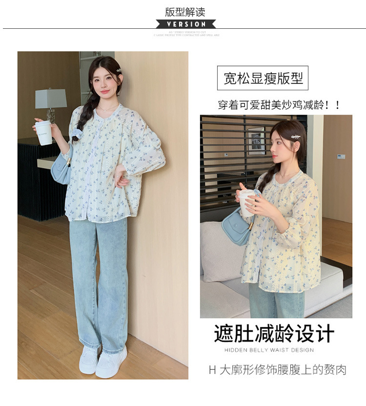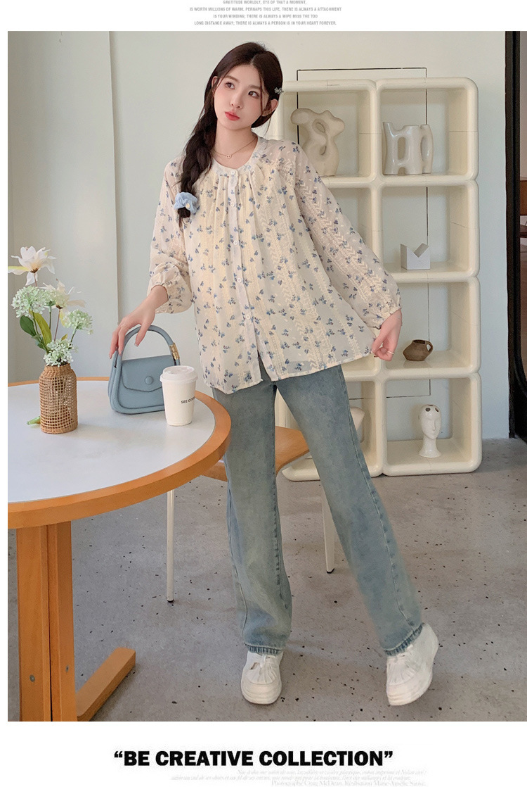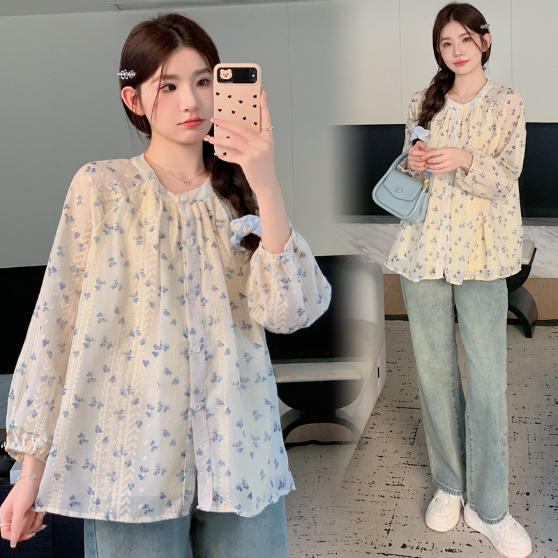 2024 년 새로운 가을과 겨울 임산부 패션 한국식 외모 슬리밍 자카드 주름 달콤한 꽃 인형 탑스토어 가기