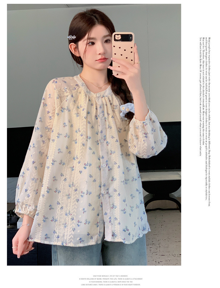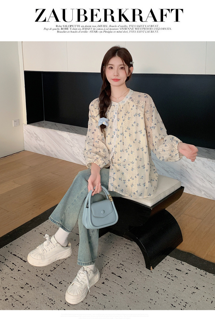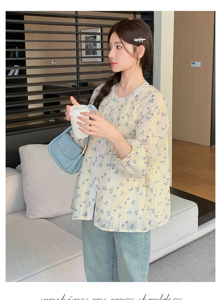2024 년 새로운 가을과 겨울 임산부 패션 한국식 외모 슬리밍 자카드 주름 달콤한 꽃 인형 탑