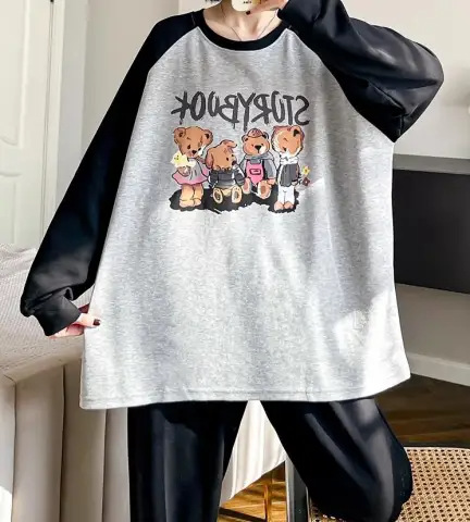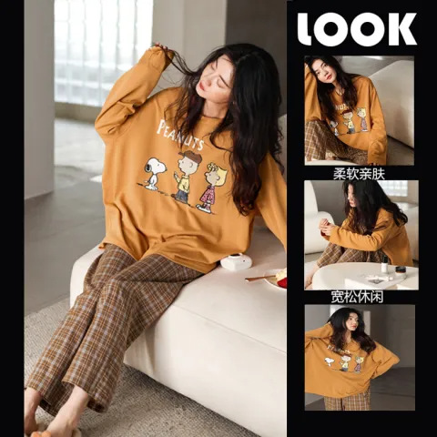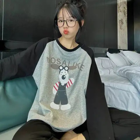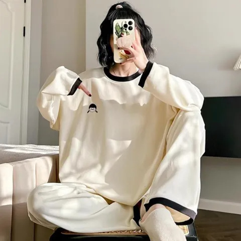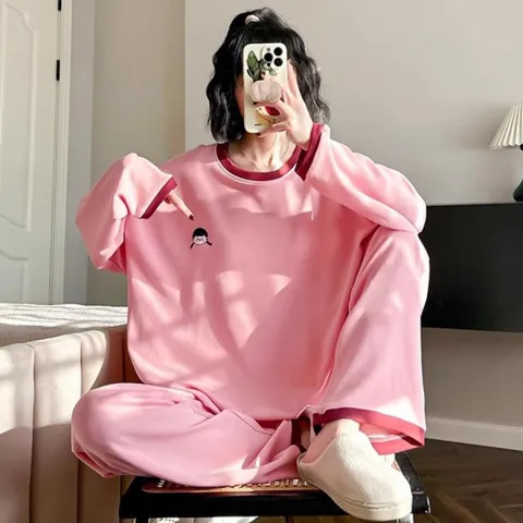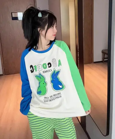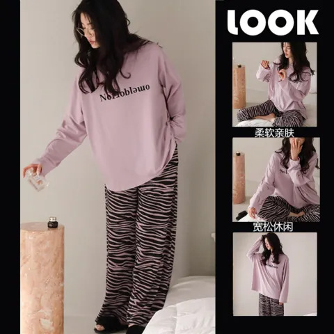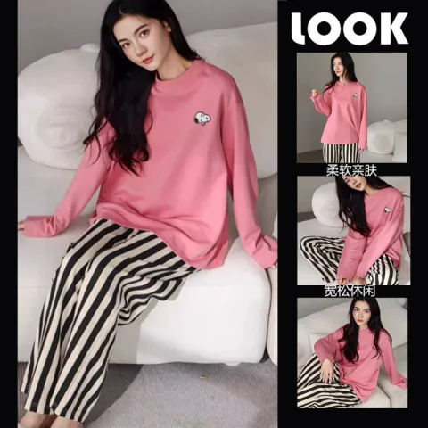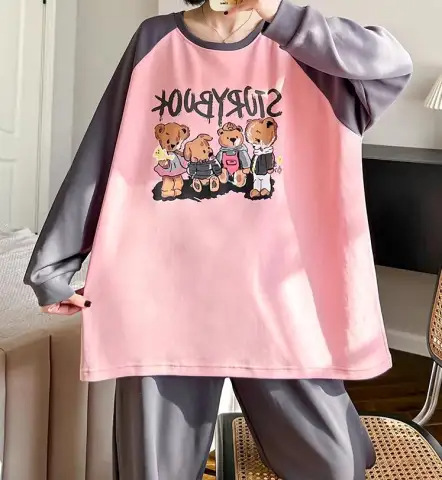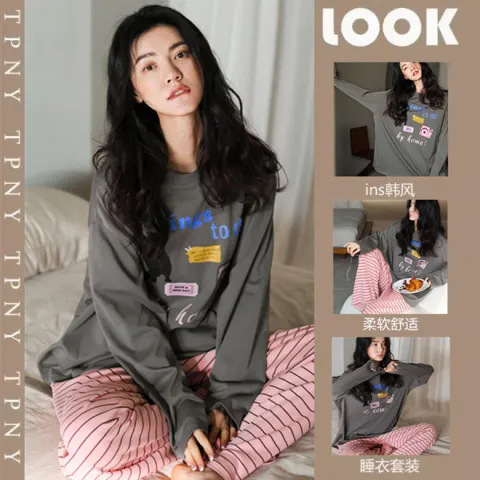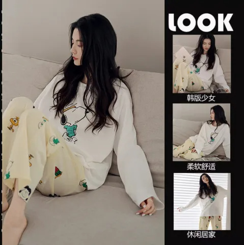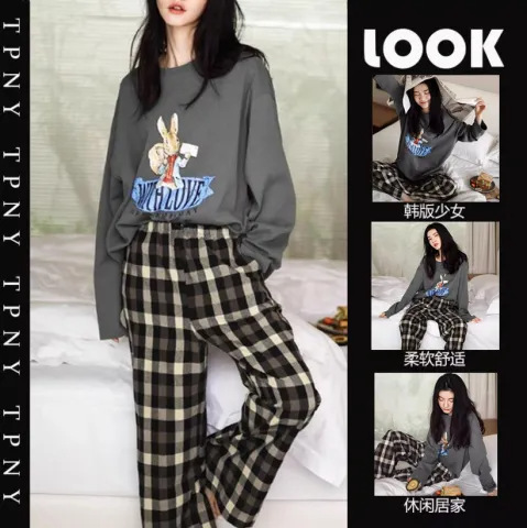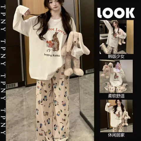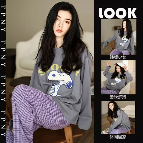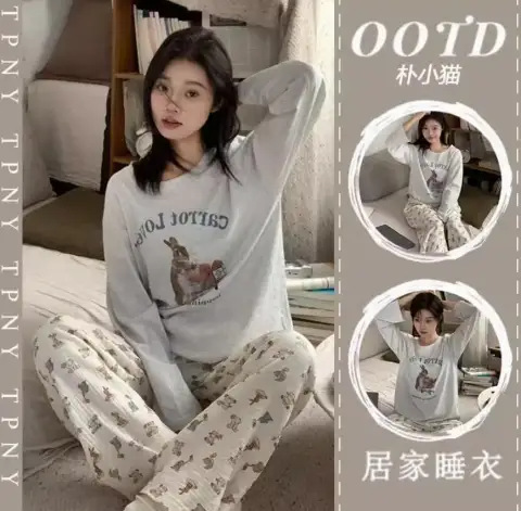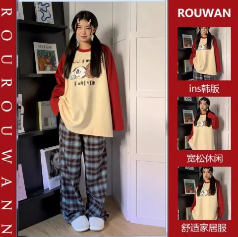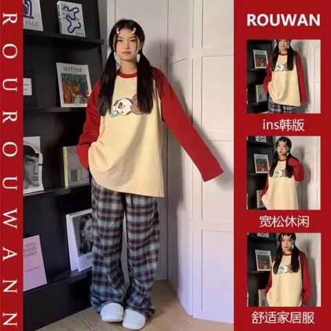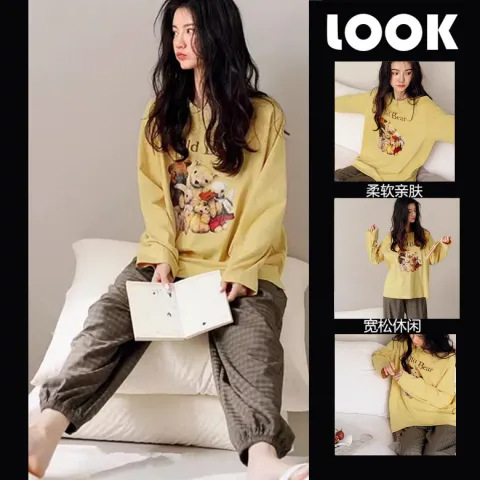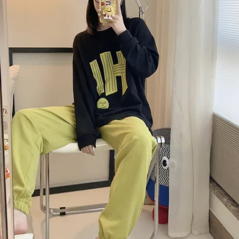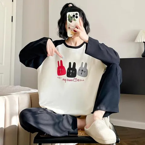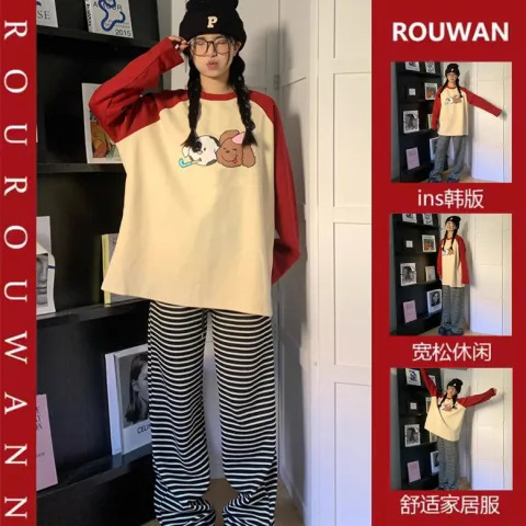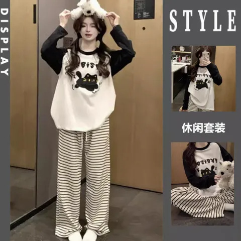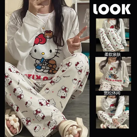 봄과 가을 잠옷 여성의 느슨한 크루 넥 귀여운 헬로 키티 홈 옷 간단한 캐주얼 긴 소매 바지 투피스 세트스토어 가기