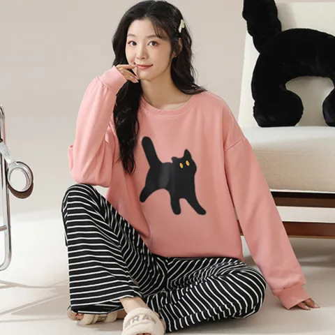 봄과 가을 잠옷 여성의 느슨한 크루 넥 귀여운 헬로 키티 홈 옷 간단한 캐주얼 긴 소매 바지 투피스 세트