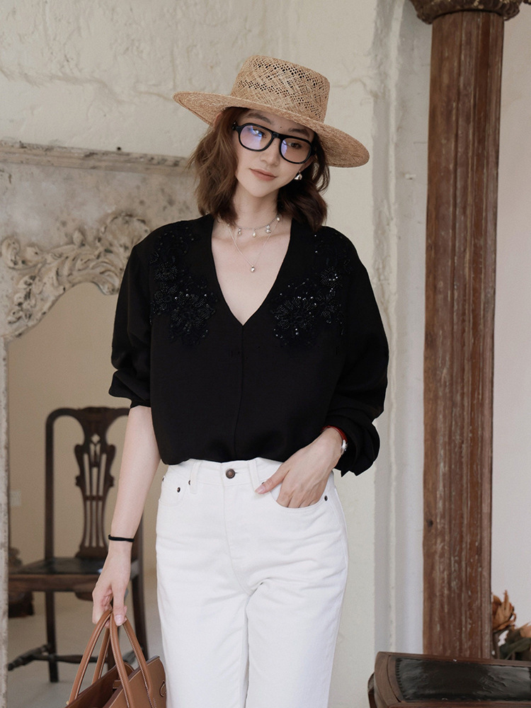V넥 자수 셔츠, 고급스러운 루즈핏, 비즈 장식과 꽃무늬, 새로운 중국풍, 화이트 여성용 긴팔 상의, 26 봄 여름 신상품스토어 가기