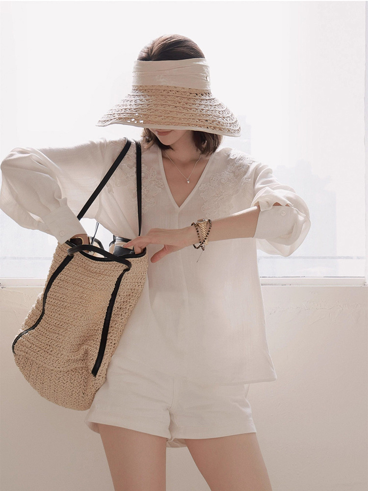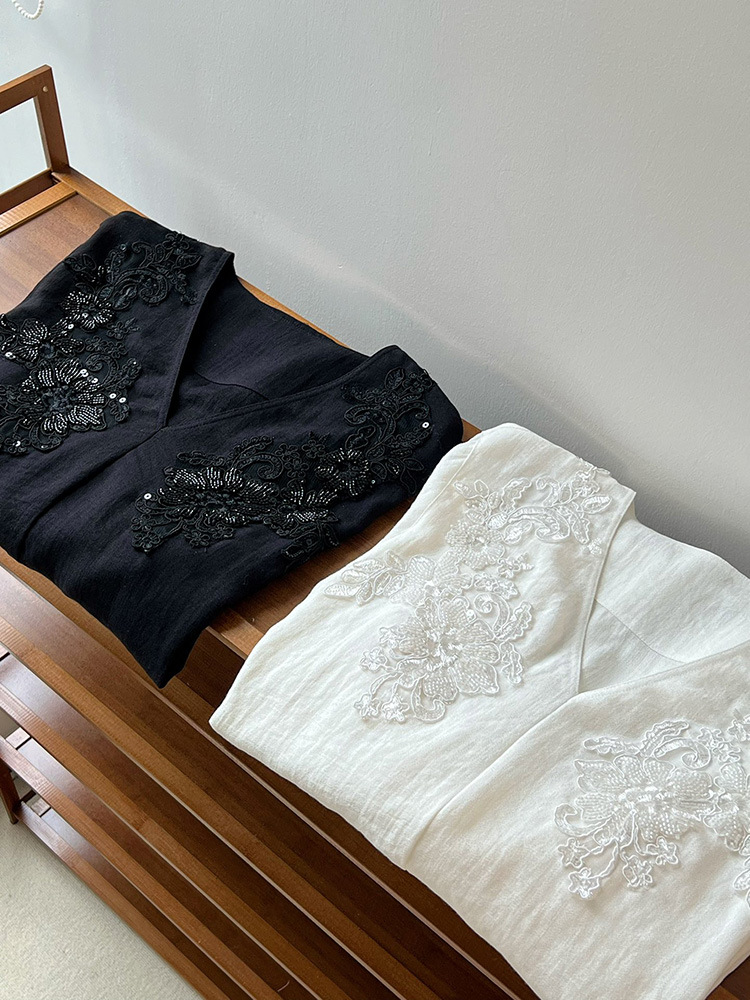 V넥 자수 셔츠, 고급스러운 루즈핏, 비즈 장식과 꽃무늬, 새로운 중국풍, 화이트 여성용 긴팔 상의, 26 봄 여름 신상품