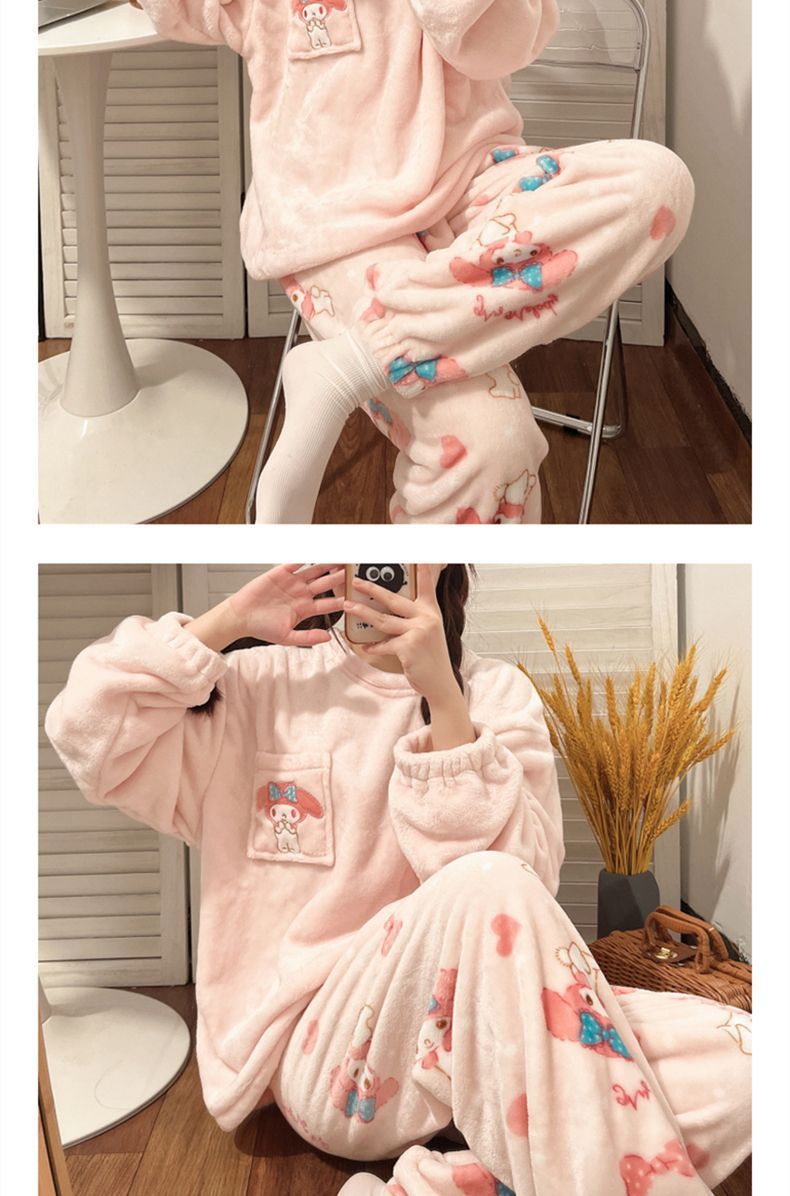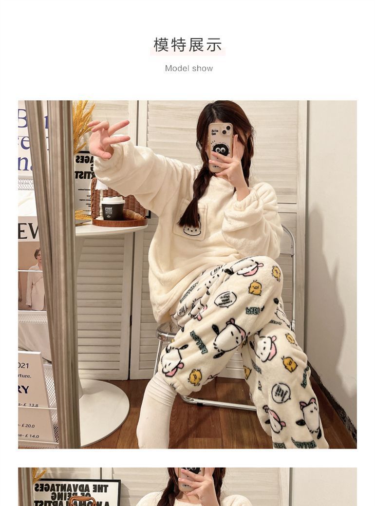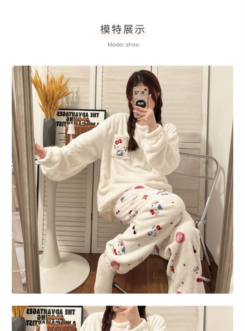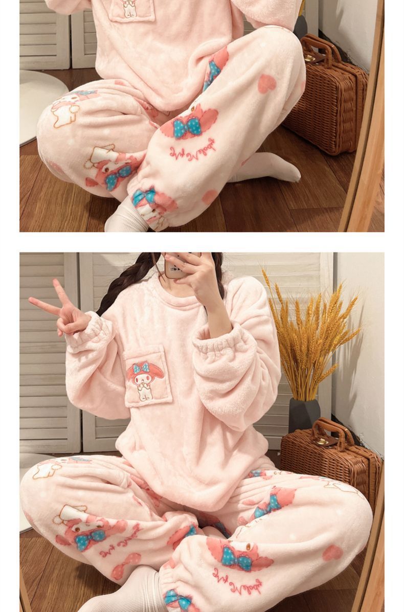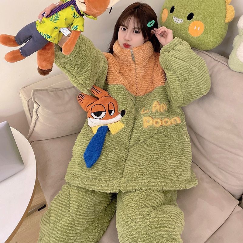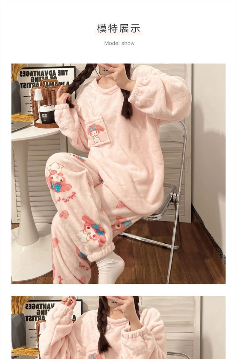 가을과 겨울 플란넬 파자마 여성 기모 두꺼운 크루 넥 산호 양털 만화 투피스 세트 홈 옷스토어 가기