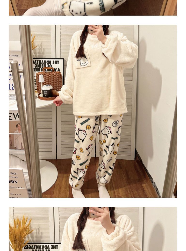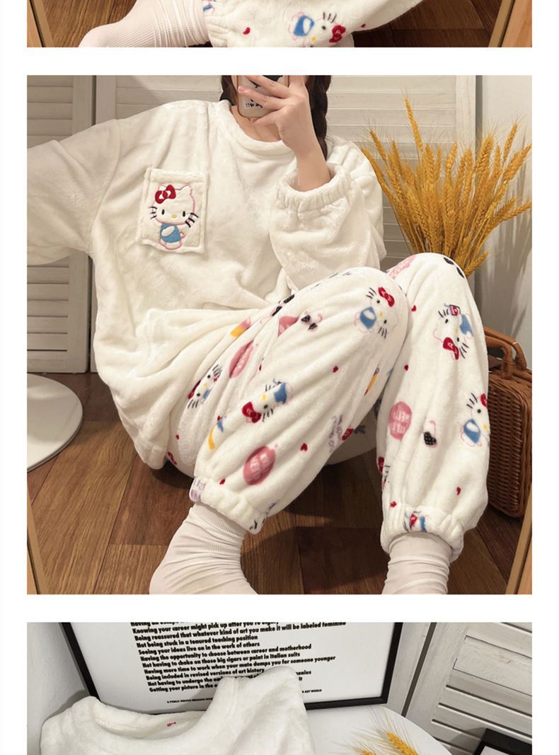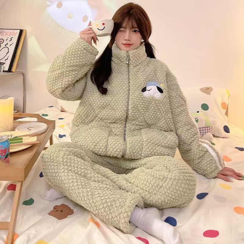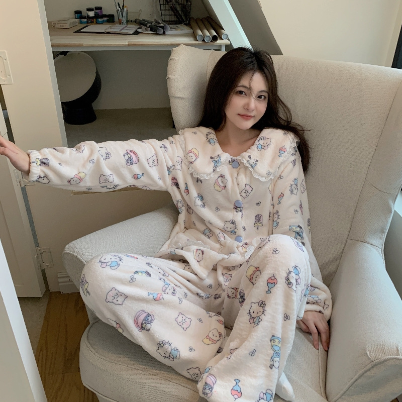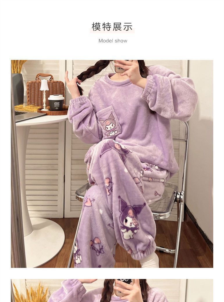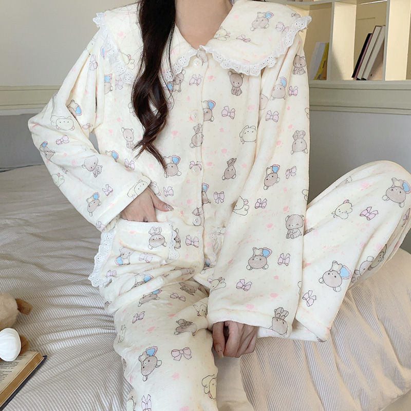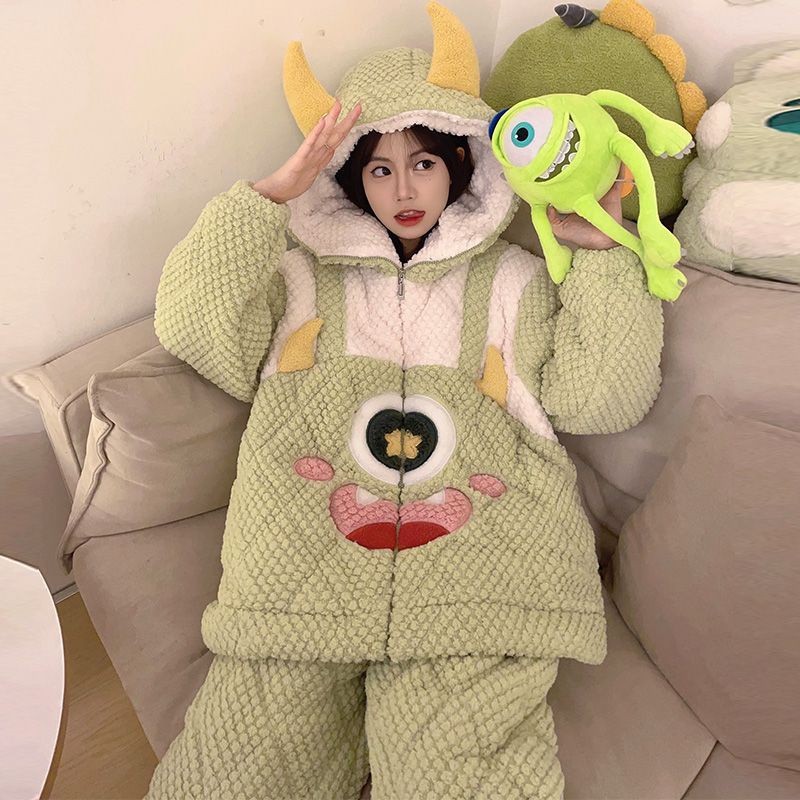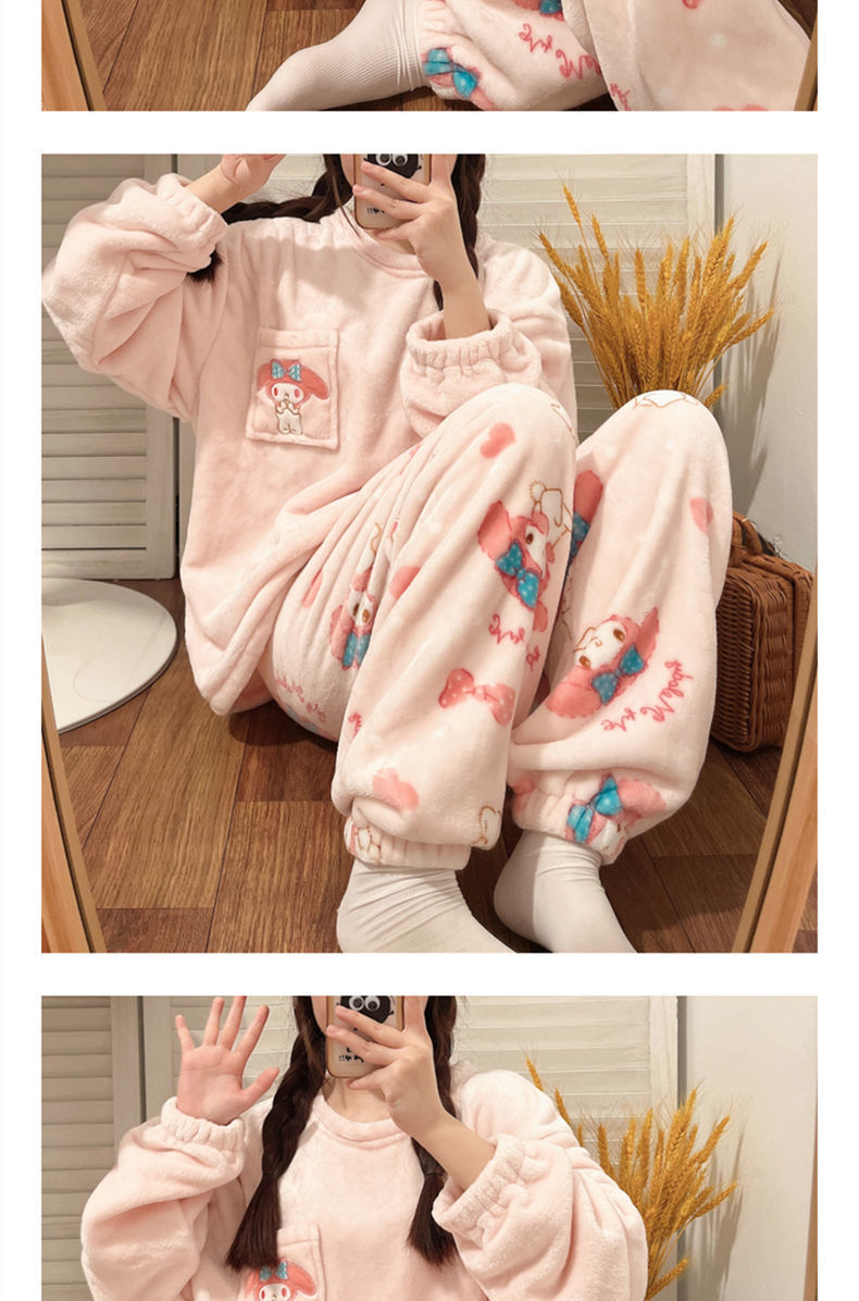 가을과 겨울 플란넬 파자마 여성 기모 두꺼운 크루 넥 산호 양털 만화 투피스 세트 홈 옷스토어 가기
