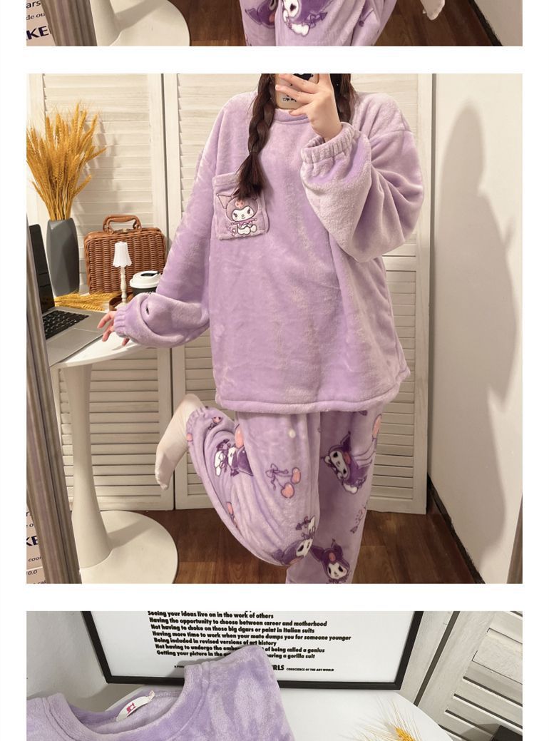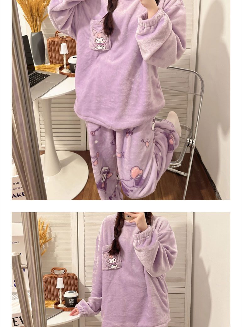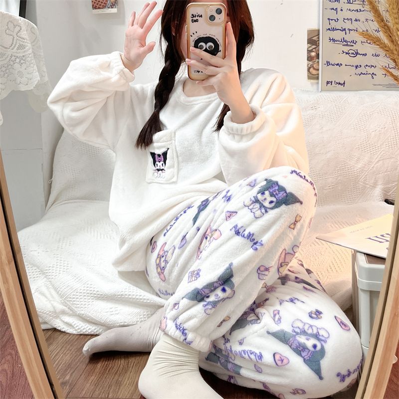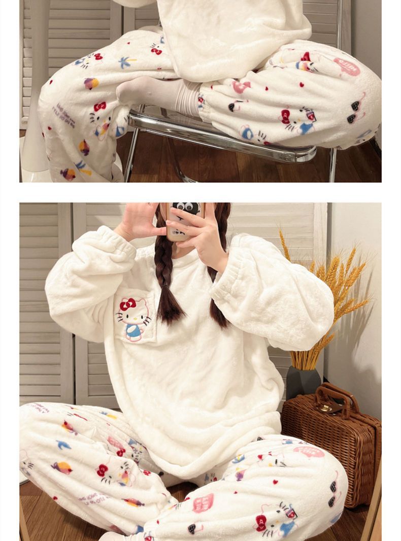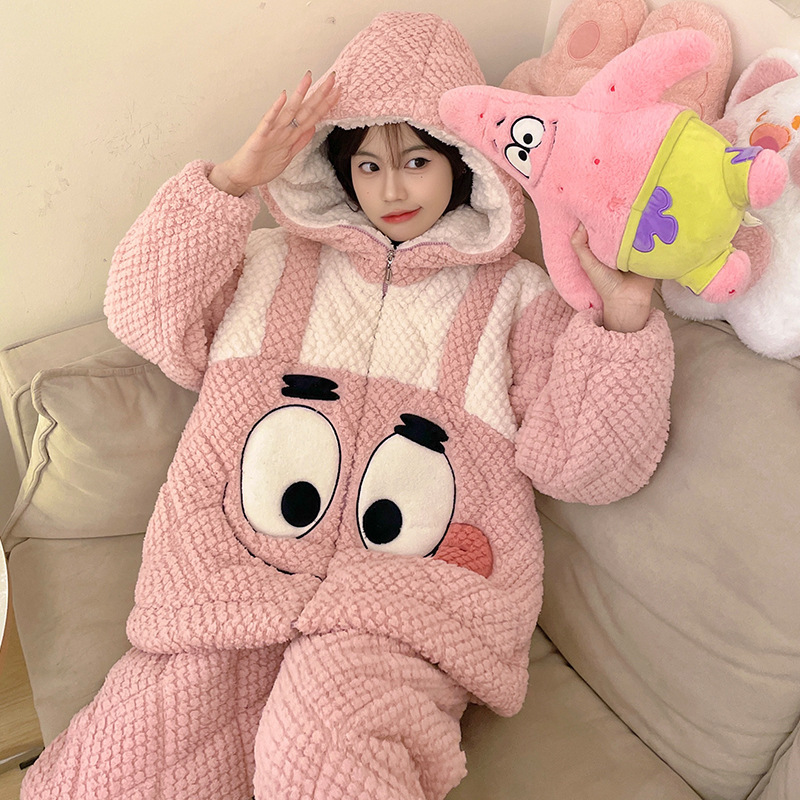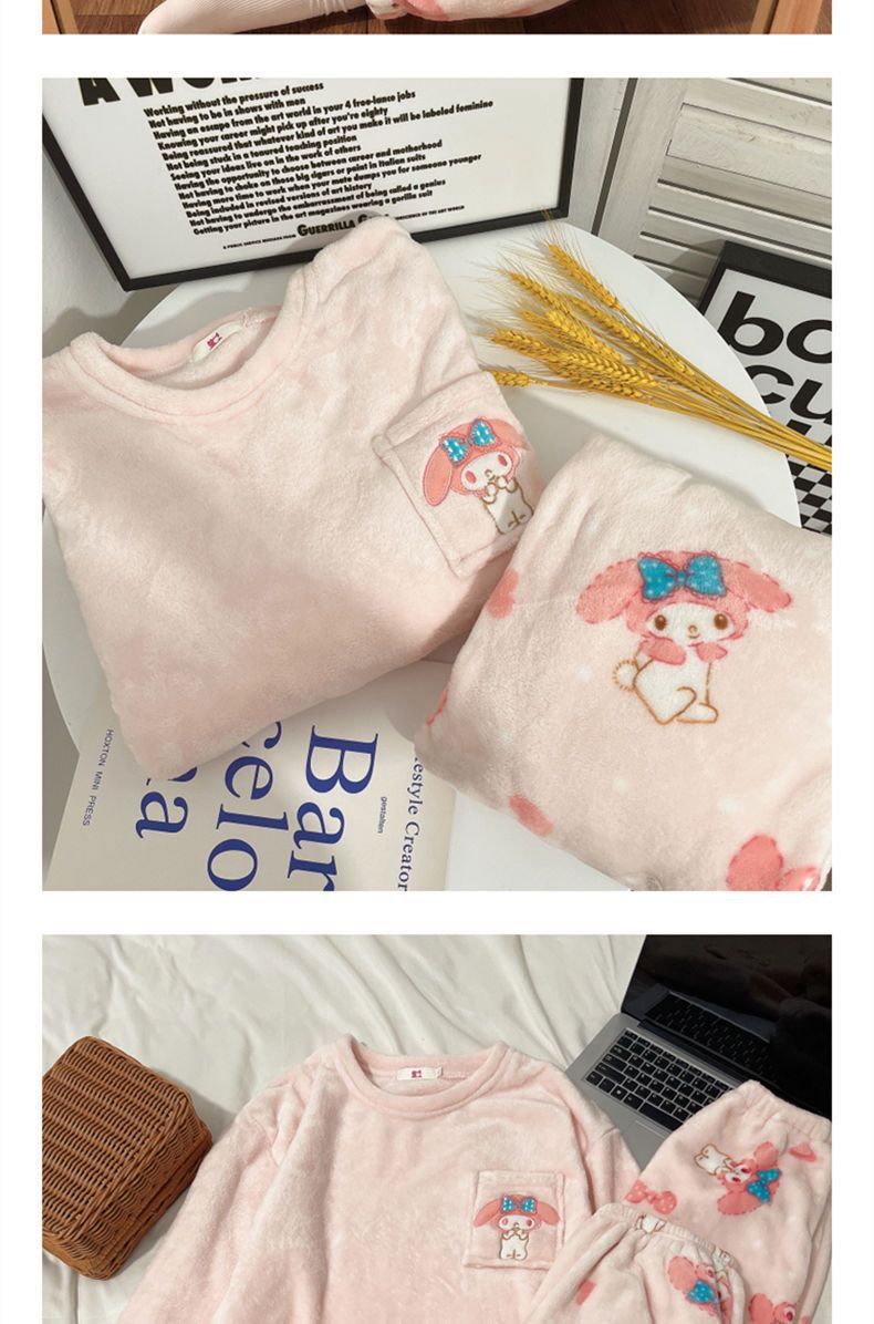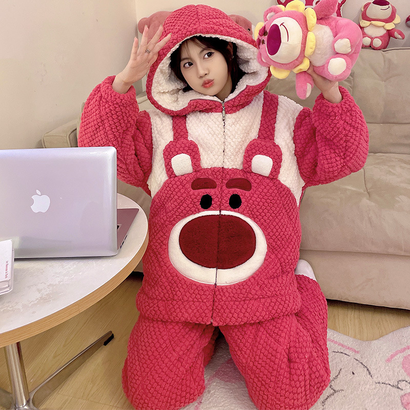 가을과 겨울 플란넬 파자마 여성 기모 두꺼운 크루 넥 산호 양털 만화 투피스 세트 홈 옷스토어 가기