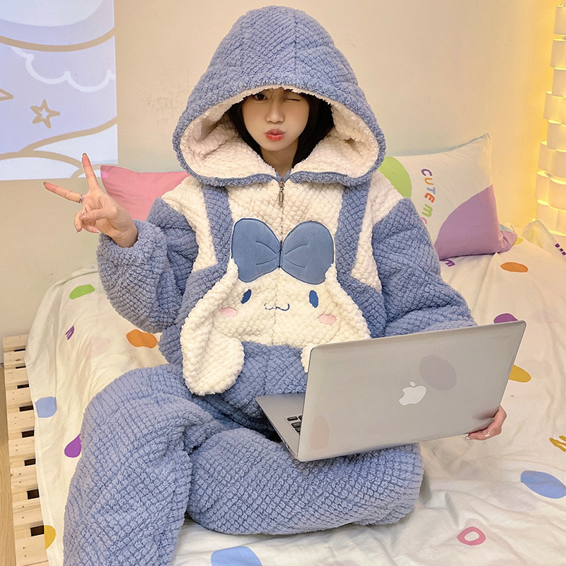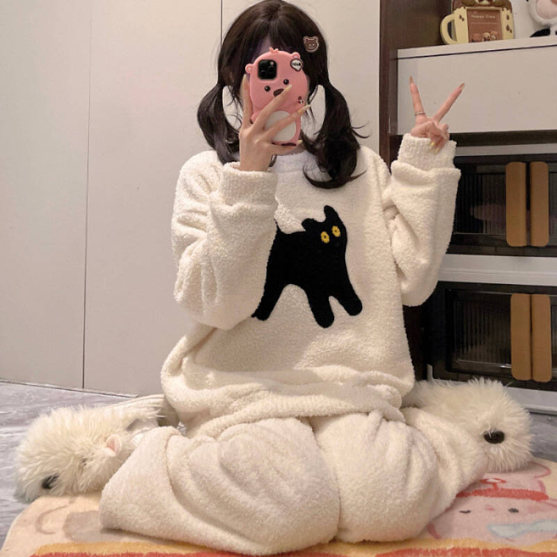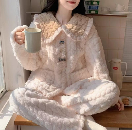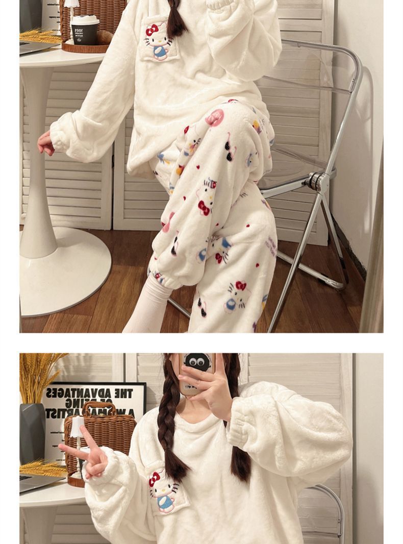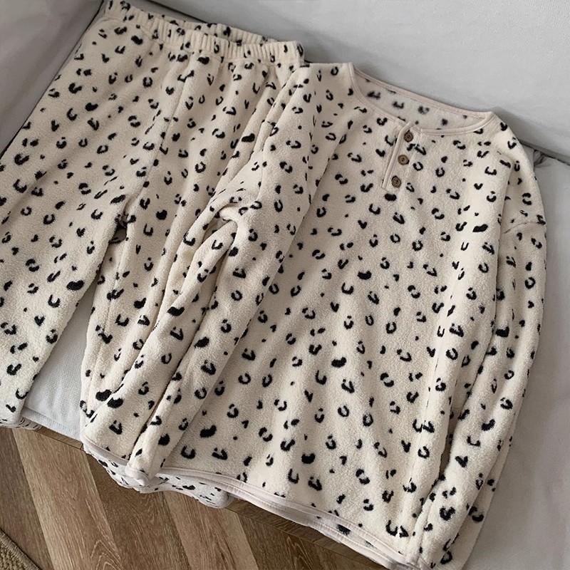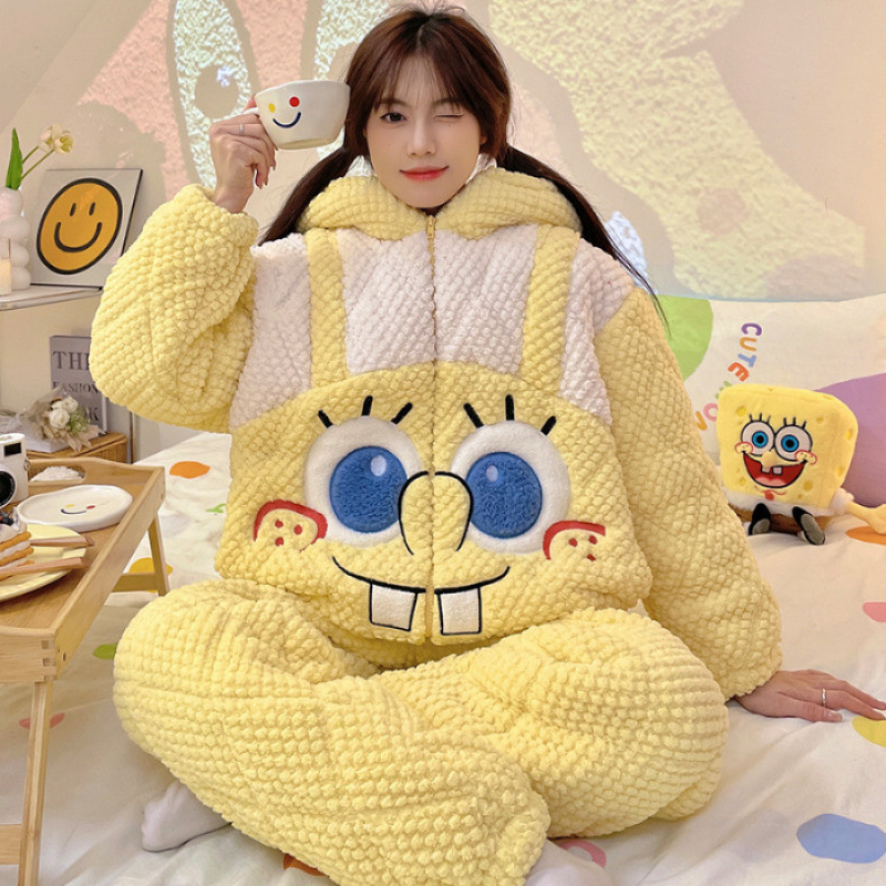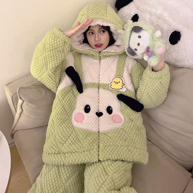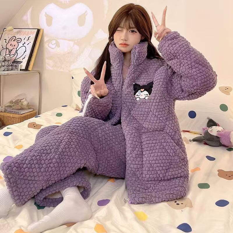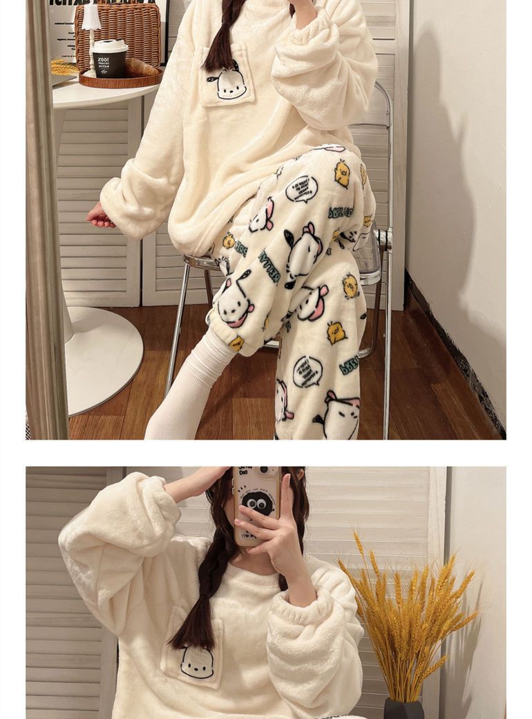 가을과 겨울 플란넬 파자마 여성 기모 두꺼운 크루 넥 산호 양털 만화 투피스 세트 홈 옷스토어 가기