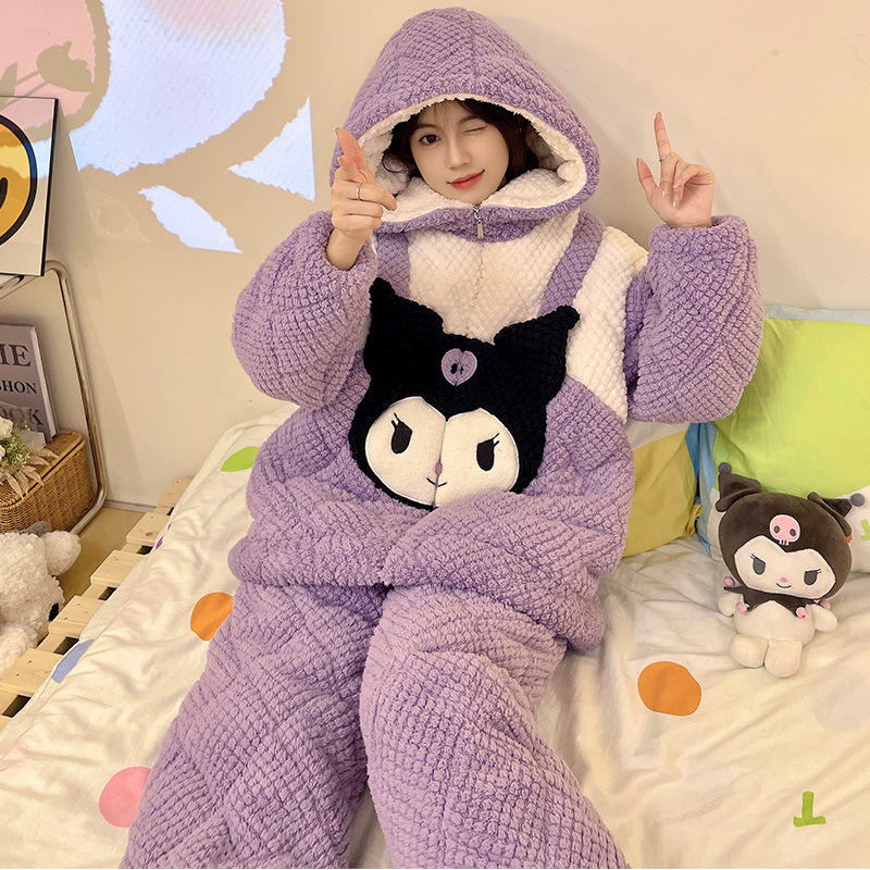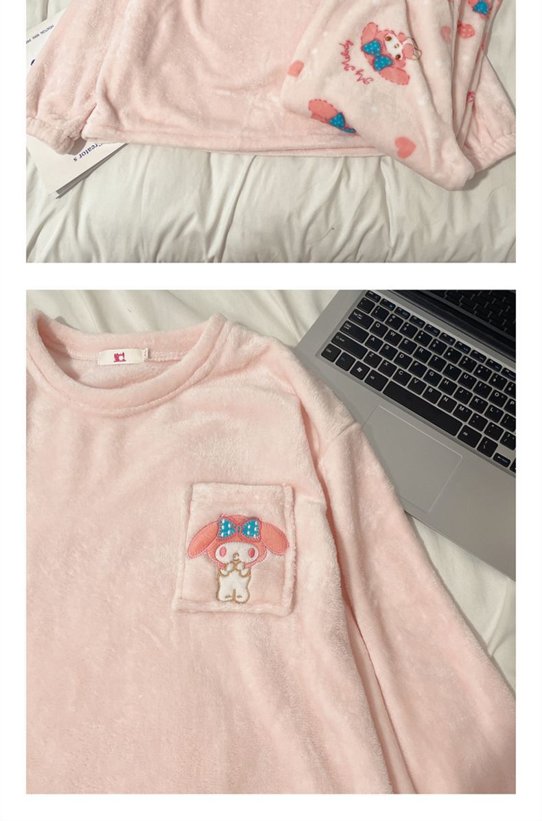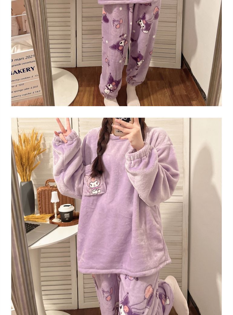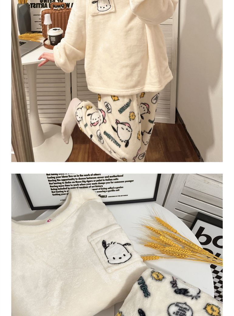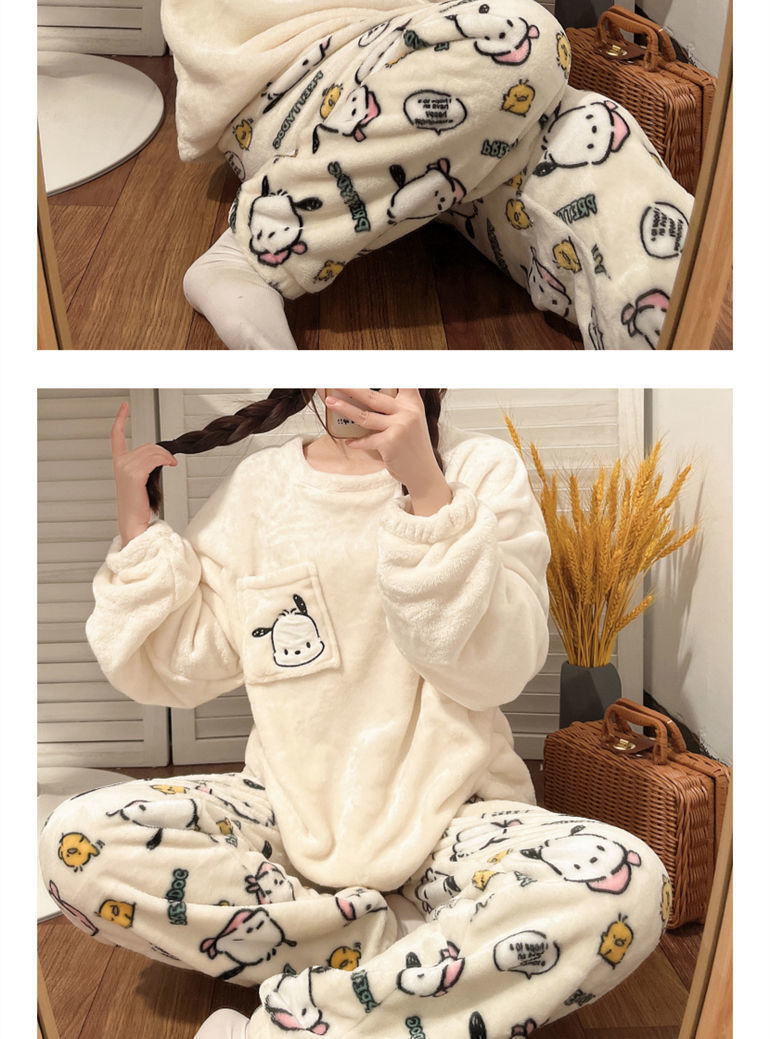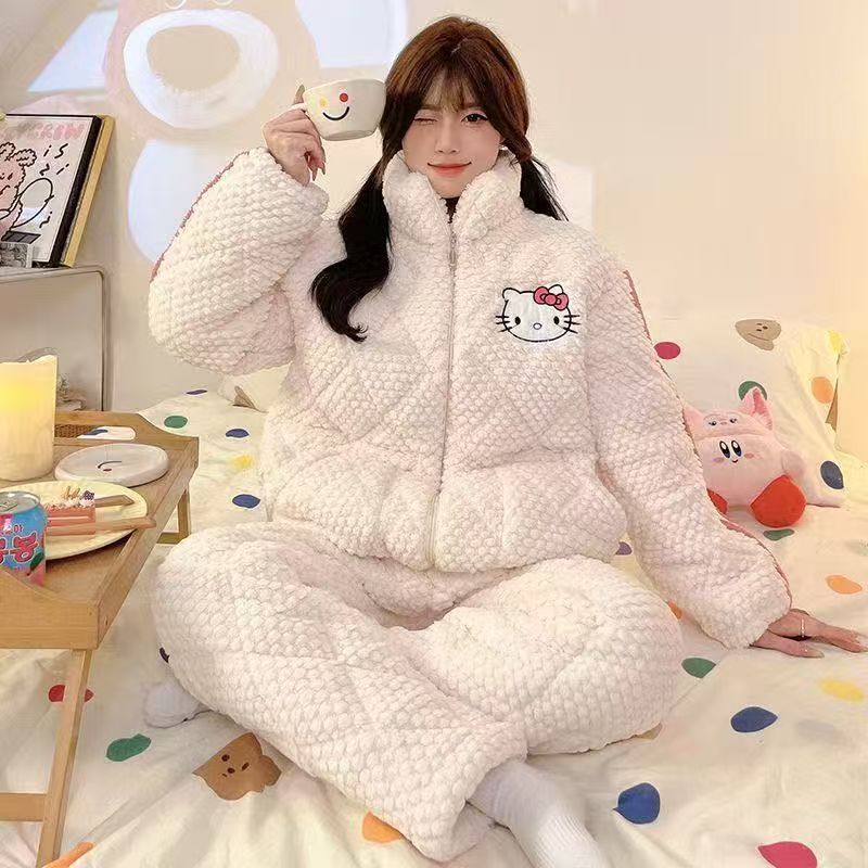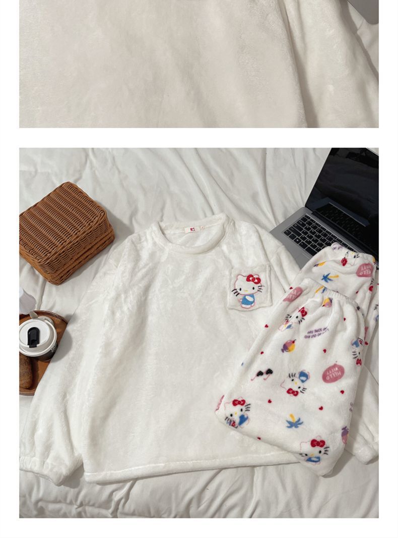 가을과 겨울 플란넬 파자마 여성 기모 두꺼운 크루 넥 산호 양털 만화 투피스 세트 홈 옷스토어 가기
