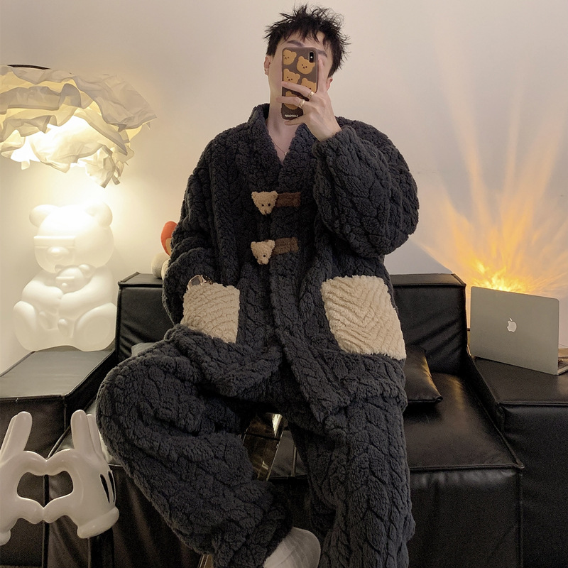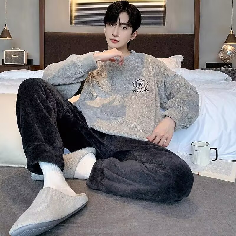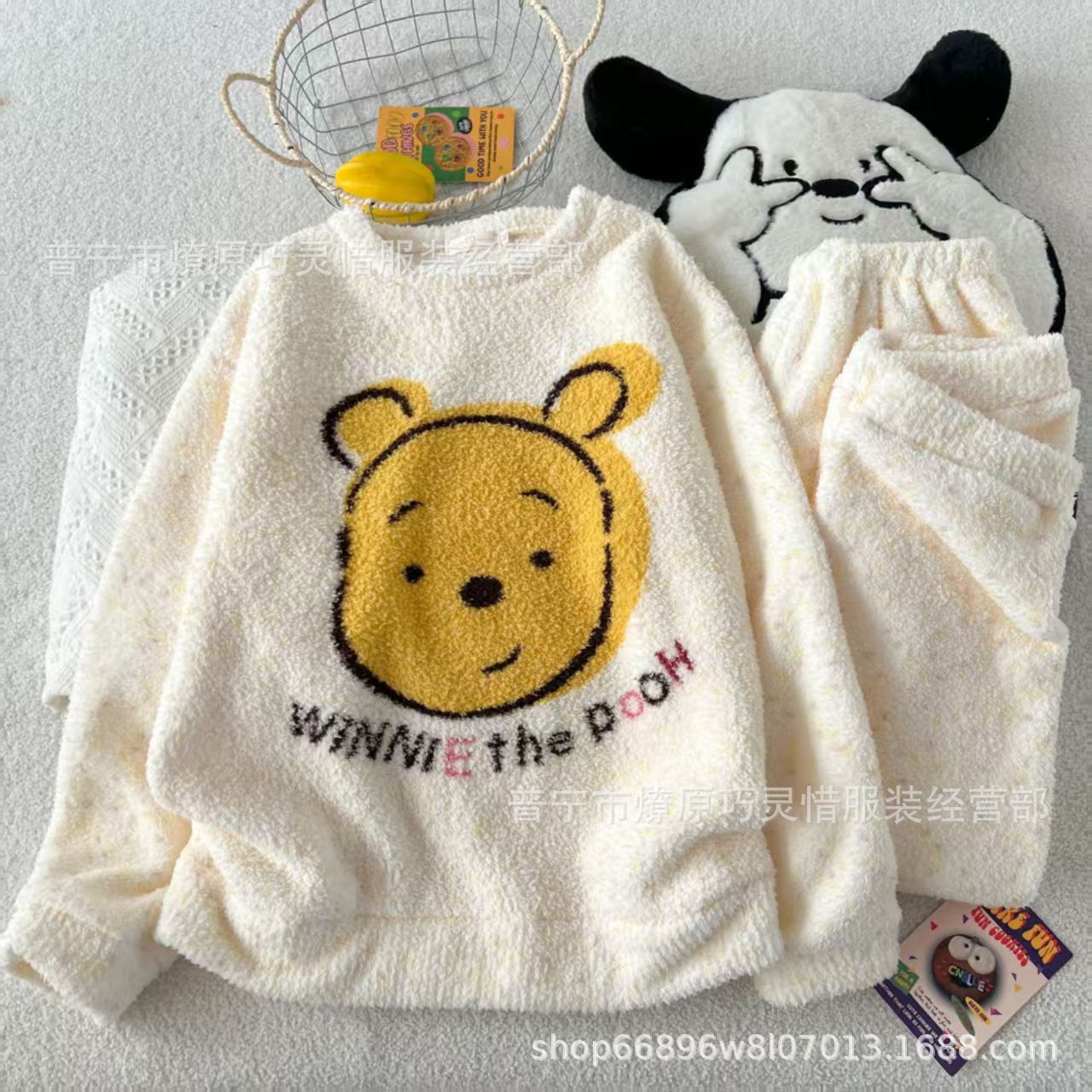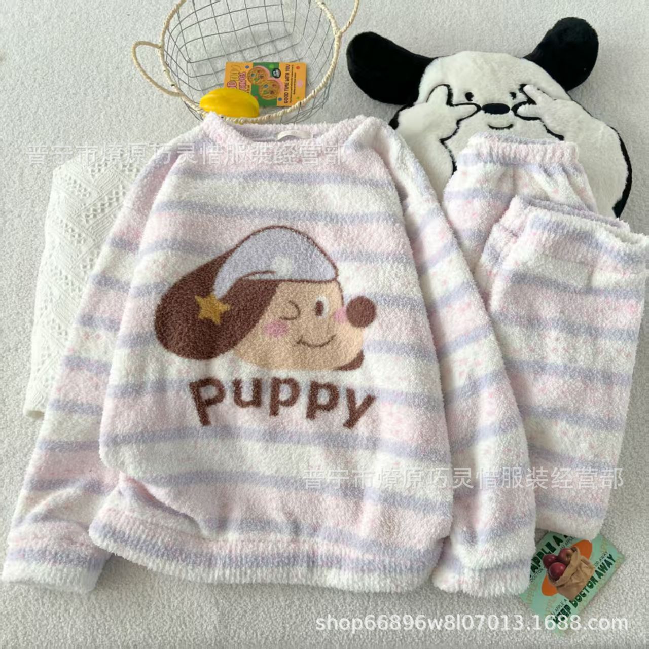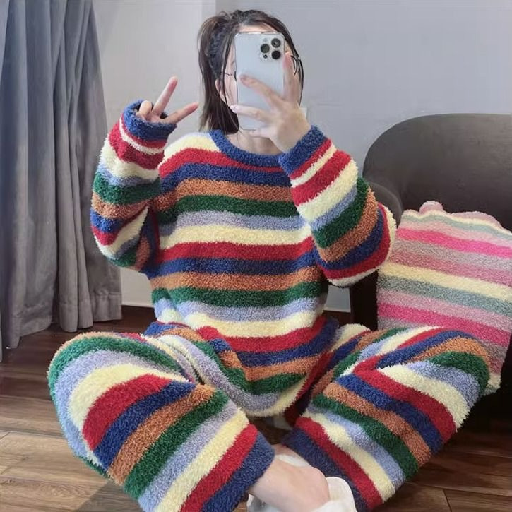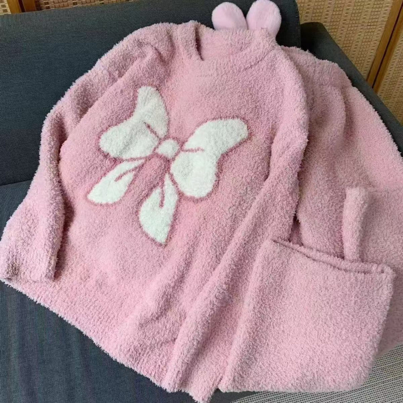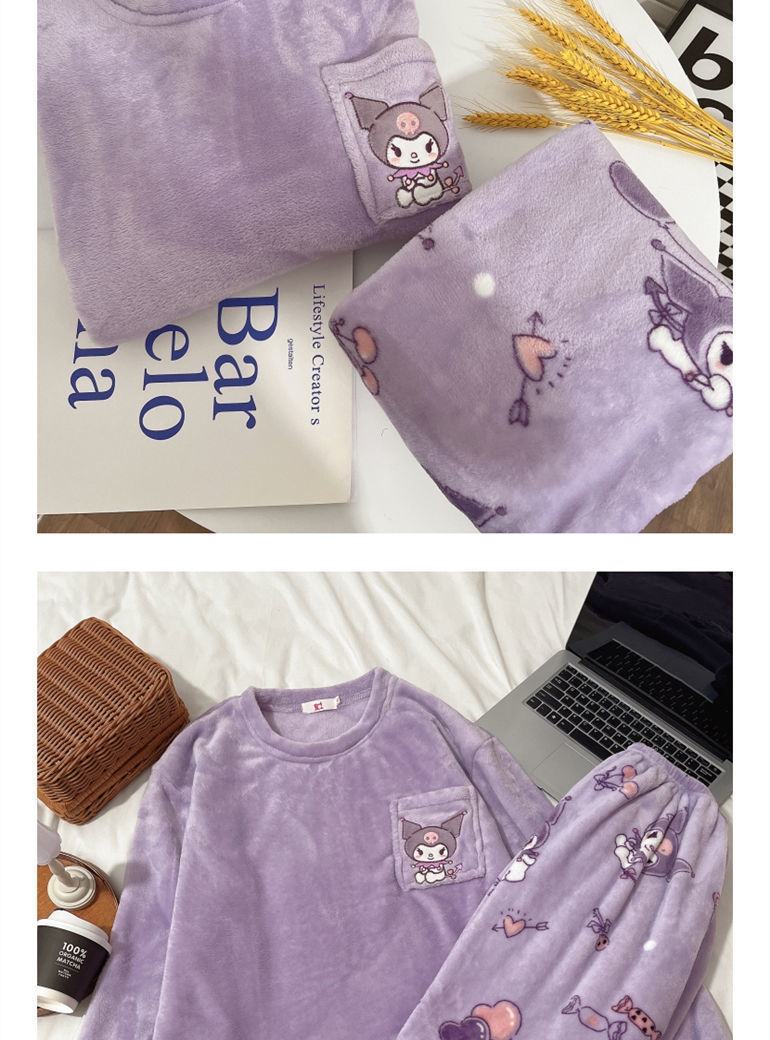가을과 겨울 플란넬 파자마 여성 기모 두꺼운 크루 넥 산호 양털 만화 투피스 세트 홈 옷스토어 가기